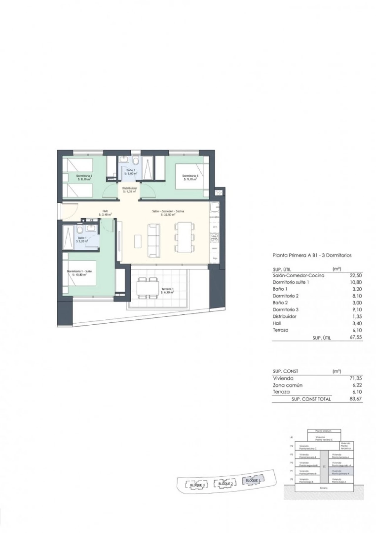 NEW BUILD RESIDENTIAL COMPLEX WITH THE SEAVIEWS IN GUARDAMAR DEL SEGURA New Build residencial complex consists of 3 blocks of flats and penthouses, each offering 9 units of 3 or 4 bedrooms with communal swimming pool and sea views in Guardamar del Segura. The buildings are designed to offer beautiful views of the Mediterranean Sea and make the most of the climate and natural light. Complex with a communal swimming pool and green areas as well as a gymnasium to ensure a unique experience for you and your family. Optional parking space and storage room are available at an extra cost. Each home features 3 or 4 bedrooms and 2 or 3 bathrooms, open concept living areas with integrated kitchens, as well as spacious terraces. The ground floor properties offer optional private swimming pool, and the penthouses have large windows with the best views of the coast, large terraces and solarium where you can have a private swimming pool, kitchen or jacuzzi. Complex located just 5 minutes from the beaches of Guardamar del Segura, in a residential area surrounded by parks and nature. All the services and amenities of the town centre will be just a few steps away from your new home. Guardamar del Segura is a town located on the Costa Blanca South. With its 11 kilometers of natural beach and its large pine forest. Guardamar is a quiet town to live in, it has all the services throughout the year such as restaurants, bars, shops, banks, places for leisure, etc. Every Wednesday, in the central streets of the town, a market is organized where many people go to buy products such as food, clothing, furniture, animals, etc. It is a great claim and inhabitants of the surrounding town come to Guardamar every Wednesday to visit the market. Guardamar del Segura has a large port with activities throughout the year, it has a large sports centre with paddle tennis, tennis, soccer and a large heated swimming pool that works all year round. It also has a library where there is free wifi and computers. Guardamar del Segura is only 20km away from the Alicante - Elche (El Altet) airport, where there are many flights every day with connections to the main European cities, due to the demand for tourists on the Costa Blanca.