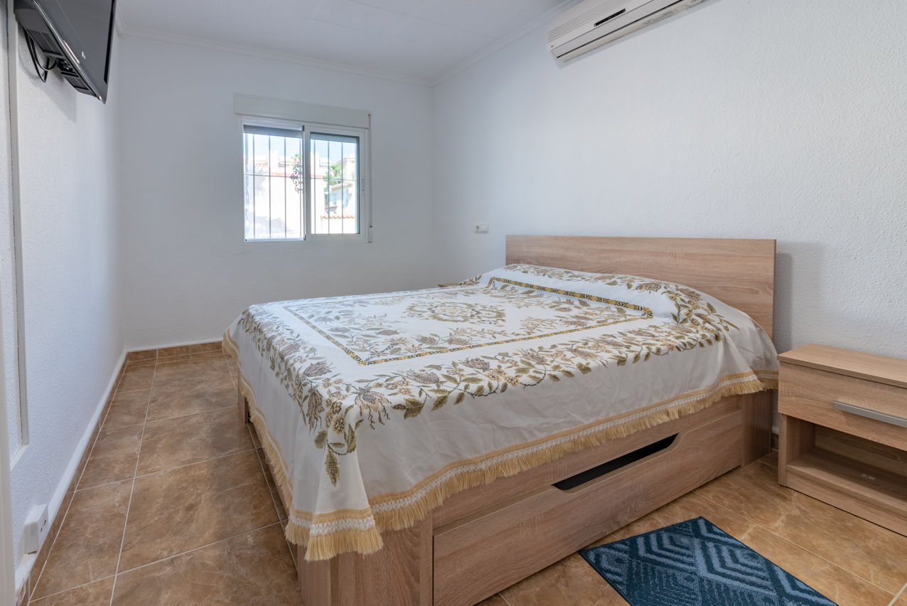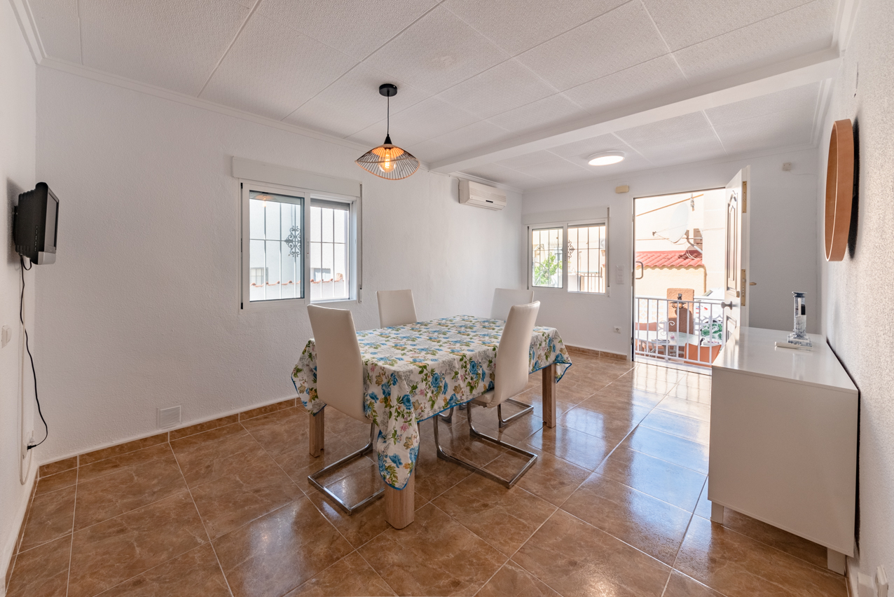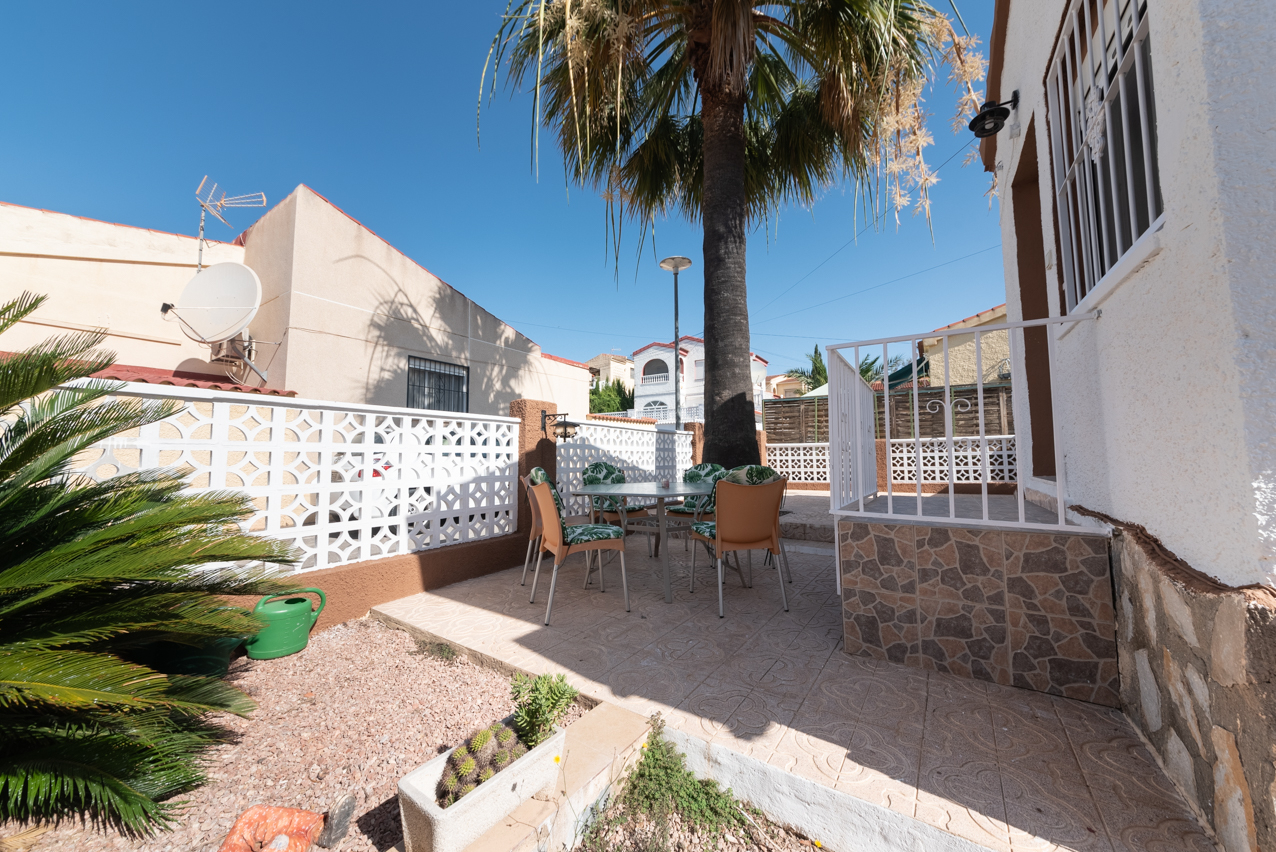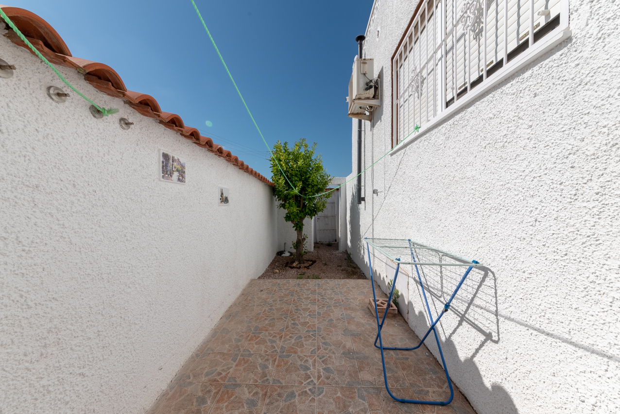 Detached Villa Close to All Amenities in Urb La Marina We introduce to you this extended detached villa, a model “Rosa” which is located in a cul-de-sac in a quiet yet central area of urbanisation La Marina close to all amenities which are only a few minutes walk away including supermarkets, shops, veterinary surgeons, hairdressers, banks and a great selection of bars and restaurants to suit all tastes. The garden is a good size measuring 207m2 which is paved and gravelled for low maintenance offering off road parking and offers shaded and sunny areas to relax and enjoy the sunny climate here on the Costa Blanca. Easy Living with everything on one level The property having been extended comprises a dining room leading to a fully fitted open plan kitchen, two bedrooms, a renovated bathroom with wall to wall shower and modern suspended vanity unit complete with LED mirror. The kitchen leads to a living room with pellet burner and from this room there is a door leading to the garden as well as interior access to a roof top solarium with beautiful views of the green area and to the neighbouring town Guardamar del Segura. This “Rosa” also has a store room to the rear of the driveway. The property makes for easy living as it is all on one level. We find this property in good condition offering many extras such as: aluminium windows, storage facilities, air conditioning in the main living space, security grills etc and is being offered fully furnished. The golden beach of La Marina Village is easily reached by car only 5 minutes away and a local seasonal bus service runs throughout the urbanisation to the beach during the summer months. The urbanisation is only 25 minutes drive to Alicante airport so it is very handy for those catching flights or collecting visiting family and friends. Contact Our Real Estate Agency in La Marina We are only a phone call, whatsapp or email away! Our friendly staff will help you find your dream home and answer any questions you may have about this property or any of our other listings.