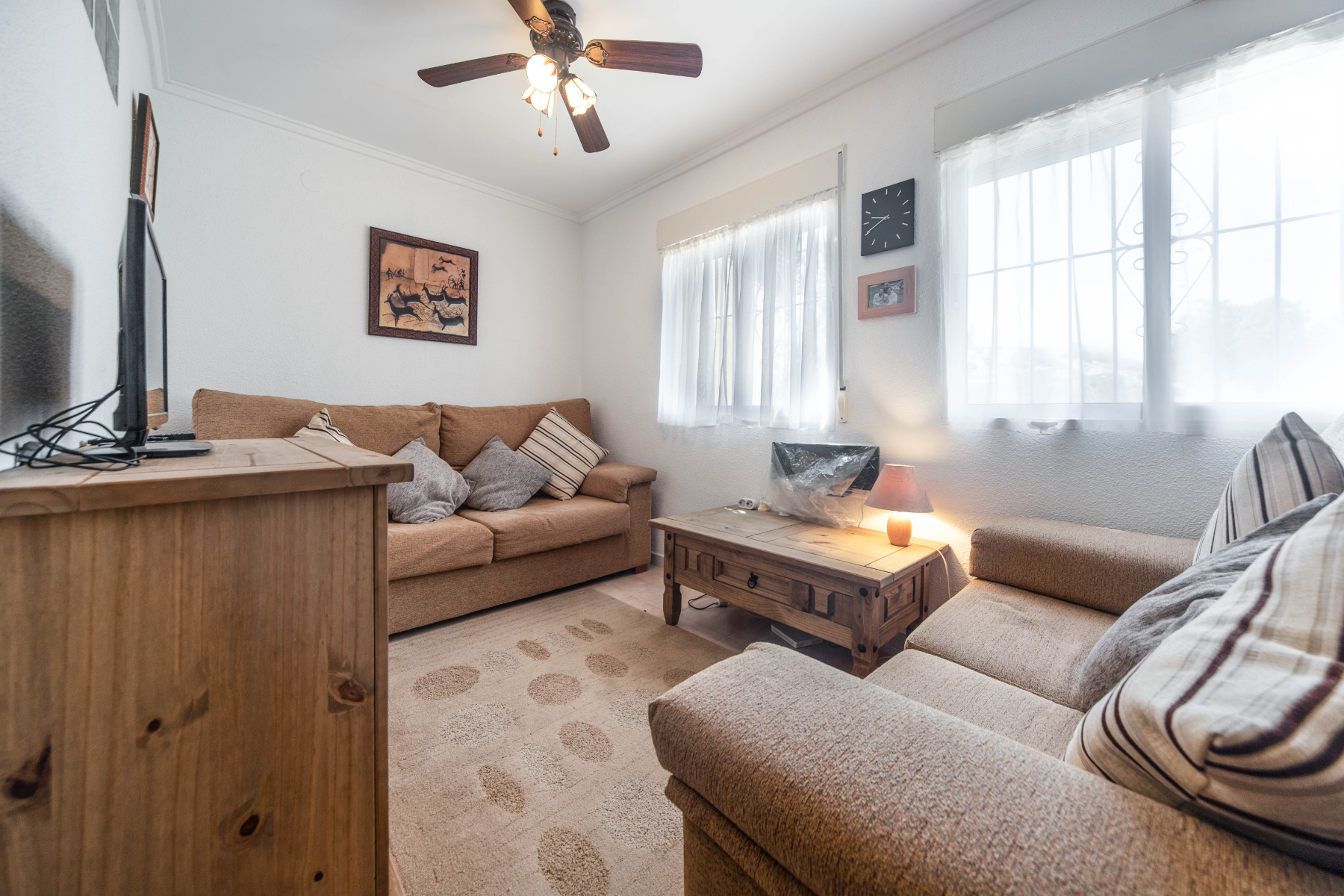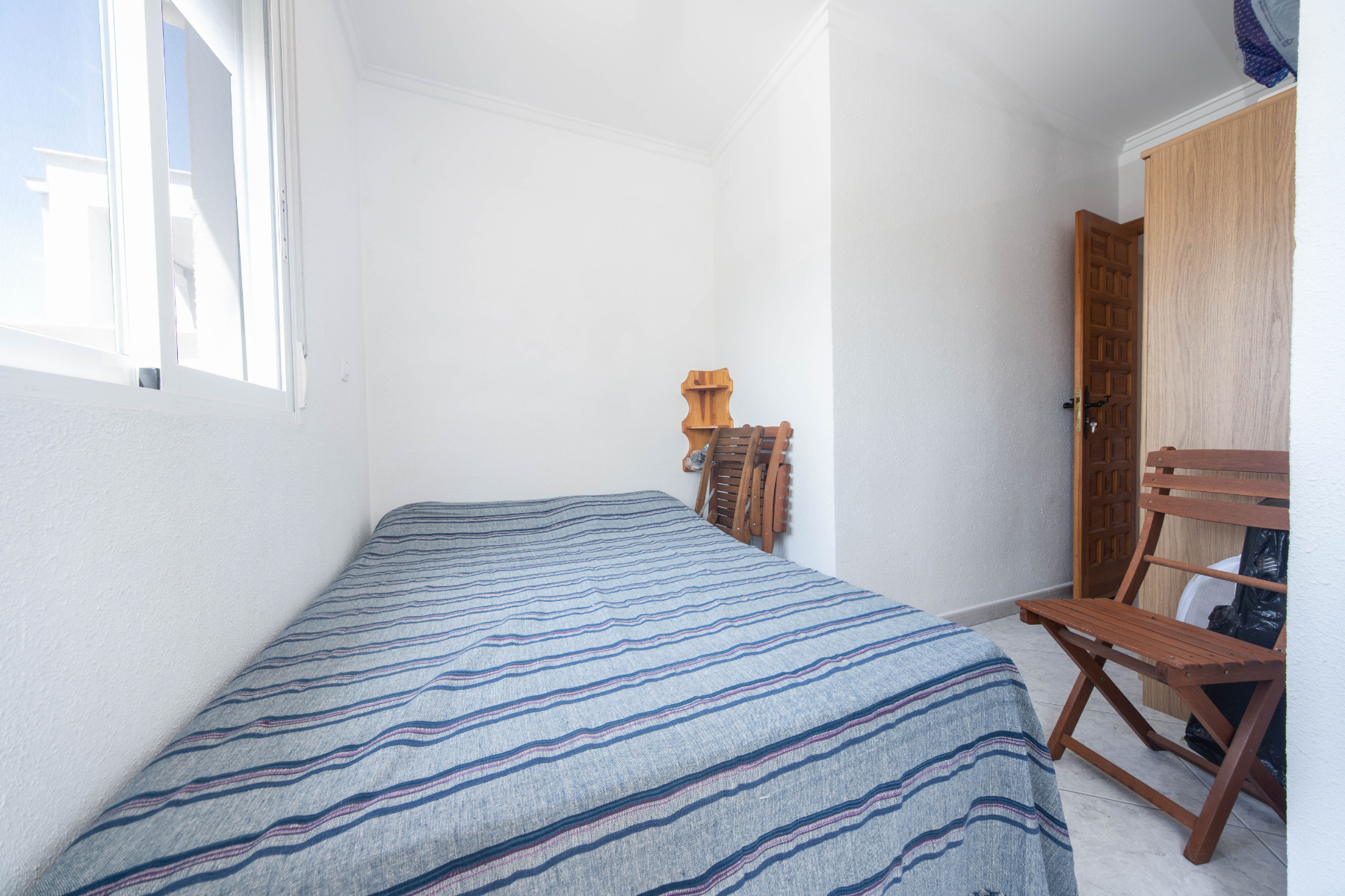 Extended Property for sale in a quiet location of Urbanisation La Marina Situated in a quiet location yet only 10 minutes to all amenities is this immaculate extended property, a model “Josefina”. Located in the heart of the community with ample parking close by this charming property has a lot to offer. The nearest beach is only a five minute drive away, the nearest airport of Alicante-Elche only 25 minutes away as are the large shopping centres of La Zenia Boulevard and Elche L’Aljub. Entry through the front gate leads us to the sun terrace with storage cupboard. The interior of the property consists of a spacious and bright living room with ceiling fan, air conditioning and an open plan fitted kitchen with breakfast bar. Just across from the kitchen is a good size storage cupboard which would also make a good study and a bathroom with corner shower. Stairs lead to the first floor where we find two double bedrooms with ceiling fans and the larger of the two rooms has air conditioning. There is access to a covered terrace from both bedrooms where one can enjoy a morning coffee or a glass of wine of an evening watching the sunset over the mountains towards Orihuela. Investment Opportunity not to be missed! This property we find in perfect condition, ready for the lucky new owner to move into. Whether it be a permanent residence, a holiday home or to invest in long term rental, it is a fantastic investment opportunity! The property has many extras included such as: aluminium windows, mosquito nets, security grills, guttering, air conditioning, ceiling fans and is being offered fully furnished. Real Estate Agents on the Costa Blanca Could this be the property you have been looking for? We have many properties available so please contact our team today we can guide you through the purchasing process here in Spain.
