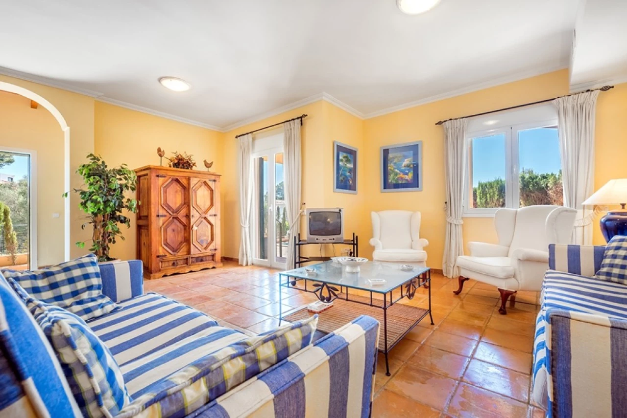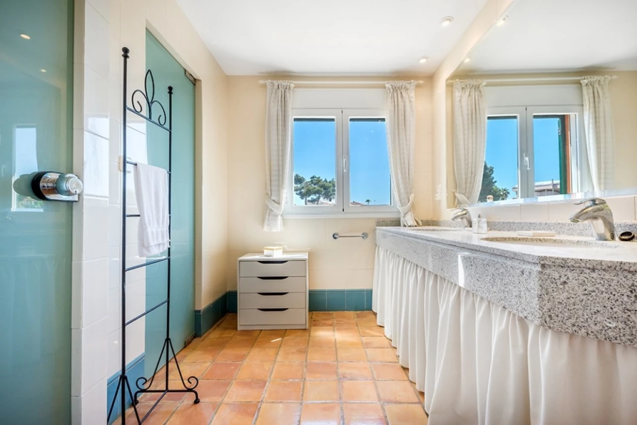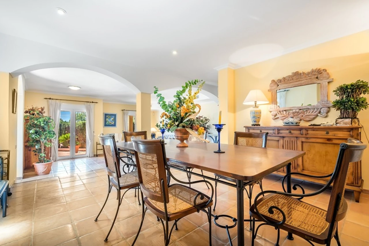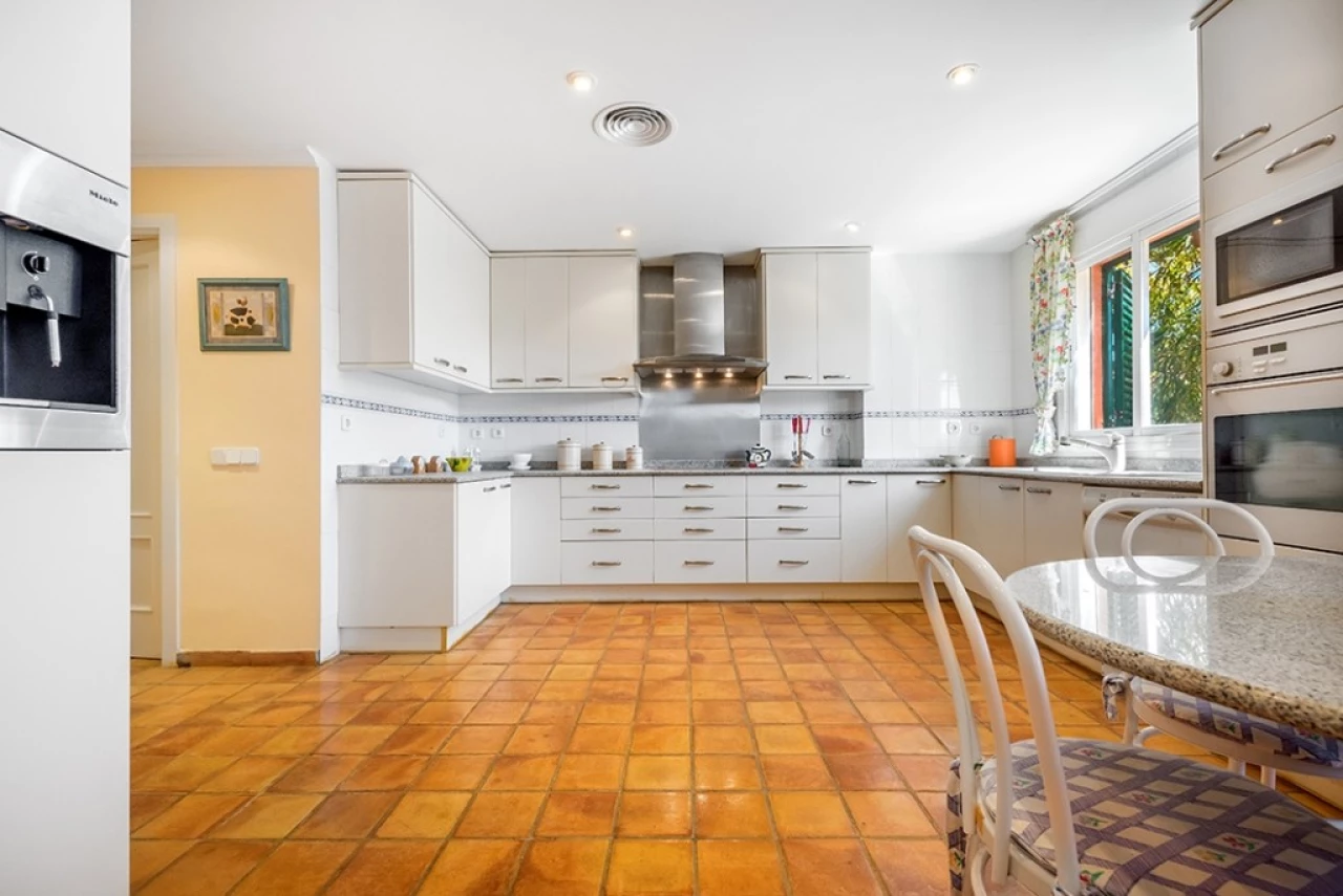 This property for sale in Mallorca is a very attractive villa in Son Verí, an exclusive area of Palma, the capital city of the Balearic Islands. It was built in the year 2000 and has two floors and a basement with 629sqms of living space. Of this total space a guest apartment occupies 100sqms which could easily be converted into anything else the new owner wishes, such as a children´s room, etc. The property is situated within a community complex and has access to three community pool as well as its own individual pool and garden where there is a barbecue area. There is also a 200sqm private parking space in the basement. Accommodation comprises a large living room, a 25sqm kitchen which is fully fitted and extremely well planned with a view to being essentially functional, eight bedrooms and eight bathrooms, some on the ground floor and others on the first floor. The master bedroom is on the first floor and has its own dressing room, exposed wooden ceiling beams and white lacquered woodwork with stunning views out over the Bay of Palma. This is a magnificent property in an unbeatable area of Palma.