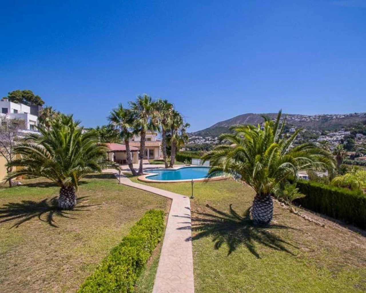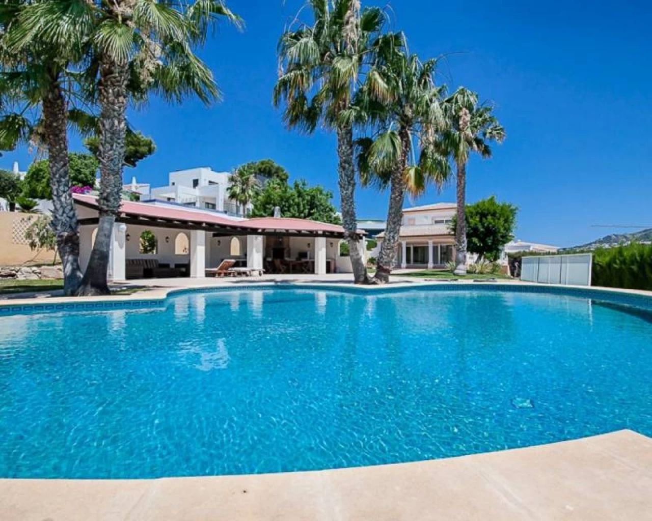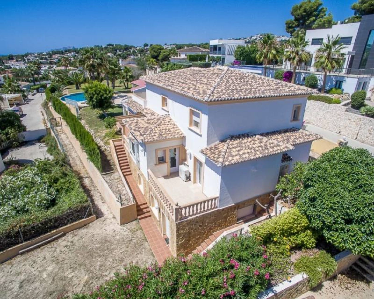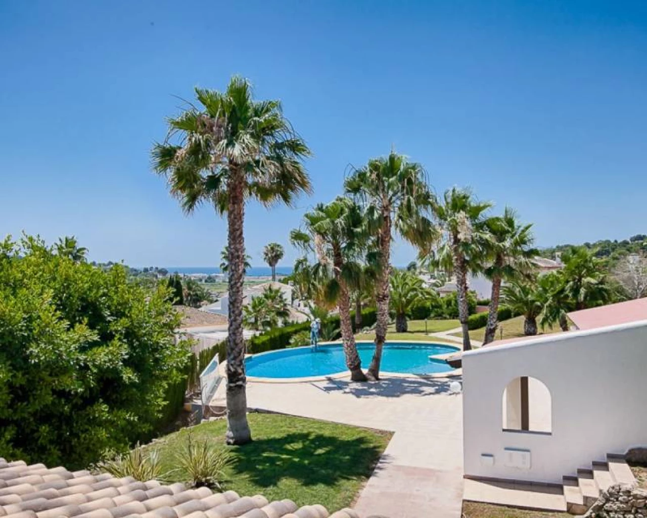 This villa is located within walking distance of the amenities and approximately 2 km from the Centre of Moraira and the beach. . . The villa has a good sea view and a beautiful garden with a huge swimming pool and a very large covered outdoor kitchen and chill-out area. . . Via an imposing entrance, you enter a large hall, which provides access to the living room, the dining room, and kitchen. . . On this floor, there are two bedrooms, two bathrooms (one en-suite), a storage room, utility room, and a large covered terrace, with direct access to the large garden. . . Upstairs there are two bedrooms, both with en-suite bathroom, a large terrace and a small office. In the large under build, which is still partly to be finished, there are several rooms, including a bedroom with an en-suite bathroom, an office, storage spaces and so on.. .
