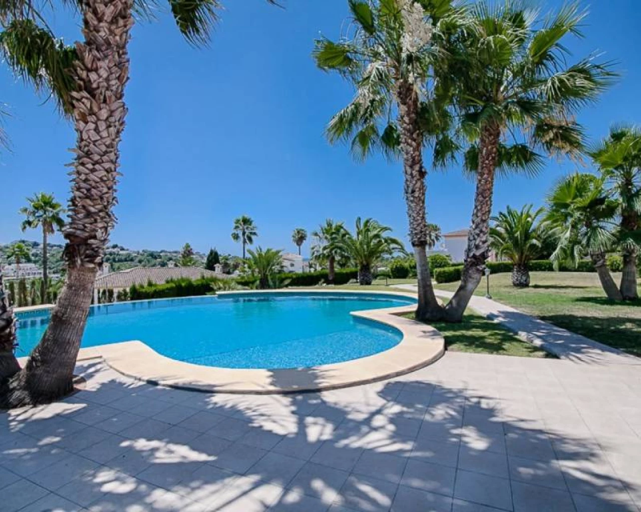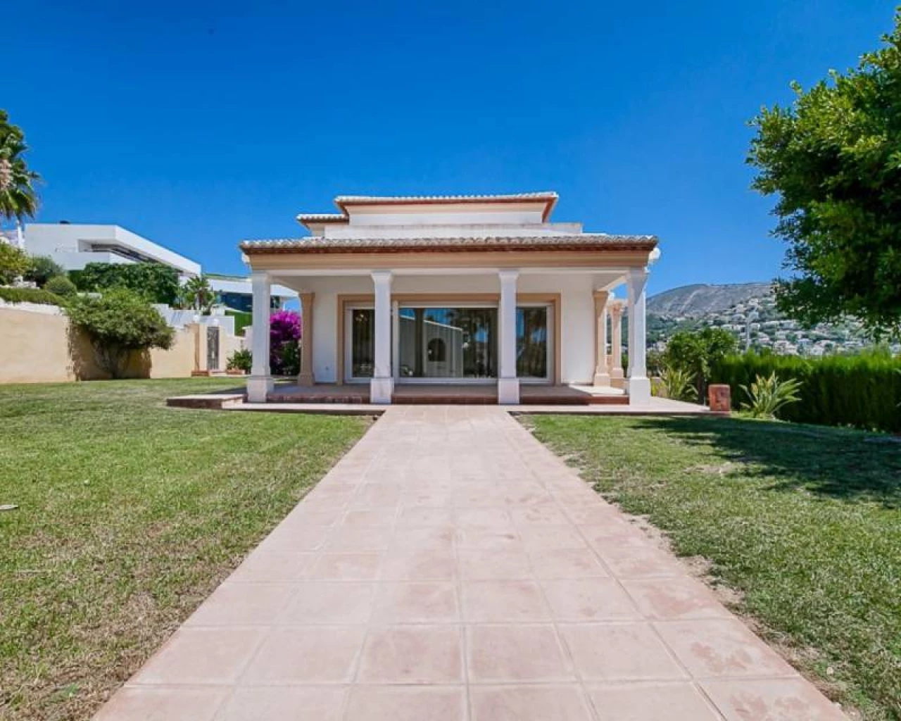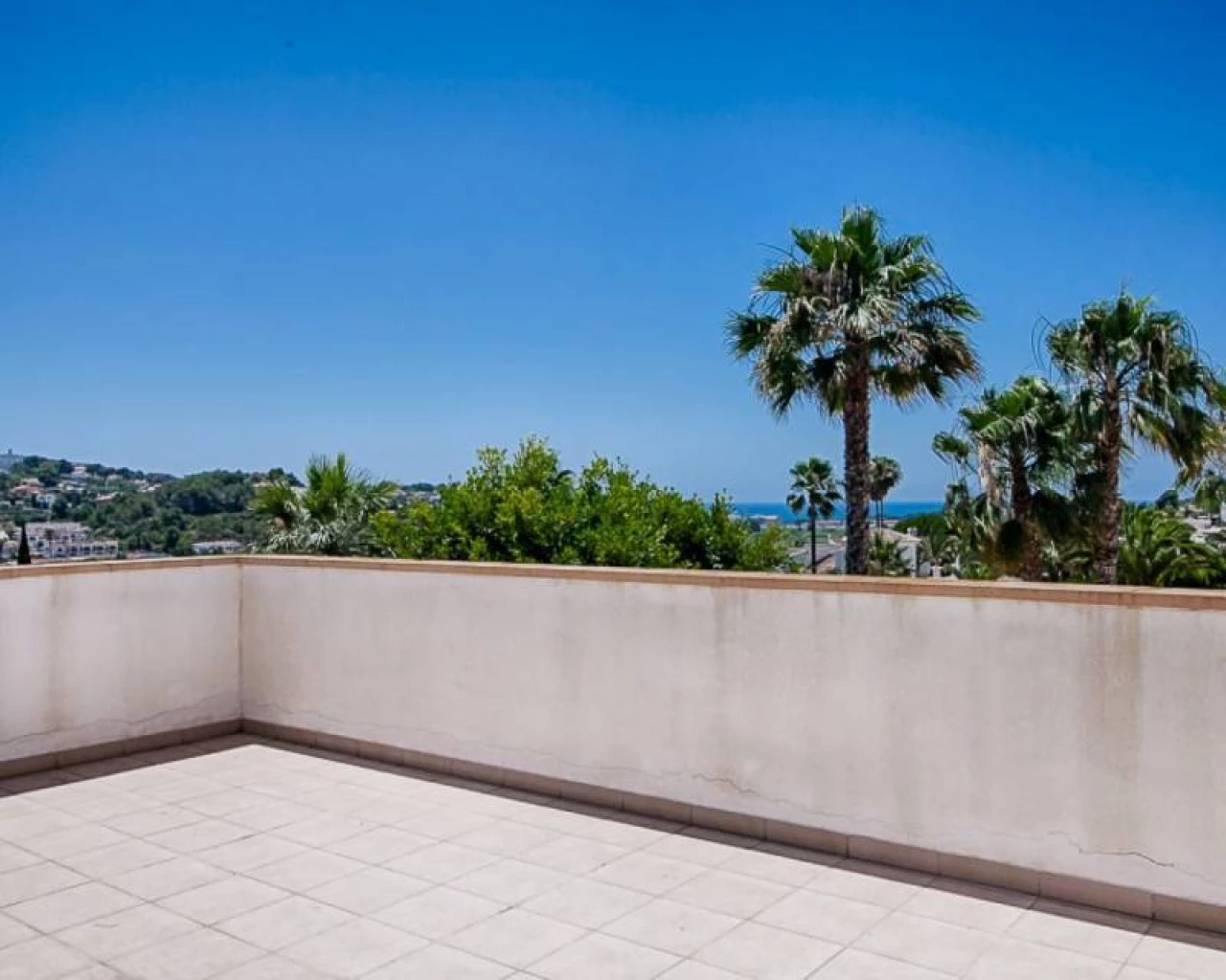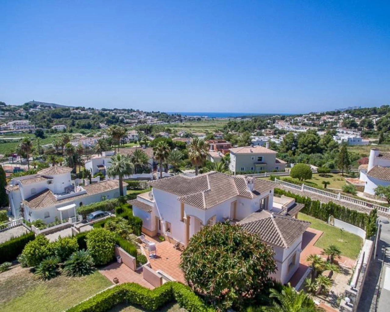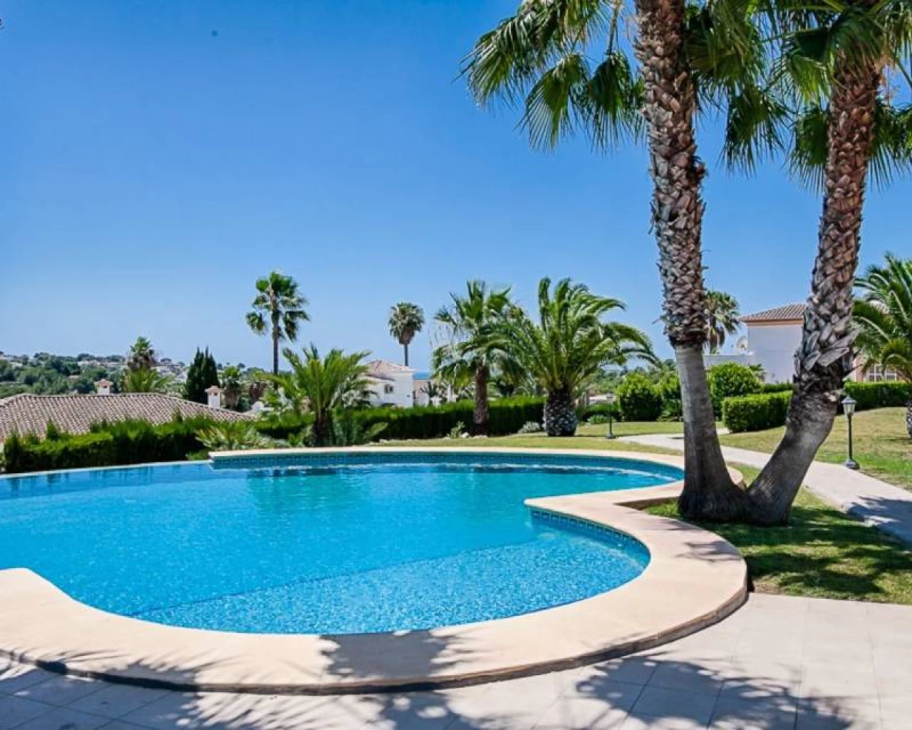 This villa is located within walking distance of the amenities and approximately 2 km from the Centre of Moraira and the beach. . . The villa has a good sea view and a beautiful garden with a huge swimming pool and a very large covered outdoor kitchen and chill-out area. . . Via an imposing entrance, you enter a large hall, which provides access to the living room, the dining room, and kitchen. . . On this floor, there are two bedrooms, two bathrooms (one en-suite), a storage room, utility room, and a large covered terrace, with direct access to the large garden. . . Upstairs there are two bedrooms, both with en-suite bathroom, a large terrace and a small office. In the large under build, which is still partly to be finished, there are several rooms, including a bedroom with an en-suite bathroom, an office, storage spaces and so on.. .