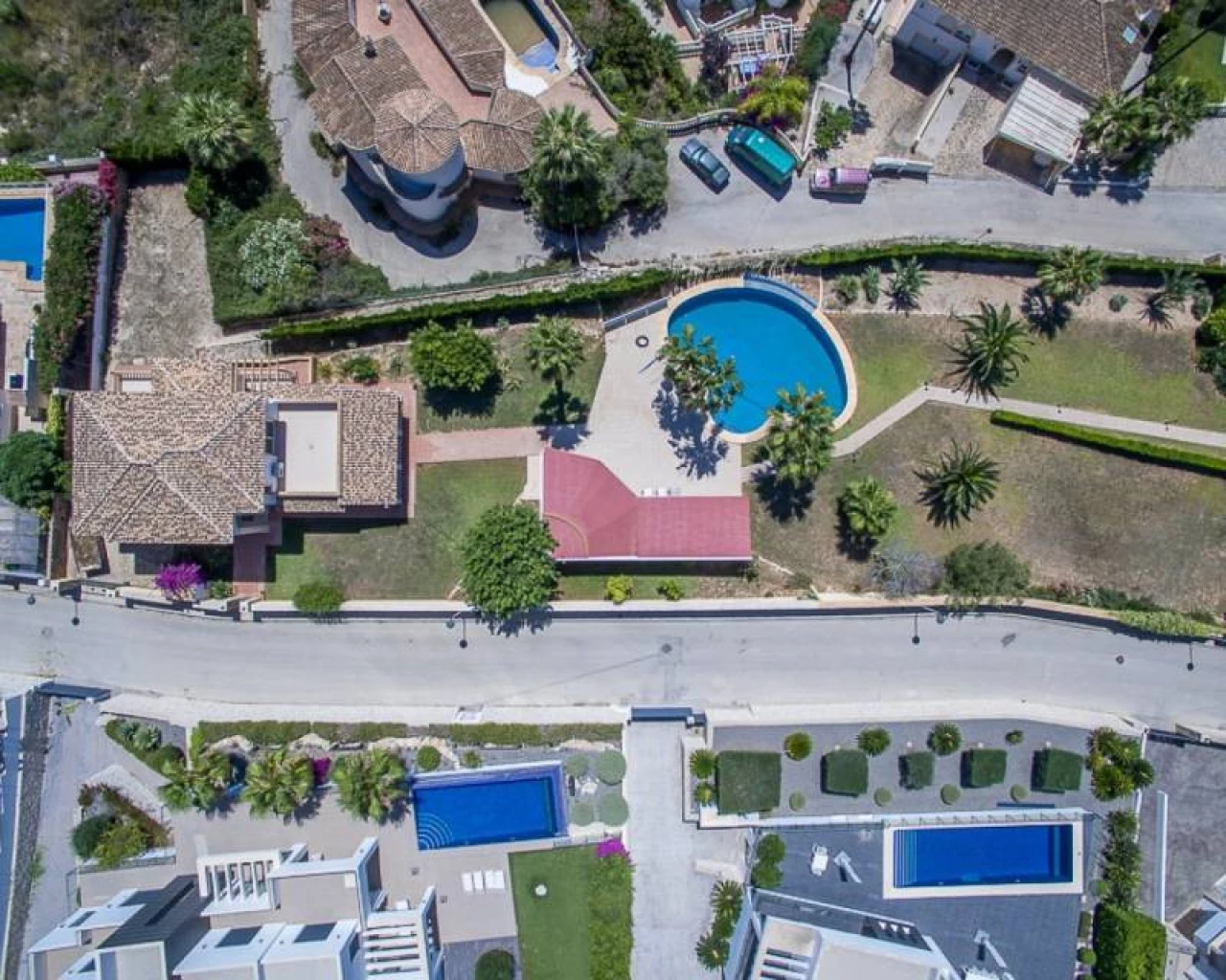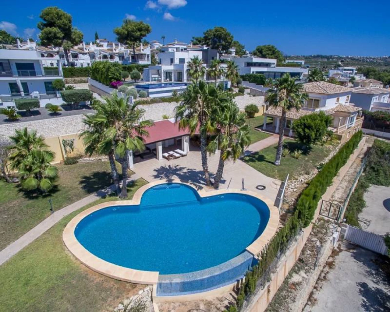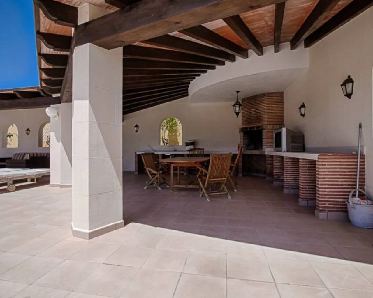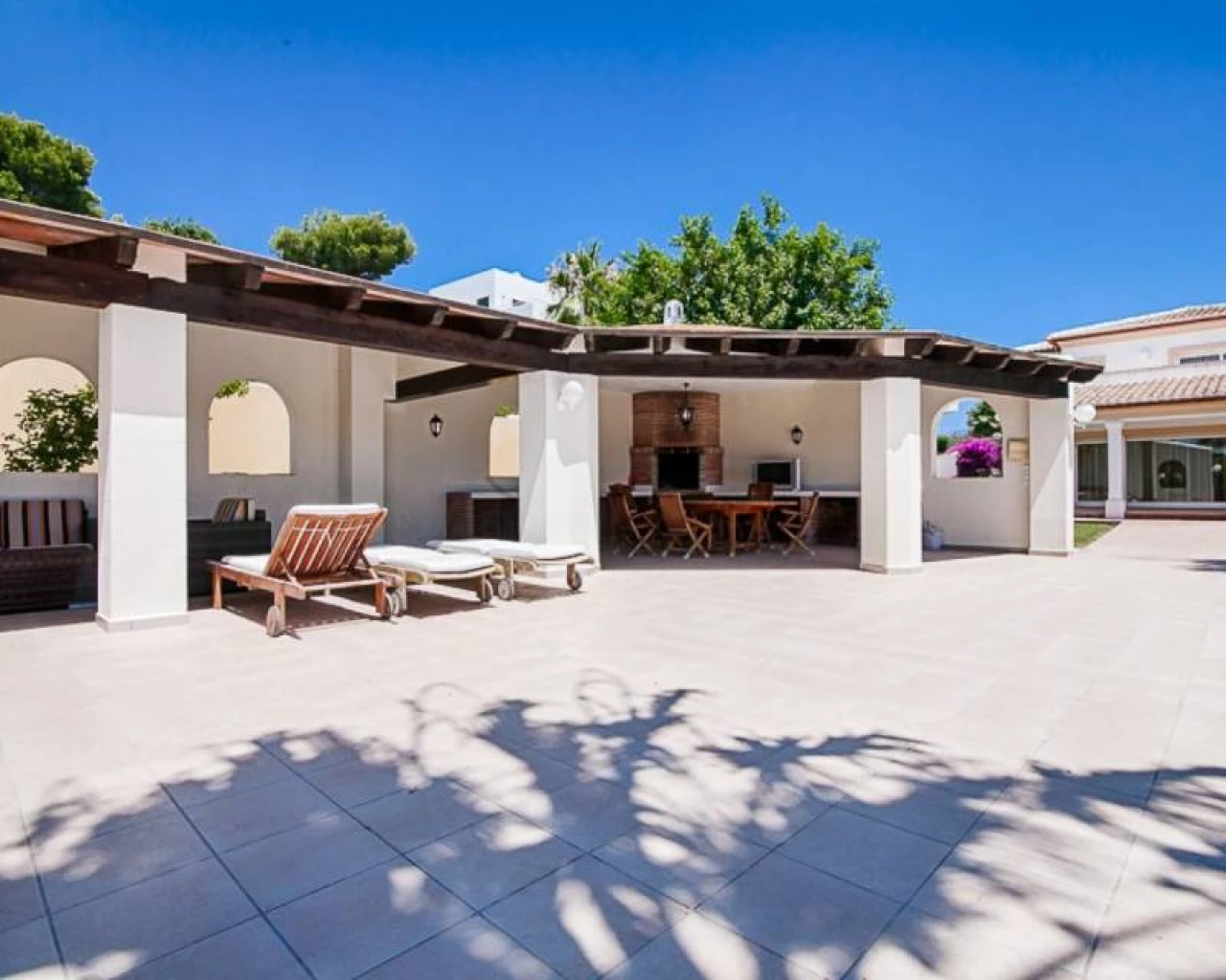 This villa is located within walking distance of the amenities and approximately 2 km from the Centre of Moraira and the beach. . . The villa has a good sea view and a beautiful garden with a huge swimming pool and a very large covered outdoor kitchen and chill-out area. . . Via an imposing entrance, you enter a large hall, which provides access to the living room, the dining room, and kitchen. . . On this floor, there are two bedrooms, two bathrooms (one en-suite), a storage room, utility room, and a large covered terrace, with direct access to the large garden. . . Upstairs there are two bedrooms, both with en-suite bathroom, a large terrace and a small office. In the large under build, which is still partly to be finished, there are several rooms, including a bedroom with an en-suite bathroom, an office, storage spaces and so on.. .