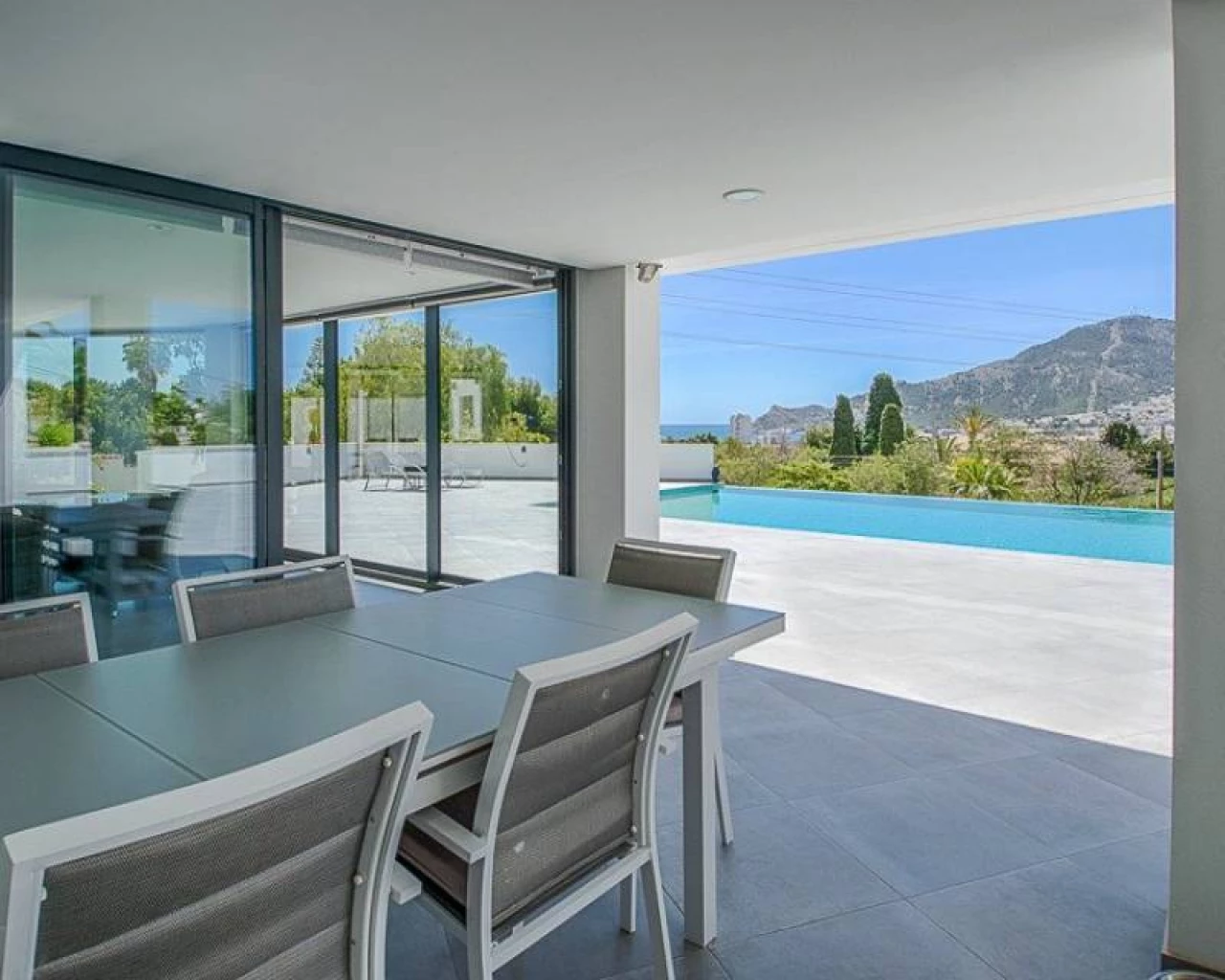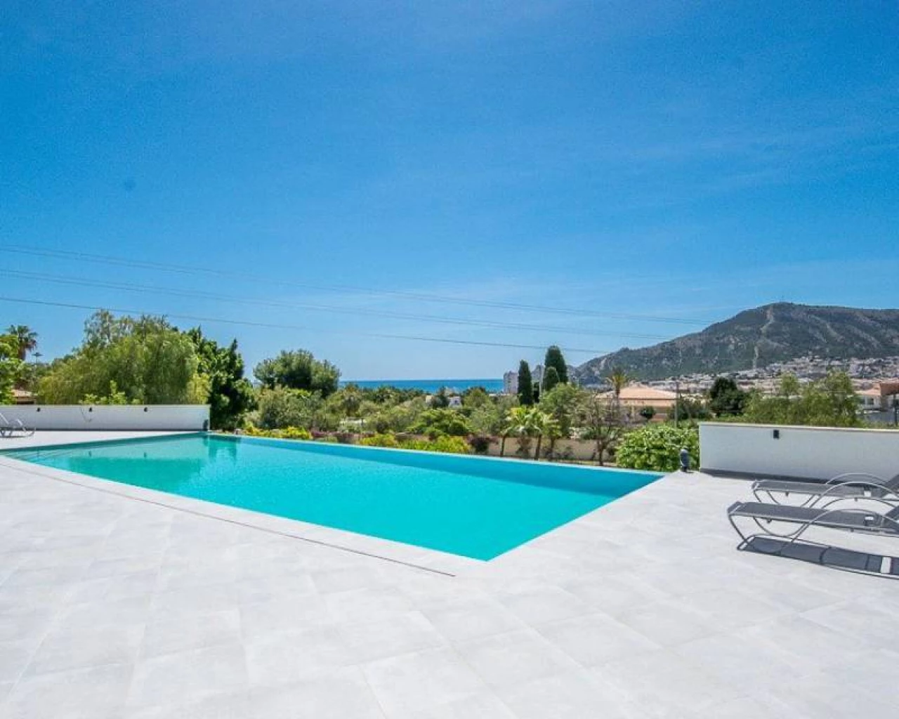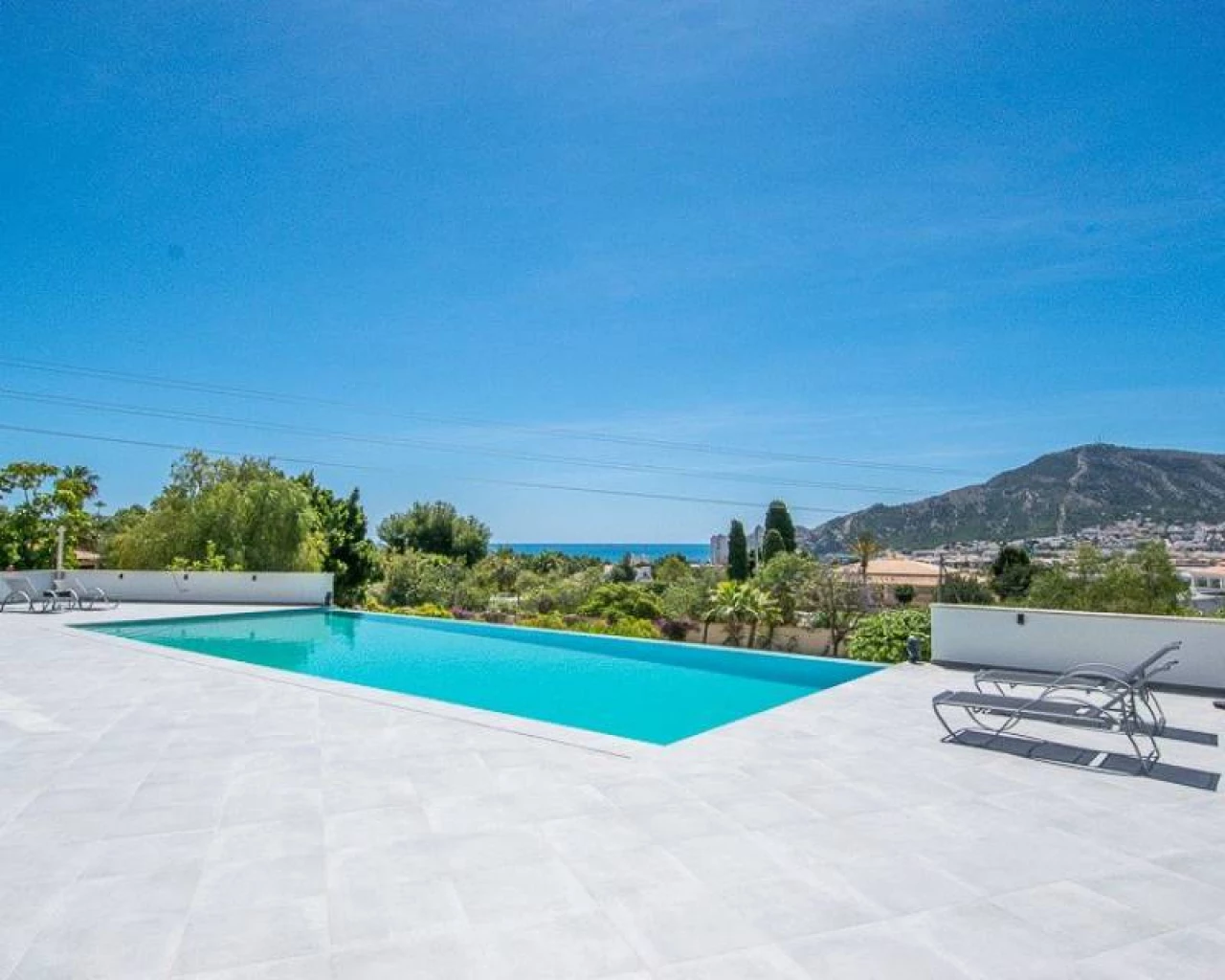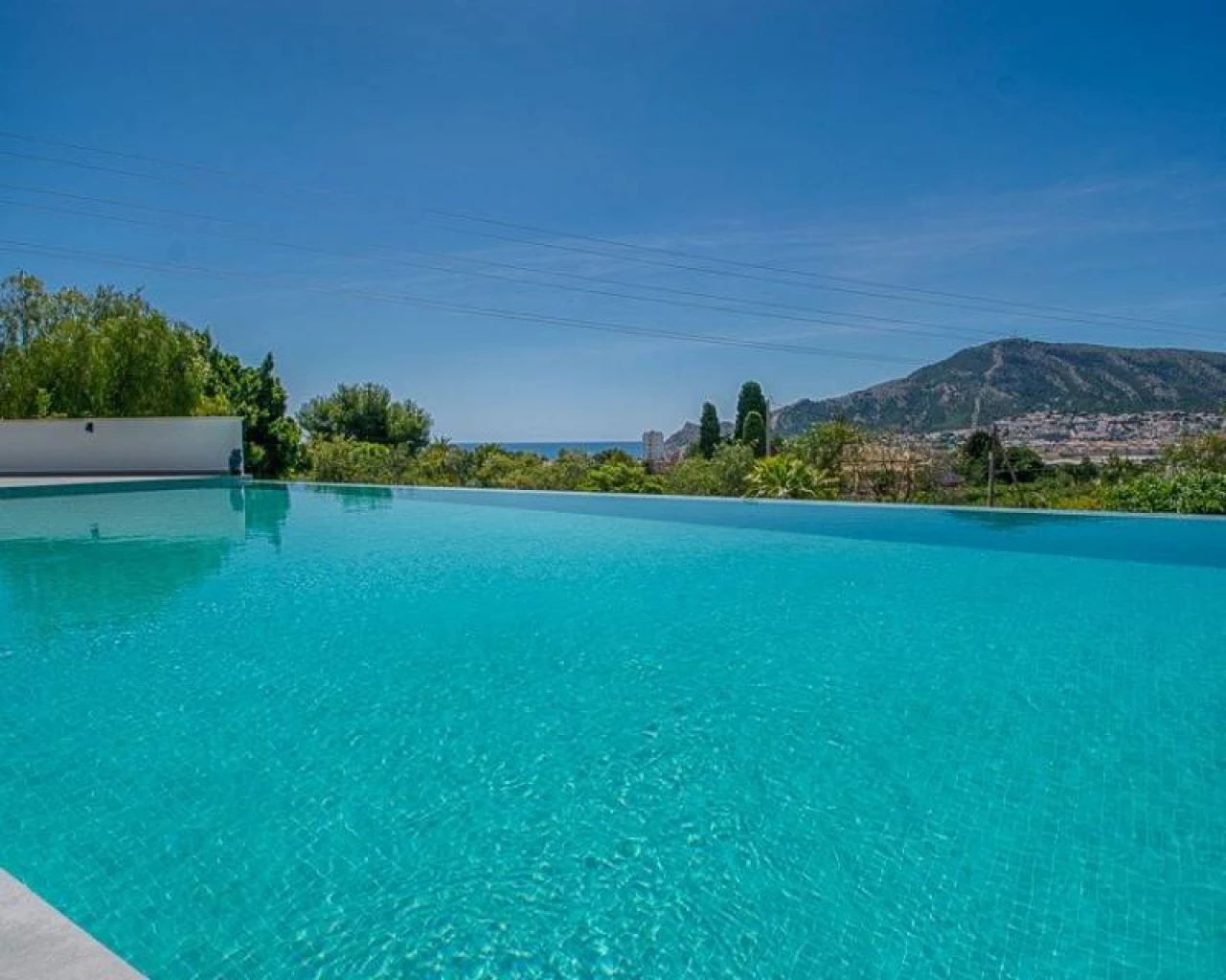 This fantastic villa with spectacular sea views is located in a quiet area between Altea and Albir. Distributed over two floors, it was completely renovated in 2018 with high quality finishes and with great attention to every detail.. . The upper floor consists of a spacious living-dining room with large windows that give the entire room a lot of natural light and allow you to enjoy the spectacular sea views, three bedrooms with three en-suite bathrooms. From this floor there is access to the sunny terrace and the pool area. The upper floor has another spacious living room, kitchen with dining area, two bedrooms and two en-suite bathrooms.. . Outside, we find a large and sunny terrace around the 6x16m infinity pool, barbecue area and a beautiful consolidated garden with a variety of native plants and trees. The villa is equipped with underfloor heating, air conditioning, alarm, water tank, garage, parking area for 10 cars on the plot, a large solarium, video intercom, etc.. . In short, an exceptional villa with wonderful views of the sea, located on a large plot just 5 minutes by car from the center and the beach..