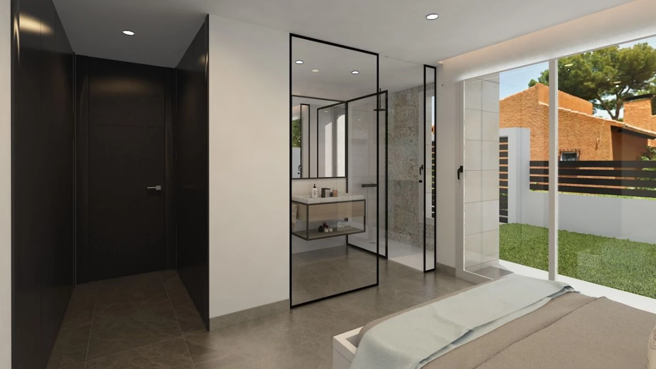 MODERN VILLA IN COASTAL TOWN Stunning modern villa only 5 minutes from the centre and beaches of Torrevieja. The property offers a modern and elegant design, and includes a large plot of about 400 meters with garden and parking space. It also has a solarium, dressing room, swimming pool with heat pump, fully finished premium garden.