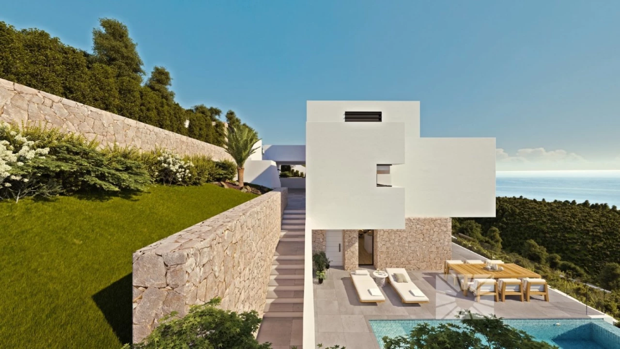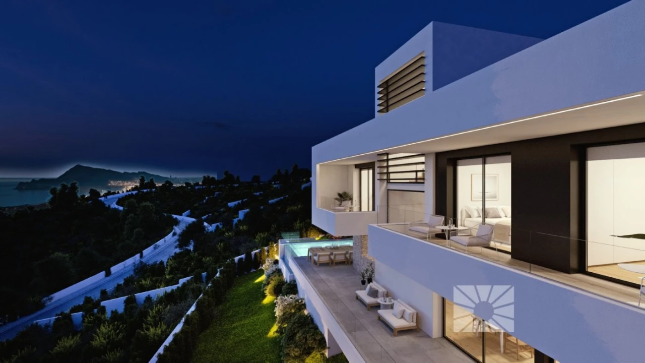 DESIGNER VILLA IN EXCLUSIVE URBANISATION. SEA VIEWS. Villa designed/planned on a plot with spectacular sea views in the exclusive community with big luxurious villas. Its location on Sierra de Altea, one of the most prestigious areas on the North Costa Blanca, enhances its charm even more. A villa that encompasses design, efficiency and quality. It has a layout designed to make the most of the capacity of the land enhance the sea views from its rooms. The entrance is on the top floor, where you can find the hall, which connects with the garage, with space for two vehicles. We can use either the stairs of the lift to go down to the middle floor, where the main bedroom and two other bedrooms are. The main bedroom has an en-suite bathroom, walk in closet and access to a private terrace. The other two bedrooms also each have an en-suite bathroom, spacious wardrobes and they share a terrace between them. On the ground floor is where all the day areas are located, an open and bright space. The kitchen, with a centre island, joins up with one of the porches and exterior terrace, where the endless swimming pool will take us to the sea without leaving the house. The spacious living/dining room, which has large windows, and access to a second porch and the main terrace, is one of the gems of this villa. On this floor, we also find the laundry room, an inside and an outside guest bathroom, as well as the access to the lift, which connects us to the rest of the house. The exterior areas of this property are of major importance due to the wonderful views and the Mediterranean climate, which invites us to live outside. Several terraces, porches and garden areas complete the design of this sensational villa in Altea.