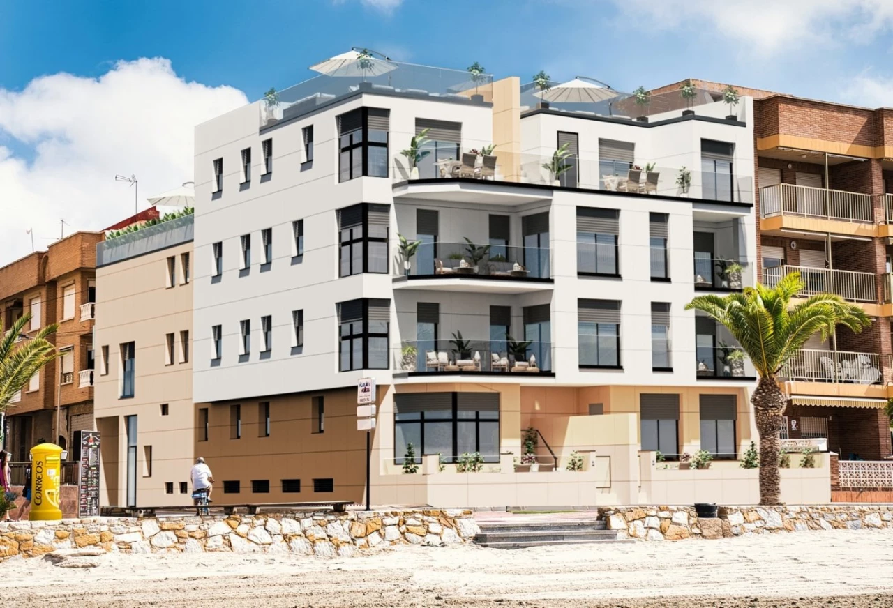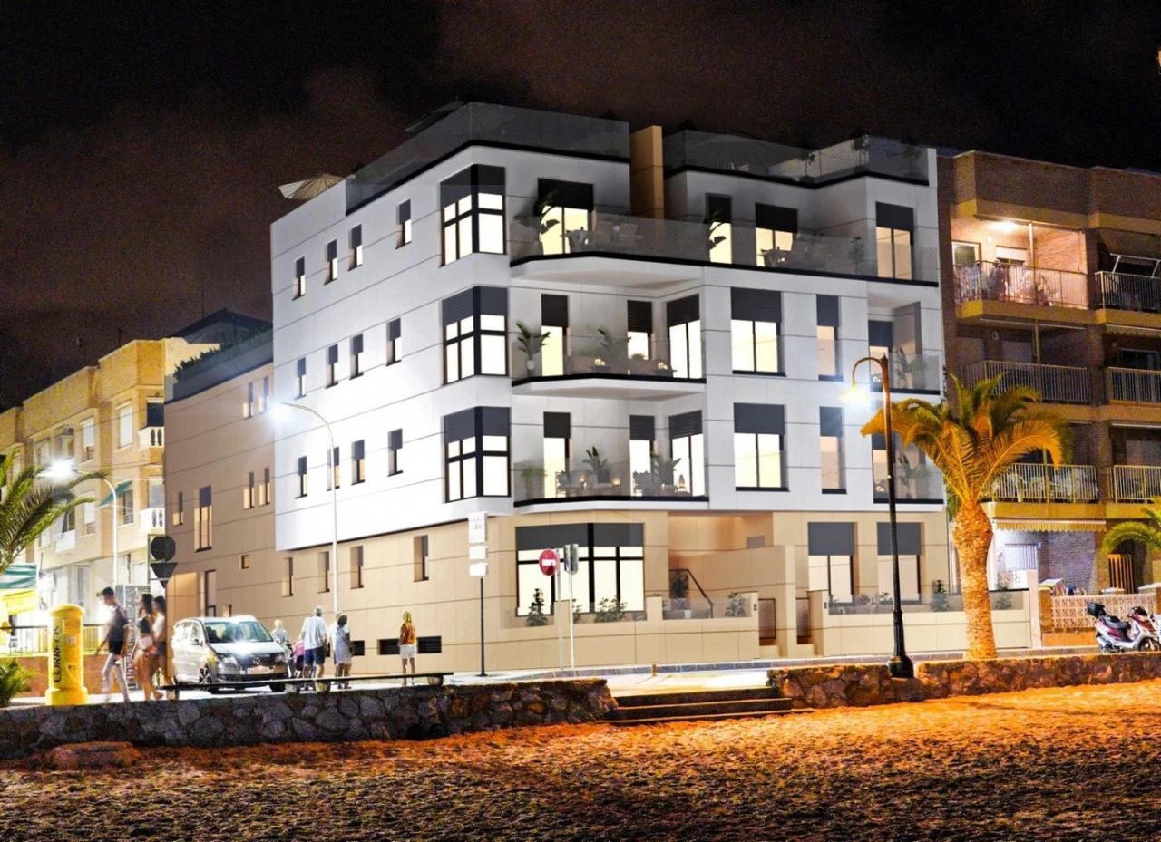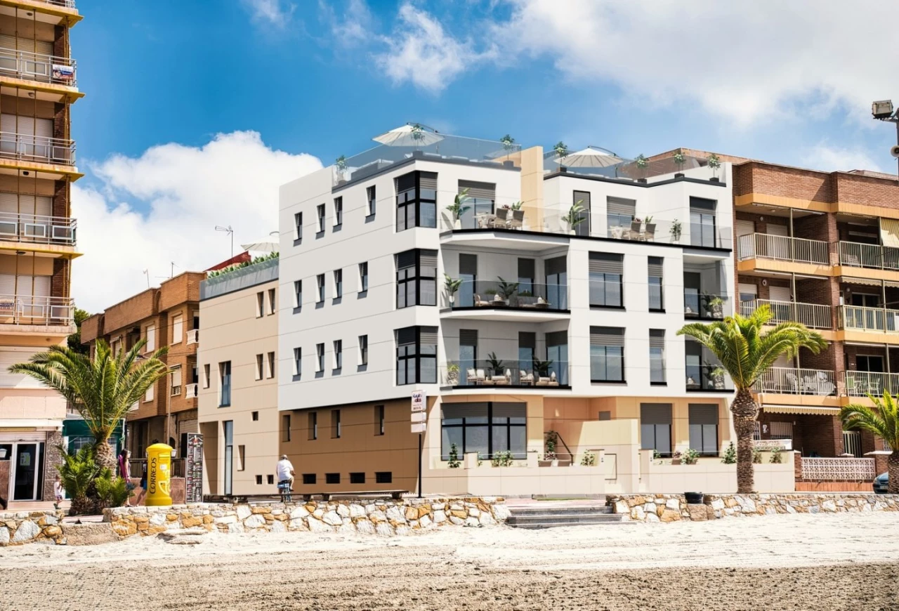 NEW BUILD SEAFRONT APARTMENTS IN LO PAGAN New Build residential of 10 frontline apartments in Lo Pagan. These apartments will be built to the highest standard and are just a few steps away from the beach, restaurants, promenade and shops of Lo Pagan. The building has 3 floors with 2 or 3 properties per floor, 2 or 3 bedroom options. All apartments will have amazing views of the Mar Menor and the 2 penthouse properties offer a private solarium. As an option also you can have underground parking and storeroom. San Pedro del Pinatar's privileged location on the Mar Menor and Mediterranean coastline it attracts those with an interest in sailing and watersports, providing marina mooring and sailing clubs, while the beaches and natural mud baths attract those seeking safe sun, sea and sand. San Pedro del Pinatar has an established community and offers an excellent range of activities, including covered swimming pool and sports facilities, as well as a year round programme of social activitiesby the pleasant winter weather. The benefits of the mud baths, typical of the region, or the calm waters of the Mar Menor, have favored the growth of Lo Pagán, which currently has all kind of amenities. In addition, it has an excellent location, just 5 minutes from the Commercial Centre Dos Mares. Murcia/Corvera airport is 30 minutes away and Alicante airport is an hour drive away.