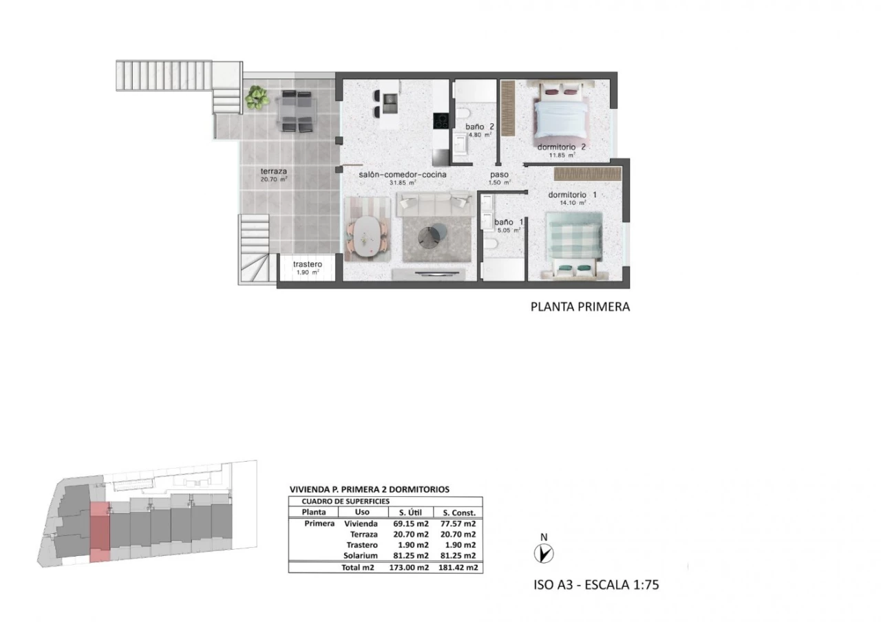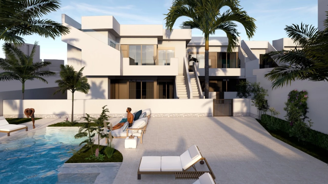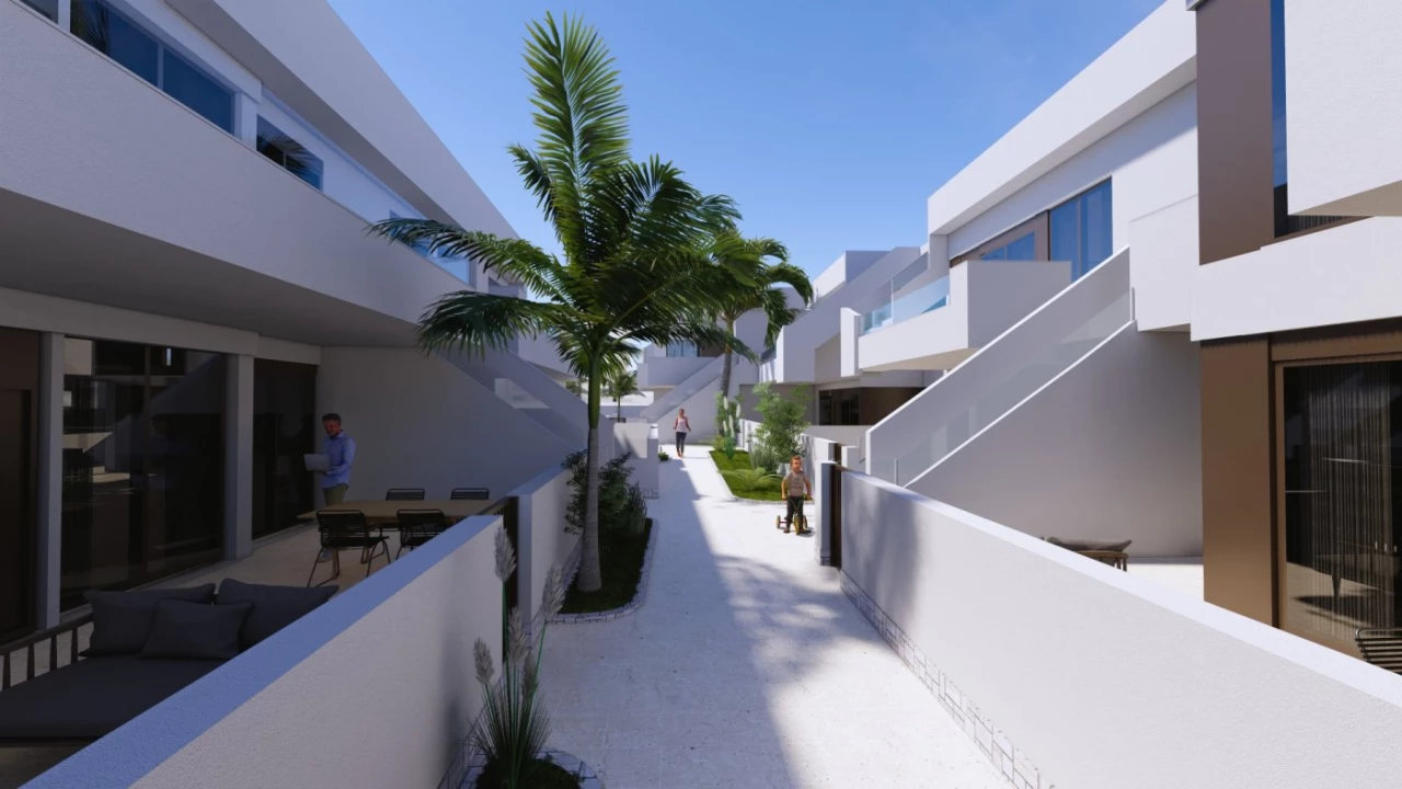 NEW BUILD RESIDENTIAL OF BUNGALOW APARTMENTS IN PILAR DE LA HORADADA New Build exclusive residential of 20 modern bungalow apartments in Pilar de la Horadada. You can choose 2 or 3 bedrooms bungalow apartments with 2 bathrooms. The ground floor units have large front and rear terraces and direct access to the communal pool and garden. The top floor properties have a very large rooftop solarium. The living space consists of a large open plan living / dining room and fully equipped kitchen with large sliding doors incorporating the outside space. The bedrooms have plenty of space, a built-in wardrobe and the main one has a large bathroom with a walk-in shower. The bathrooms are fully furnished and equipped with shower screens, cabinets and mirrors with pleasant low-level LED and mirror lighting and underfloor heating. All homes have a private parking space. Pilar de la Horadada is a typical Spanish village in the most southern part of the Costa Blanca. The large main street has supermarkets, lots of shops, restaurants and bars and some lovely squares. The beautiful beaches of Torre de la Horadada and Mil Palmeras with fine sand promenade is just 5 minutes away. The airports of Corvera (Murcia) and Alicante are respectively 40 and 55 minutes away