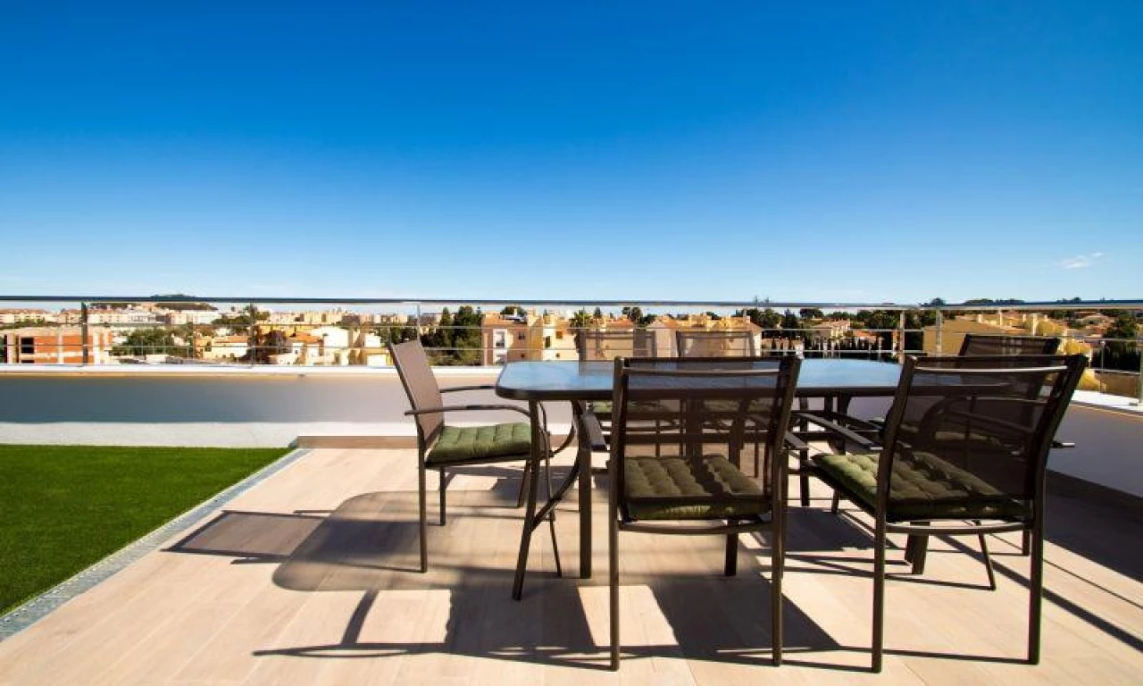 MODERN TOWNHOUSE WITH GARDEN AND SOLARIUM Private urbanization of townhouses, with an area of 100 m2 with private garden and parking. They have 2 floors, on the ground floor there is a large living room with a fully equipped open kitchen, a bathroom, exit to the terrace and parking for 2 cars. On the upper floor are the 3 bedrooms with 2 more bathrooms, one of them en suite and another terrace that is accessed from the main room. There is also access to a private solarium with great unobstructed views. The residential has common green areas, playgrounds and a community pool. 1.5 km from the center of Denia and the beach, in a quiet residential environment where many residents live all year round.