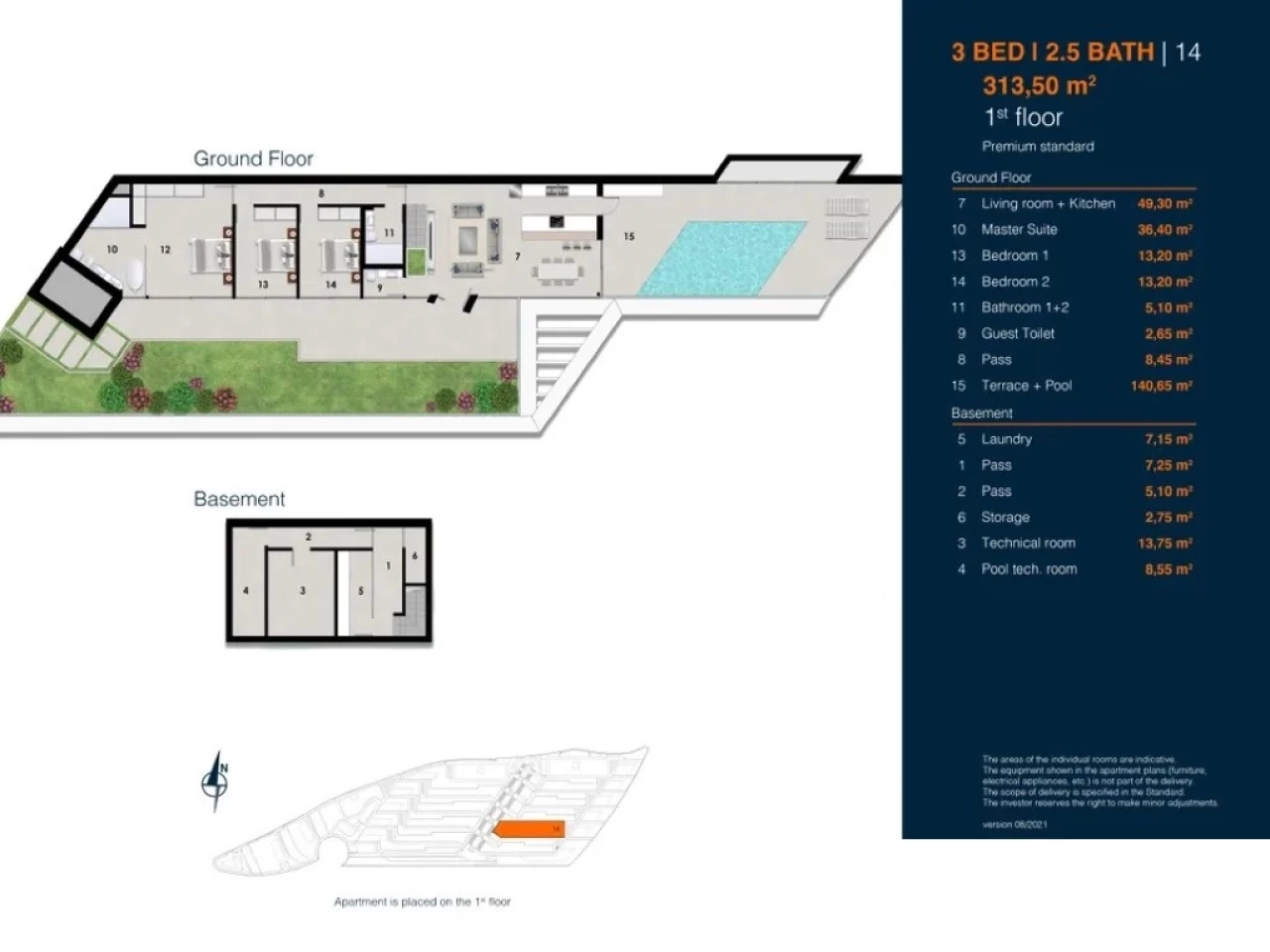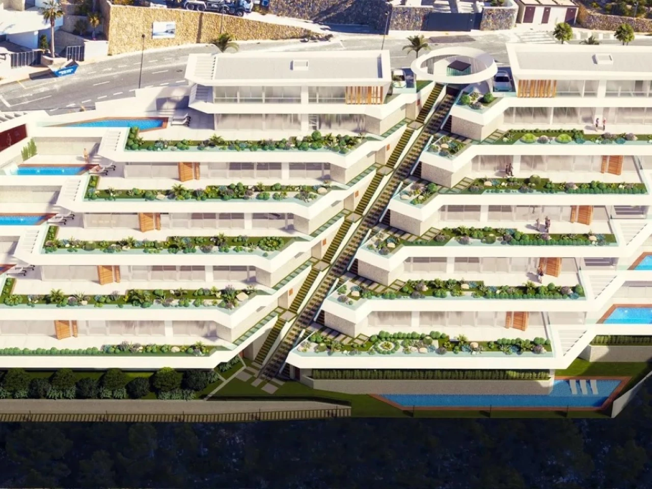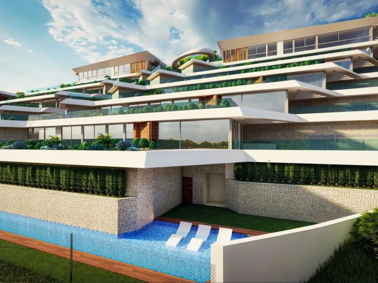 This beautiful spacious 3 bedroom apartment is part of a new complex where construction will start in October 2022. The total complex consists of only 14 apartments. The apartment in question offers a spacious lounge with dining area, a fully equipped modern open kitchen, a guest toilet, 2 double bedrooms, a bathroom and the master bedroom with bathroom en suite. Each apartment has a spacious partly covered terrace with private pool at its disposal. There is also a garage and storage room.