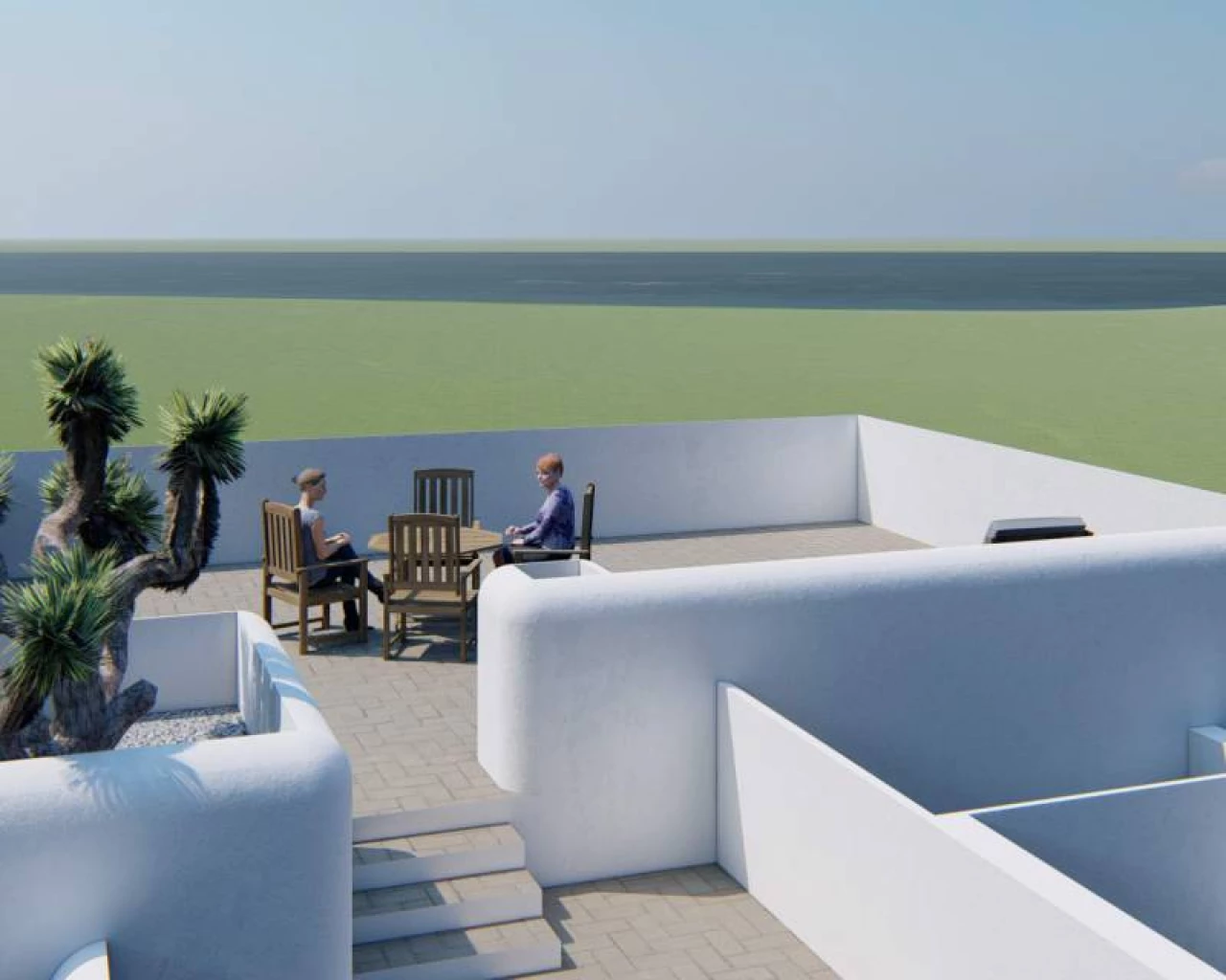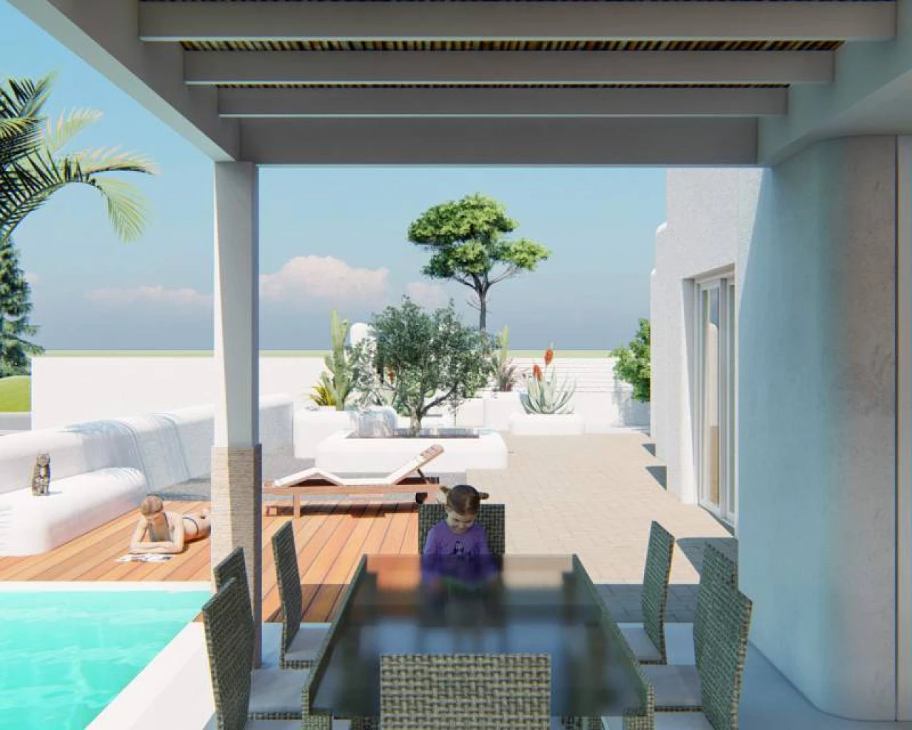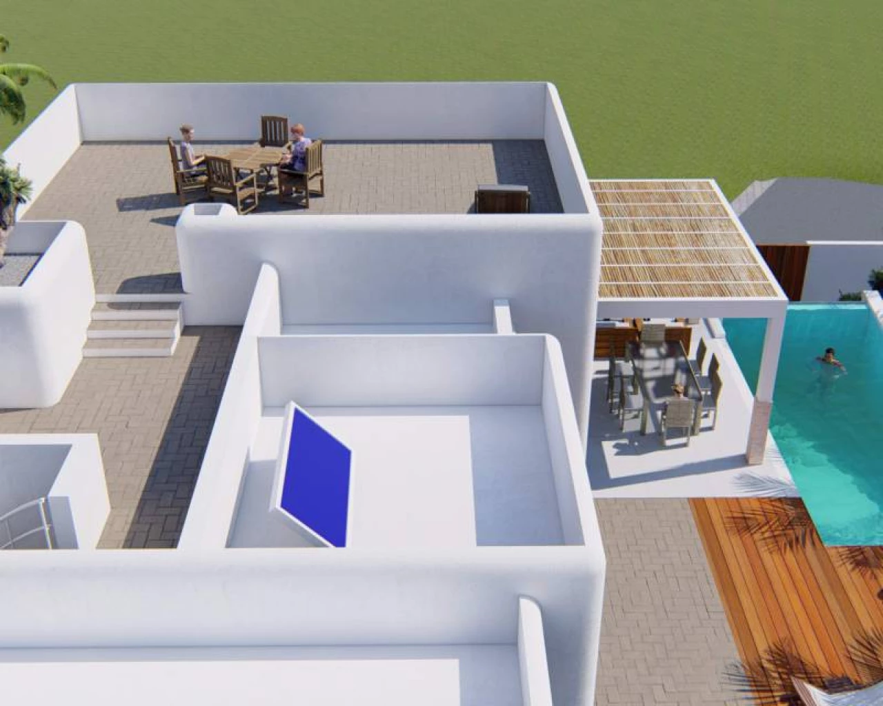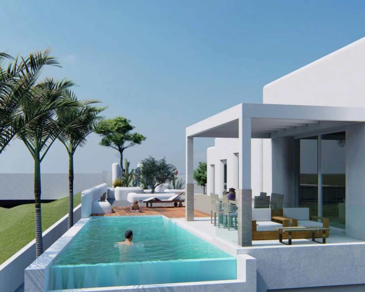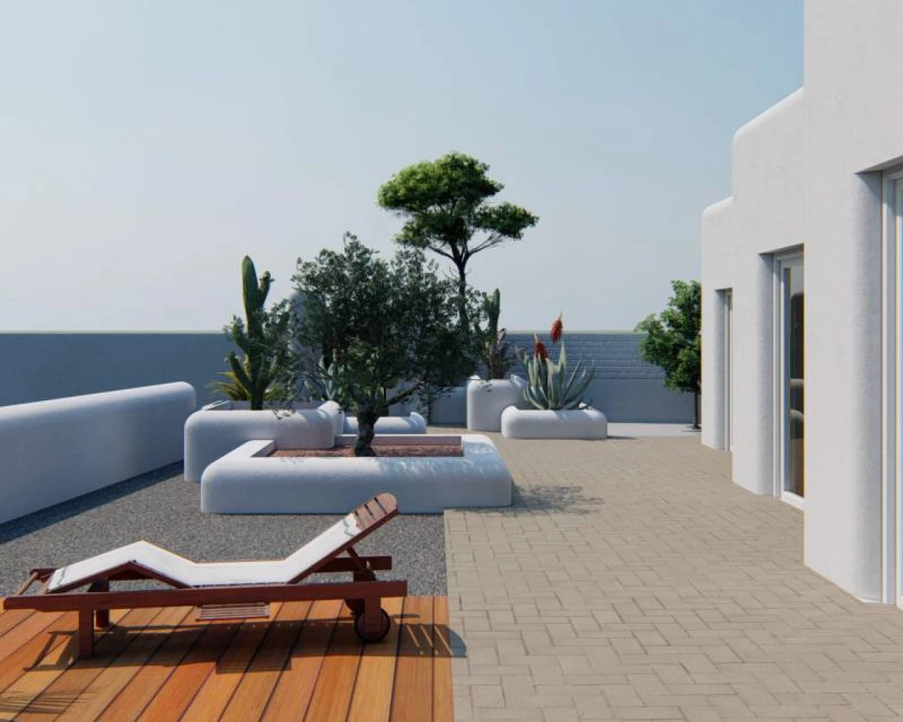 This beautiful Ibizian villa will be built in a quiet area of La Nucía about ten minutes from the idyllic beach of Albir. The house has a large living/dining room, a kitchen, 3 bedrooms, 2 bathrooms, one of which is ensuite and a laundry room. From the dining room you can reach the pergola next to the pool through a large sliding window that disappears into the wall. In this villa you can enjoy the view of the sea and the mountains in the bright sunshine on the roof terrace or cooling down from the infinity pool. The property is accessed from two different streets, with a pedestrian entrance and pergola for vehicles on the upper street, and a covered basement garage with access from the lower street.