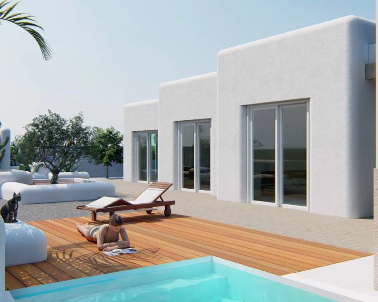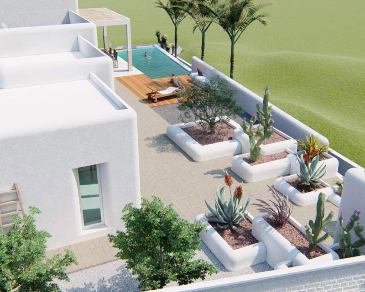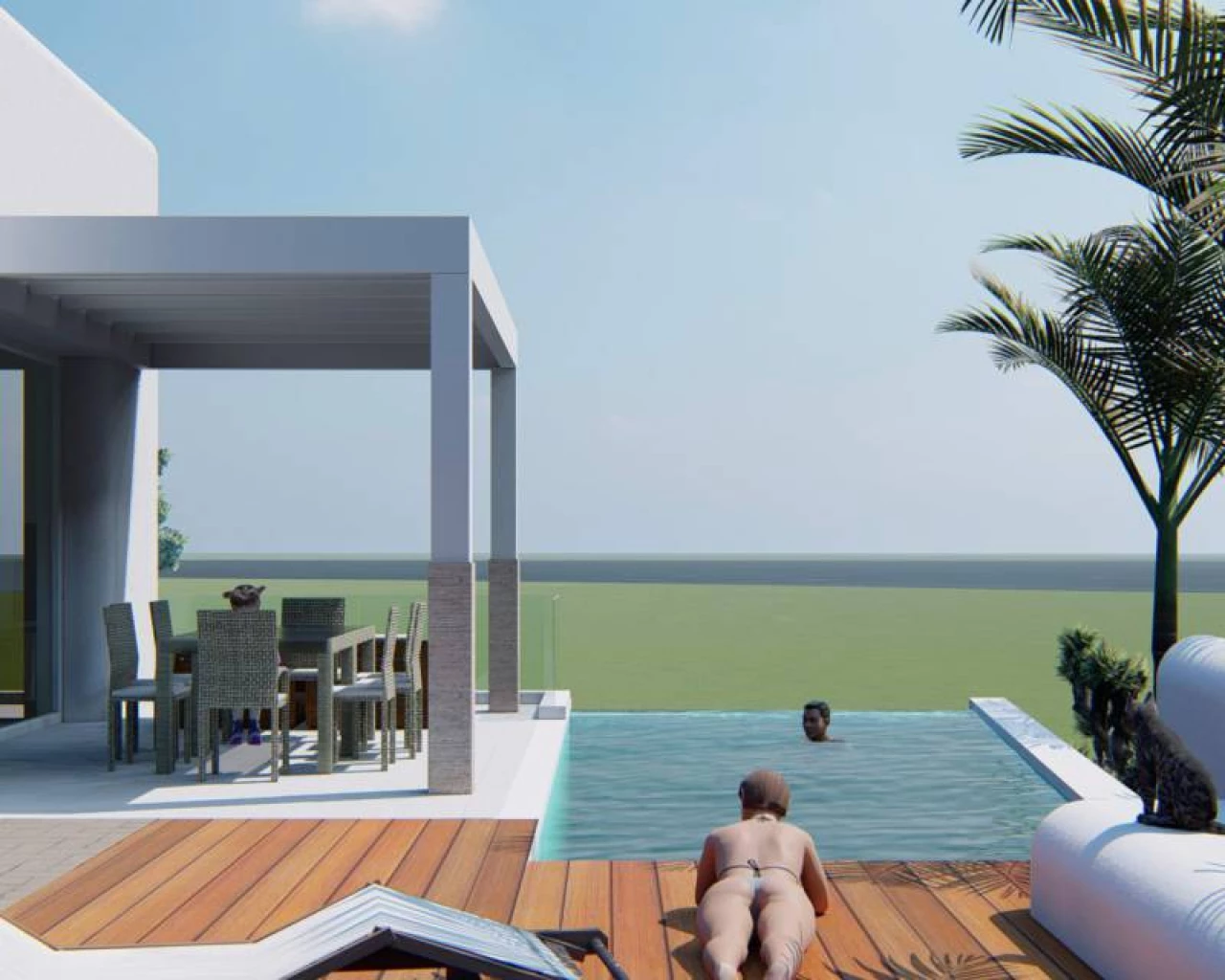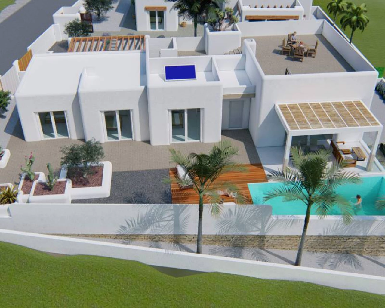 This beautiful Ibizian villa will be built in a quiet area of La Nucía about ten minutes from the idyllic beach of Albir. The house has a large living/dining room, a kitchen, 3 bedrooms, 2 bathrooms, one of which is ensuite and a laundry room. From the dining room you can reach the pergola next to the pool through a large sliding window that disappears into the wall. In this villa you can enjoy the view of the sea and the mountains in the bright sunshine on the roof terrace or cooling down from the infinity pool. The property is accessed from two different streets, with a pedestrian entrance and pergola for vehicles on the upper street, and a covered basement garage with access from the lower street.