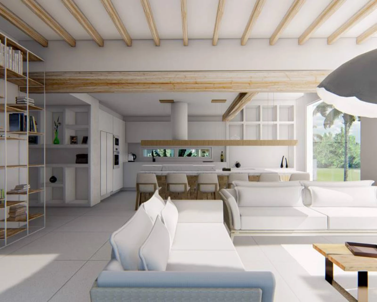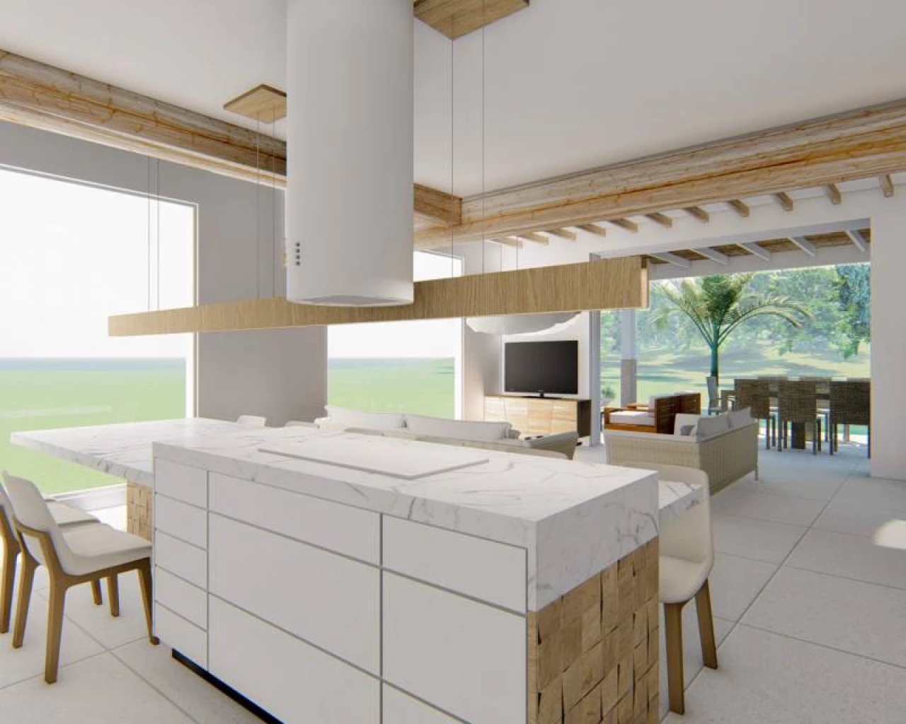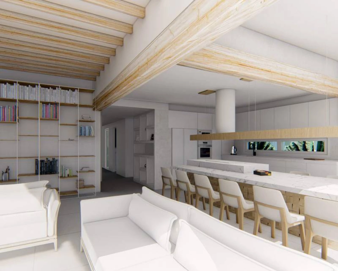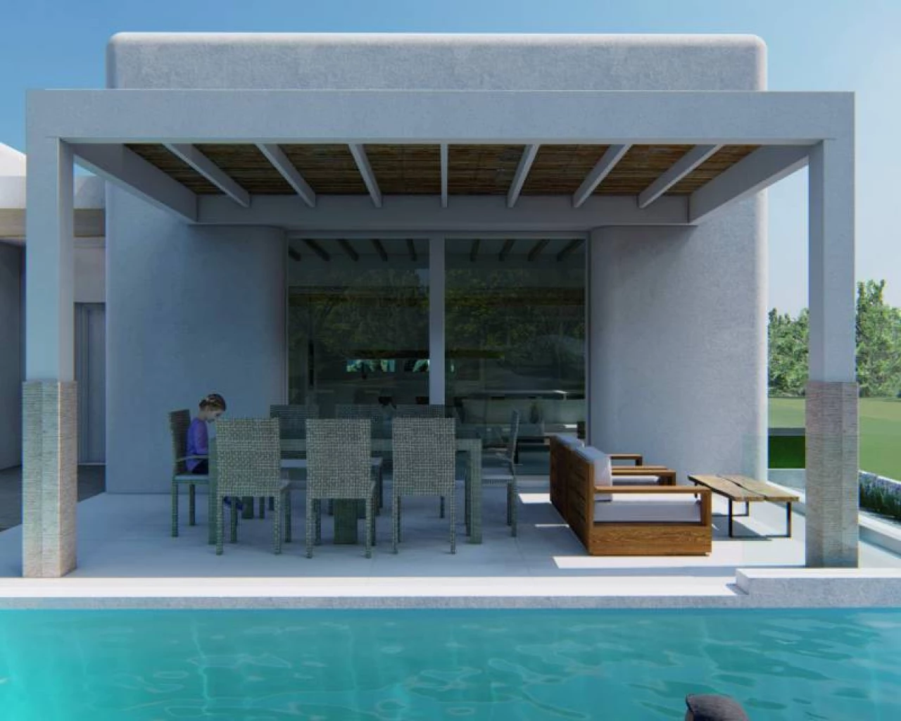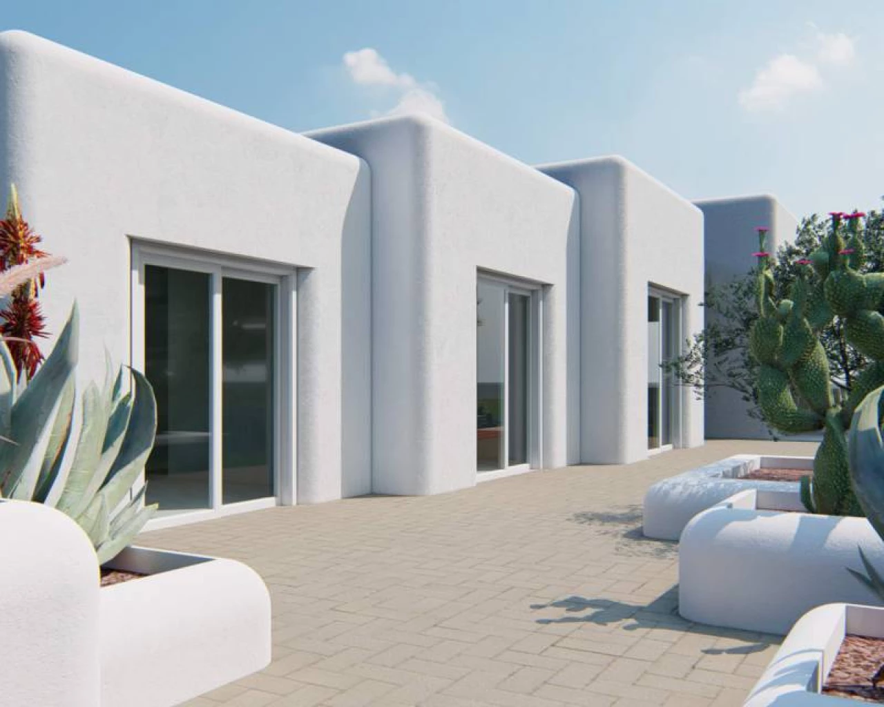 This beautiful Ibizian villa will be built in a quiet area of La Nucía about ten minutes from the idyllic beach of Albir. The house has a large living/dining room, a kitchen, 3 bedrooms, 2 bathrooms, one of which is ensuite and a laundry room. From the dining room you can reach the pergola next to the pool through a large sliding window that disappears into the wall. In this villa you can enjoy the view of the sea and the mountains in the bright sunshine on the roof terrace or cooling down from the infinity pool. The property is accessed from two different streets, with a pedestrian entrance and pergola for vehicles on the upper street, and a covered basement garage with access from the lower street.