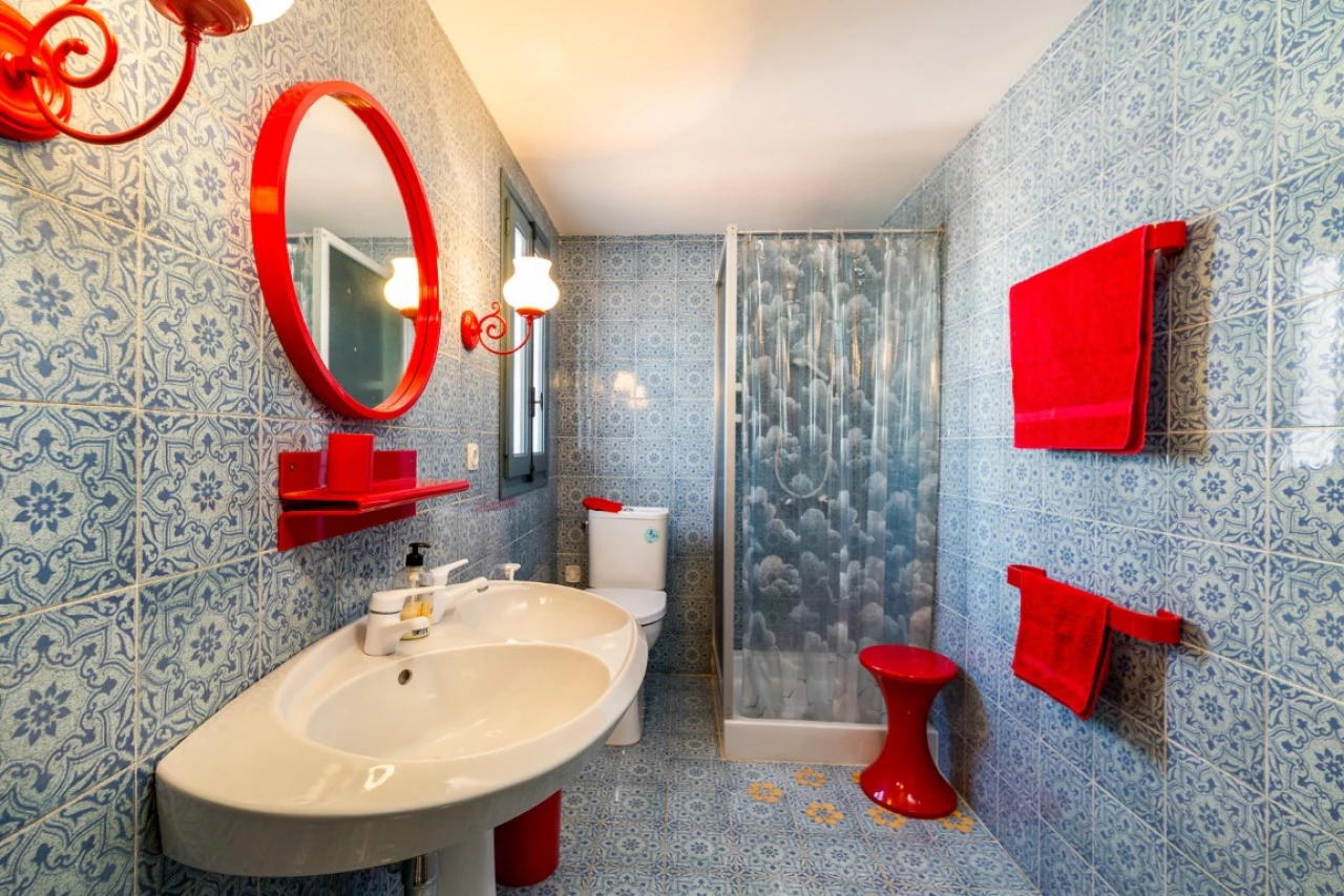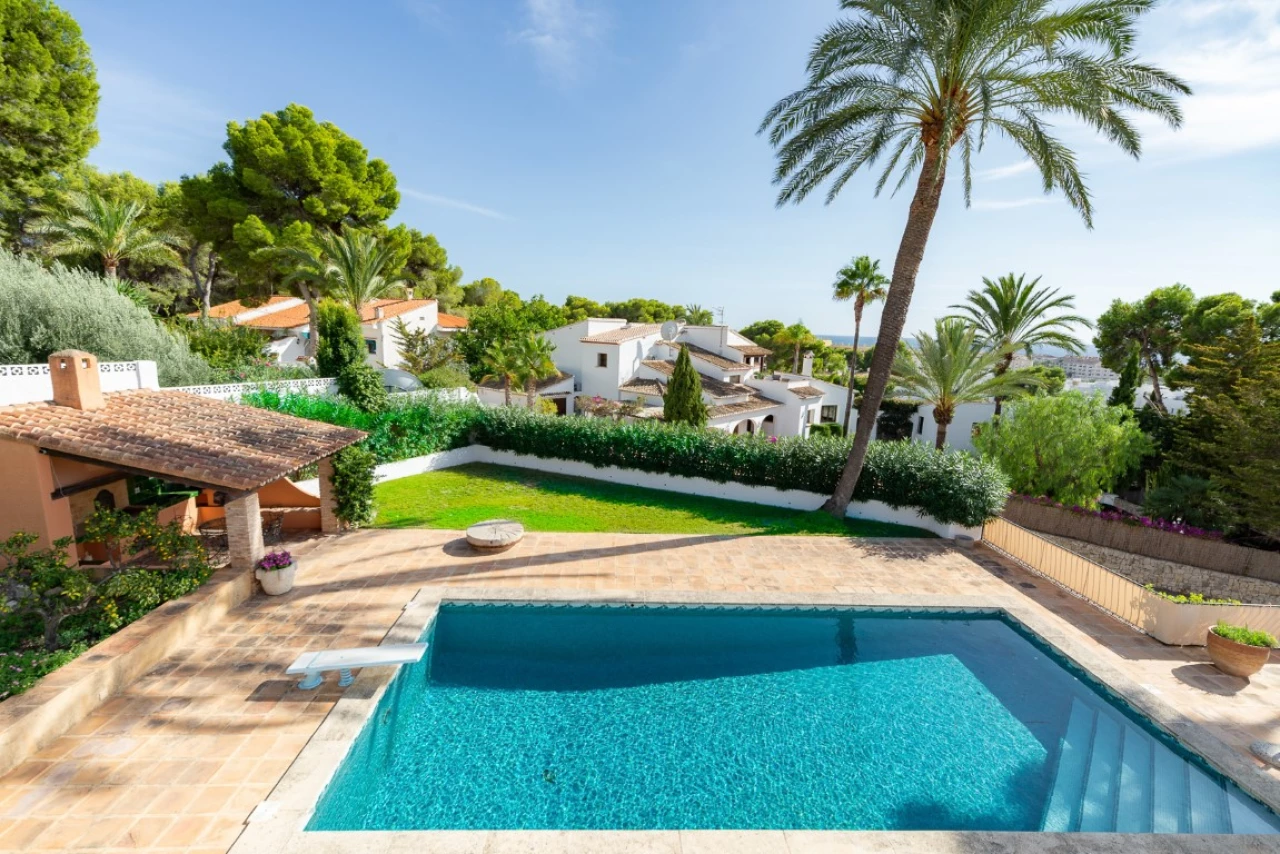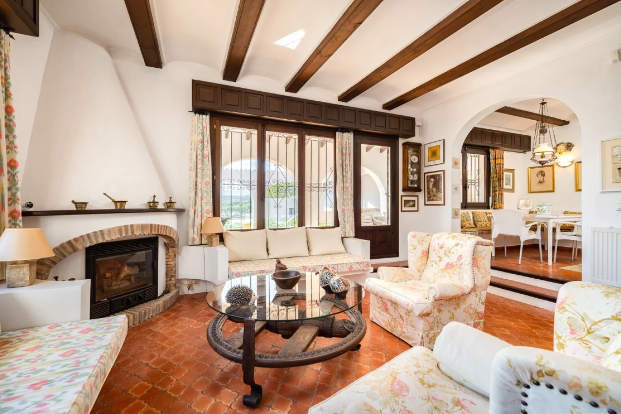 This traditional Spanish villa is located within walking distance of the village and beach of Moraira. The villa is divided over 2 floors. On the ground floor there is a lounge with dining area, a fully equipped kitchen, a laundry room and 4 double bedrooms with 4 bathrooms. On the first floor you will find the master bedroom with bathroom en suite. In the basement of the villa is a storage room and a garage suitable for 1 car. In addition to the partly covered terrace with large swimming pool, the villa offers various other seating areas in the beautifully landscaped Mediterranean garden so that you can enjoy the sun and the beautiful view throughout the day.