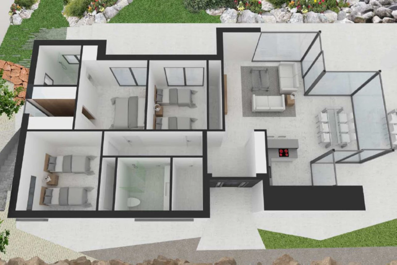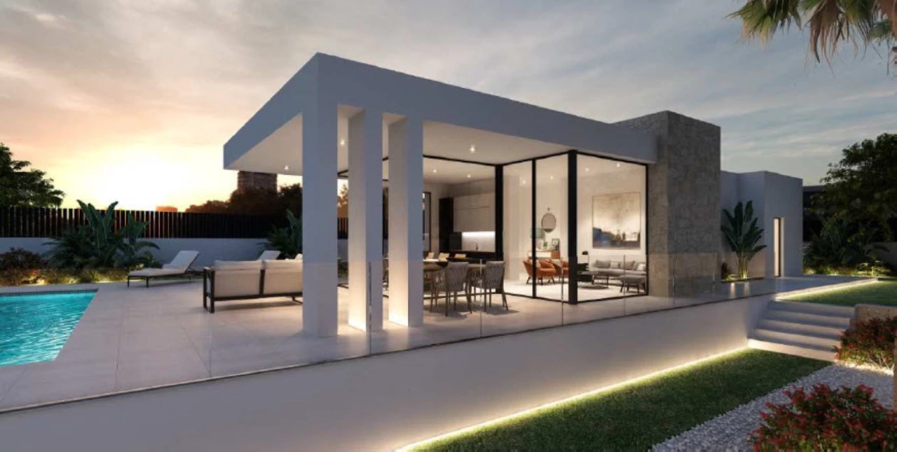 Modern new build villa with sea view for sale in Denia, situated in a quiet location in a cul de sac. On the ground floor there is a living room giving access to the terrace with pool, a fully equipped open plan kitchen, a master bedroom with en suite and 2 double bedrooms sharing a family bathroom. This project has a license and can be built in a period of 10 months.