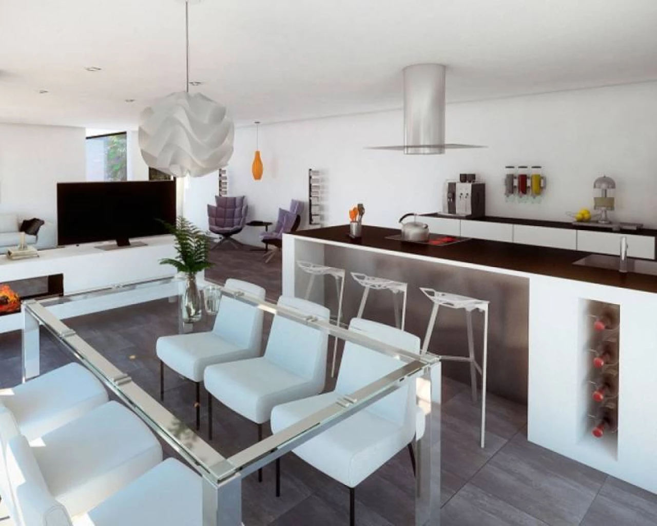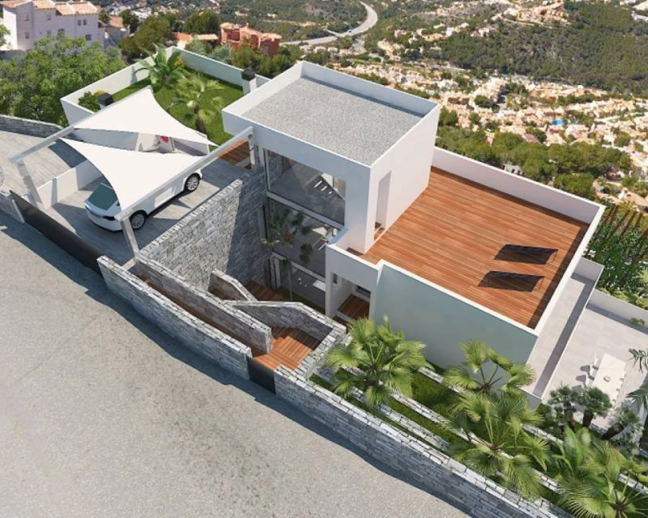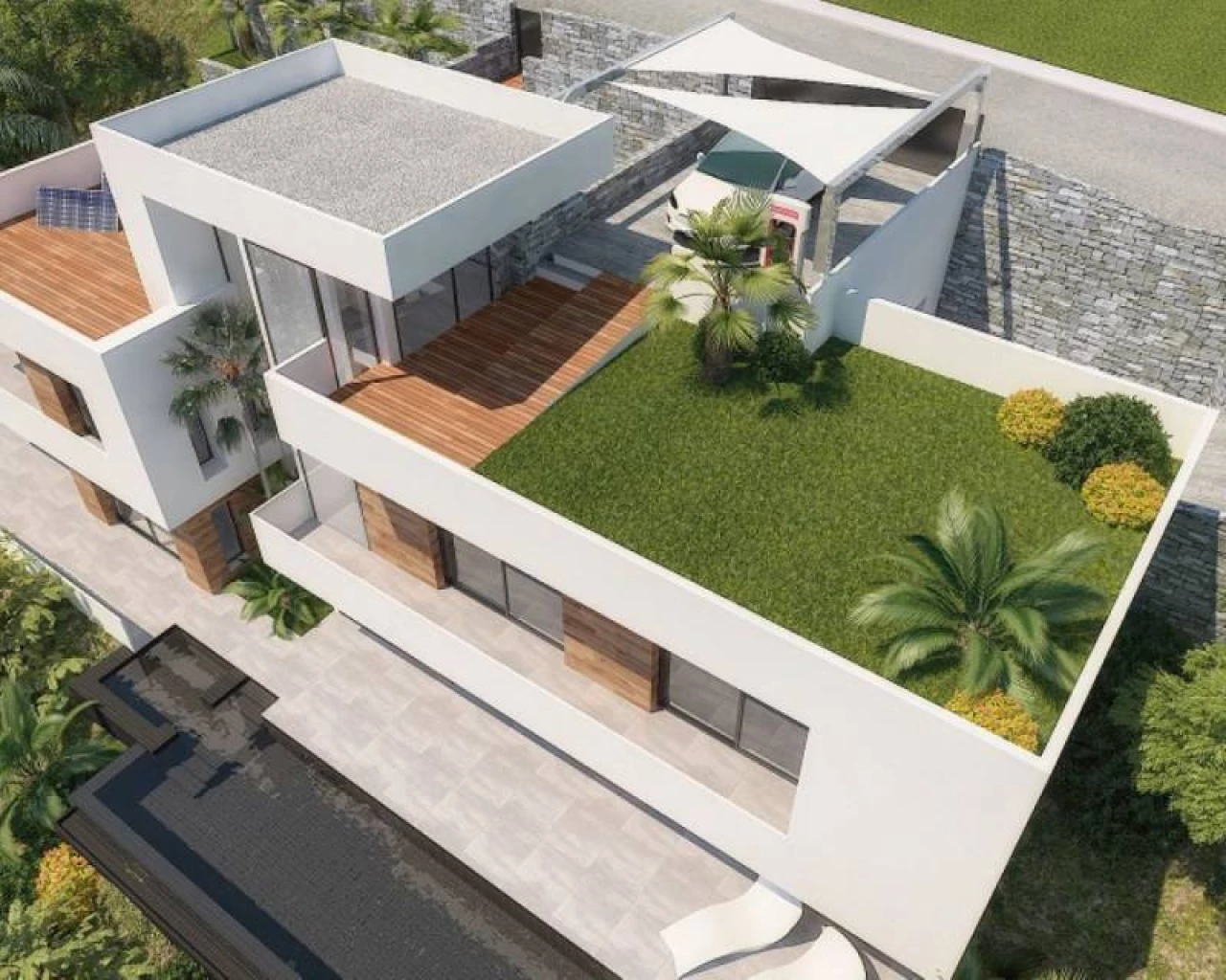 This modern villa under construction is located in a green and quiet area of Altea La Vella and offers beautiful views over the countryside and the sea. The villa has now been built shell and with the help of the current architect and builder the house can be finished further at an additional cost of 325,000 euros. The building plans and permits are available. If you choose to do this in-house, the project will be sold as it is now, including a garage instead of a carport. The villa is divided over 2 floors. On the top floor there are 3 double bedrooms and 2 bathrooms. On the lower floor you will find the spacious lounge with dining area, fully equipped kitchen and the master bedroom with bathroom en suite. There is also a guest toilet, a laundry room and a lift is planned. From the spacious partly covered terrace with swimming pool you can enjoy the beautiful views that this villa has to offer.