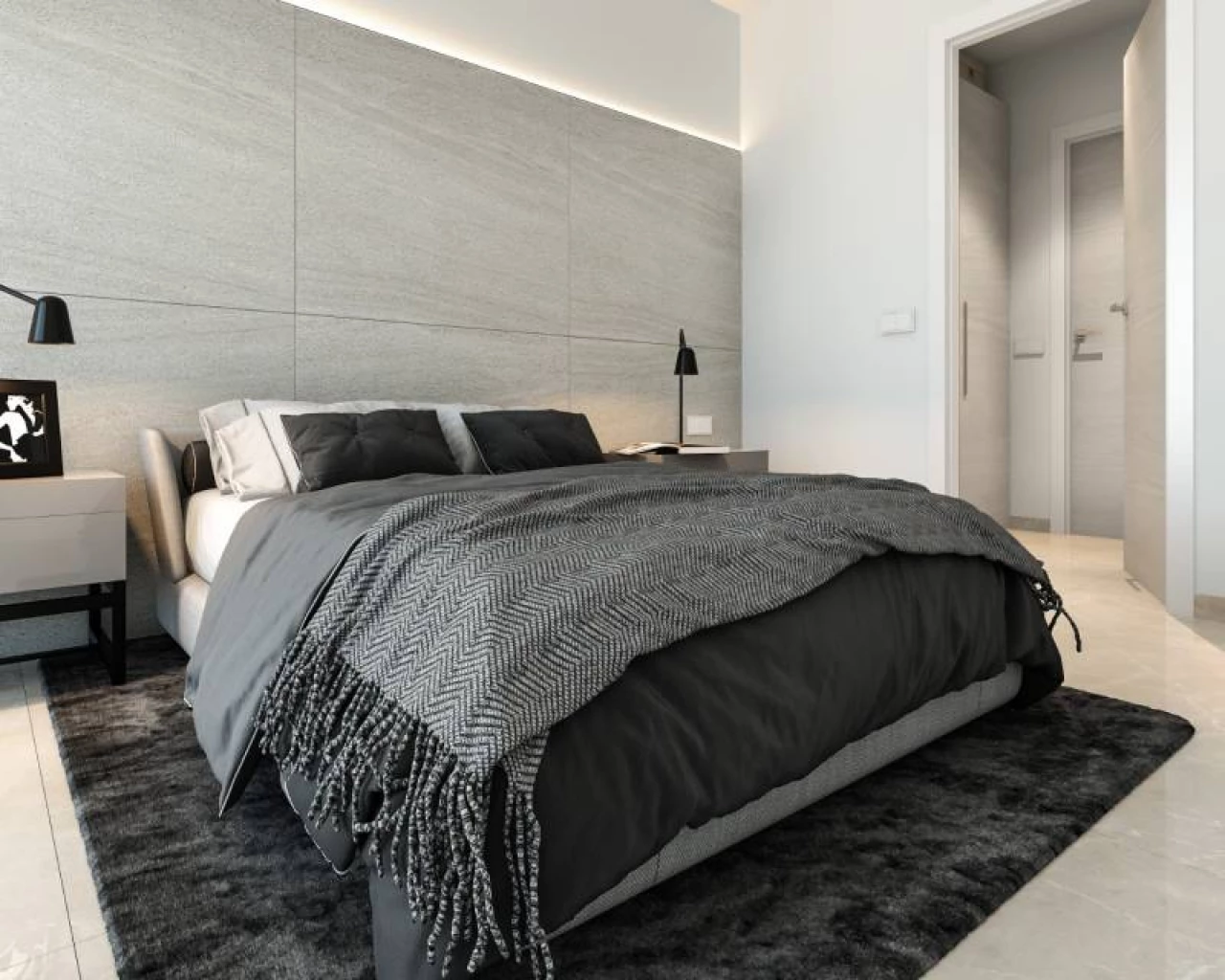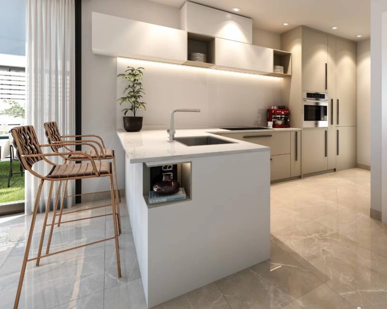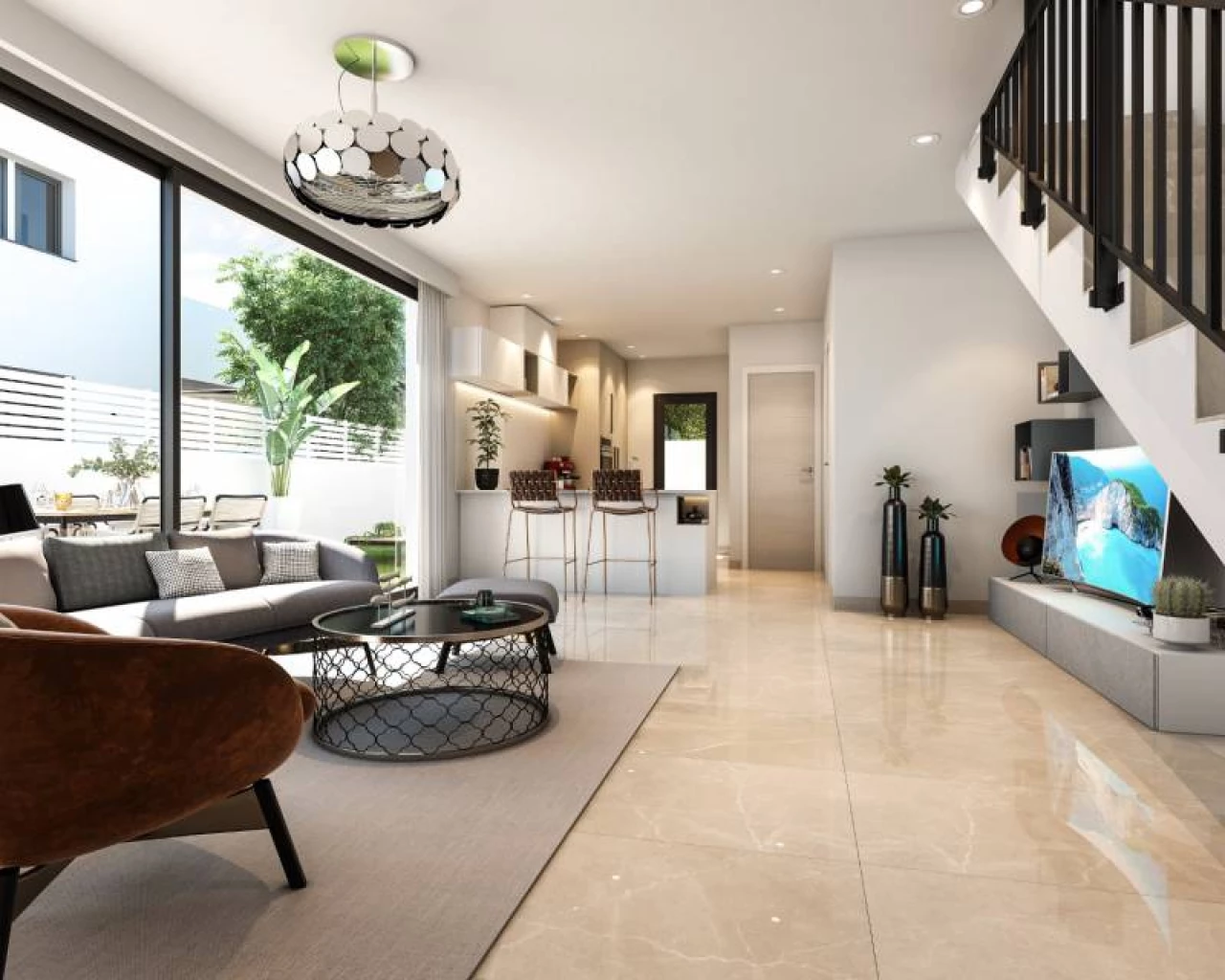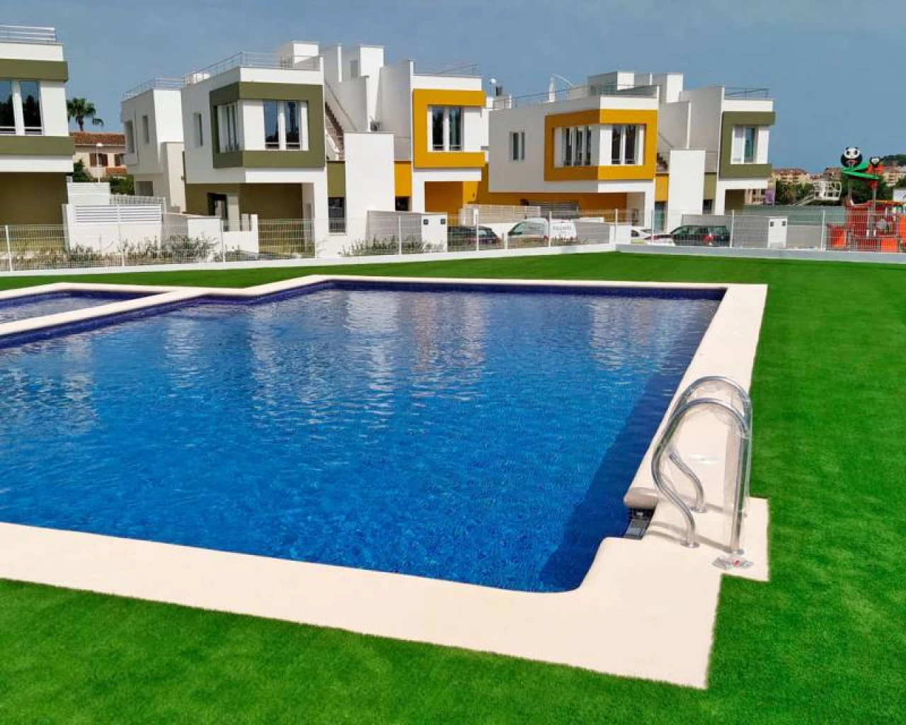 This semi-detached new-build villa is part of 12 homes that are currently under construction and of which the last 4 homes will be delivered at the end of 2021. The house is divided over 2 floors. On the ground floor there is a lounge with dining area which offers direct access to the terrace, a modern fully equipped kitchen, a double bedroom and a bathroom. On the first floor there are 2 spacious double bedrooms with bathroom en suite. The future buyer has the option of enlarging the salon on the ground floor by eliminating the double bedroom. Instead of the bathroom, the house offers a guest toilet. This semi-detached house also offers a beautiful spacious roof terrace from where you have a beautiful view of the Montgo.