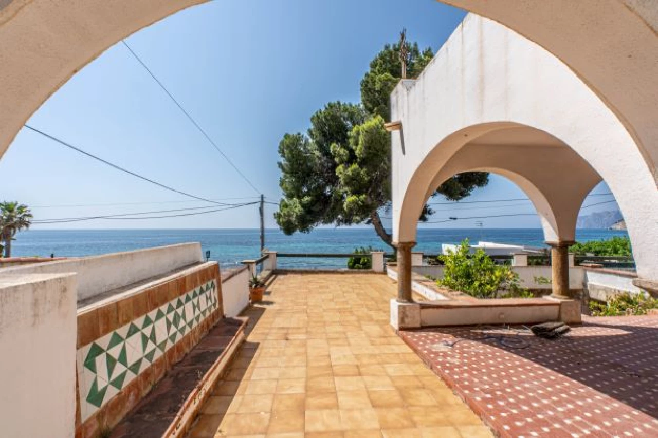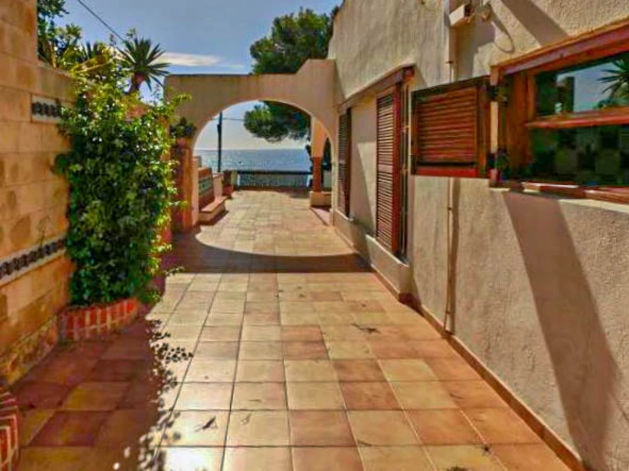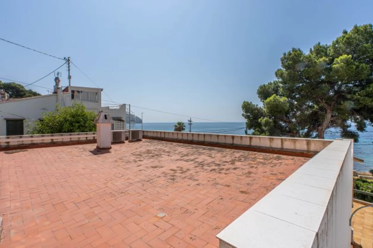 This villa is situated on the first line of the beach of Moraira at only 5 minutes walk from the village centre and the harbour. The property has a large terrace partly covered from where you have beautiful views to the sea. The property consists of a living-dining room, a kitchen, a laundry room, 5 bedrooms and 3 bathrooms. There is also a large roof terrace and a garage. The house needs renovation but you buy it because of the unique location.