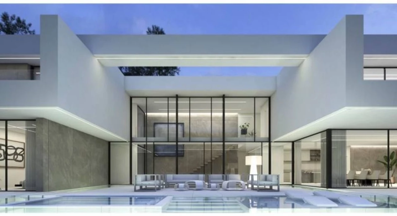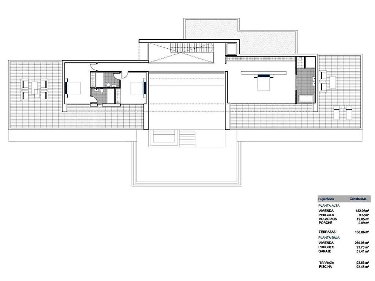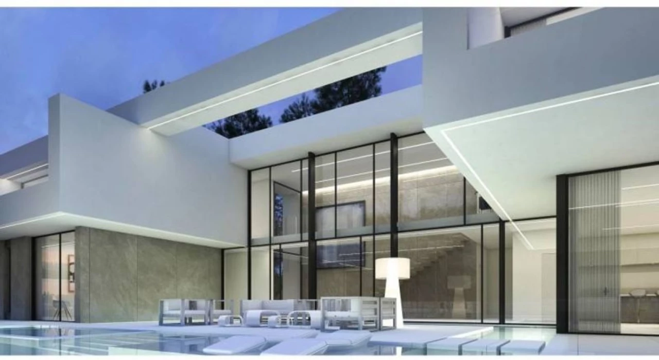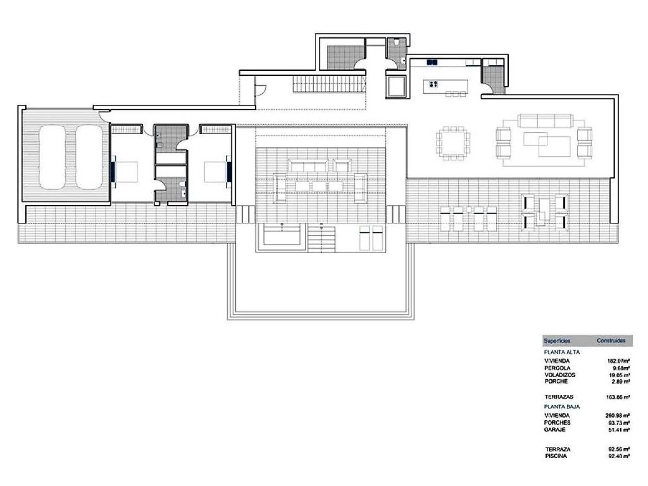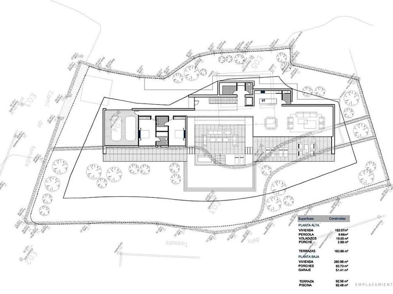This beautiful spacious modern villa is located in a quiet and green area of Moraira. The villa will be built on a plot of only almost 9000 m2, half of which is seen as building land and the other half as agricultural land. The villa is spread over 2 floors. On the ground floor there is a spacious lounge with dining area, a fully equipped modern open kitchen, a guest toilet, a laundry room and 2 double bedrooms with bathrooms en suite. There is also a garage which is suitable for 2 cars. On the top floor there are 2 double bedrooms each with their own bathroom en suite and the master bedroom with bathroom en suite. In addition to the partly covered terrace with swimming pool, there is a beautifully landscaped garden with various seating areas from where you can enjoy the unique views.