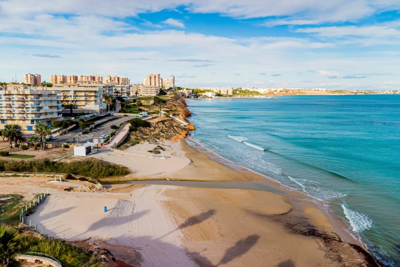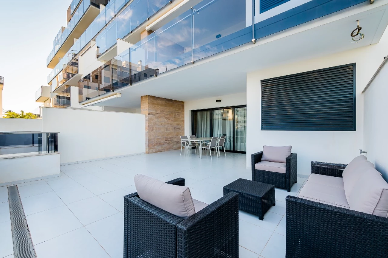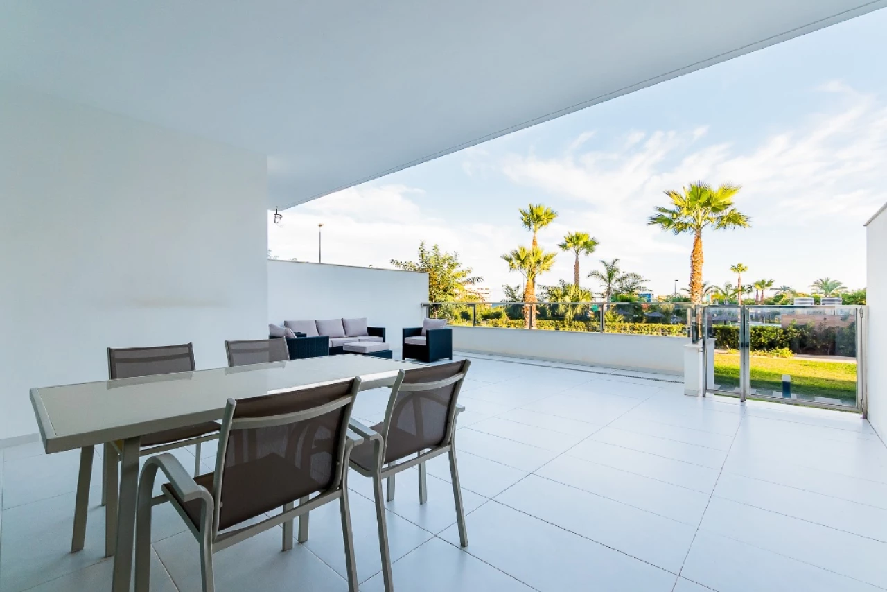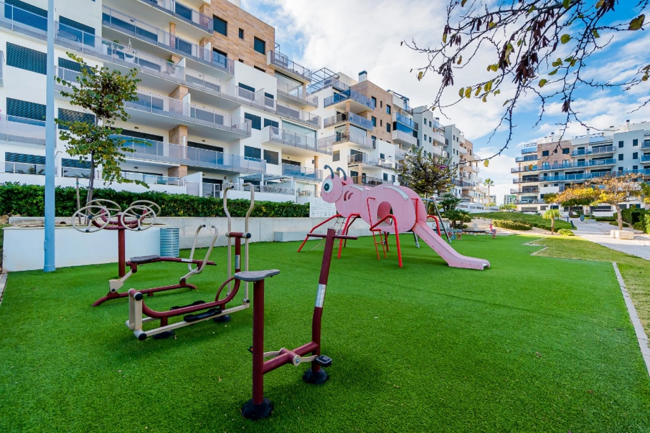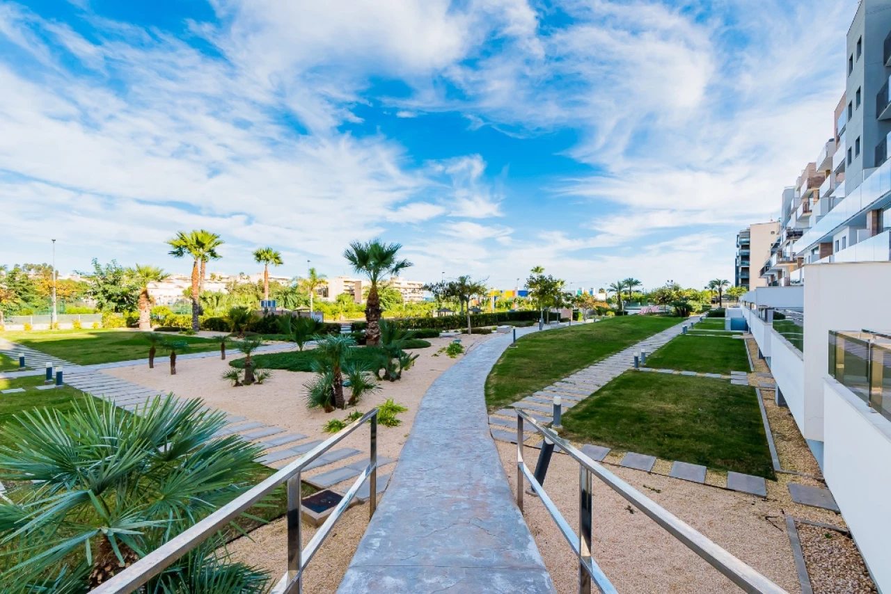 New beachside apartment for sale in Mil Palmeras, Costa Blanca, Spain.The apartment for sale is made of high quality materials according to the most modern standards. Spacious living rooms and terraces with lovely views, kitchen with utility room. The residential complex has a swimming pool with surrounding green areas and underground parking, gym and green areas.The residential complex is located on the beach of Mil Palmeras, which means "a thousand trees", in the prestigious tourist area on the Orihuela Costa South.Just a 35-40 minute drive from the international airports of Alicante and San Javier, as well as the cities of Murcia, Cartagena and Elche.