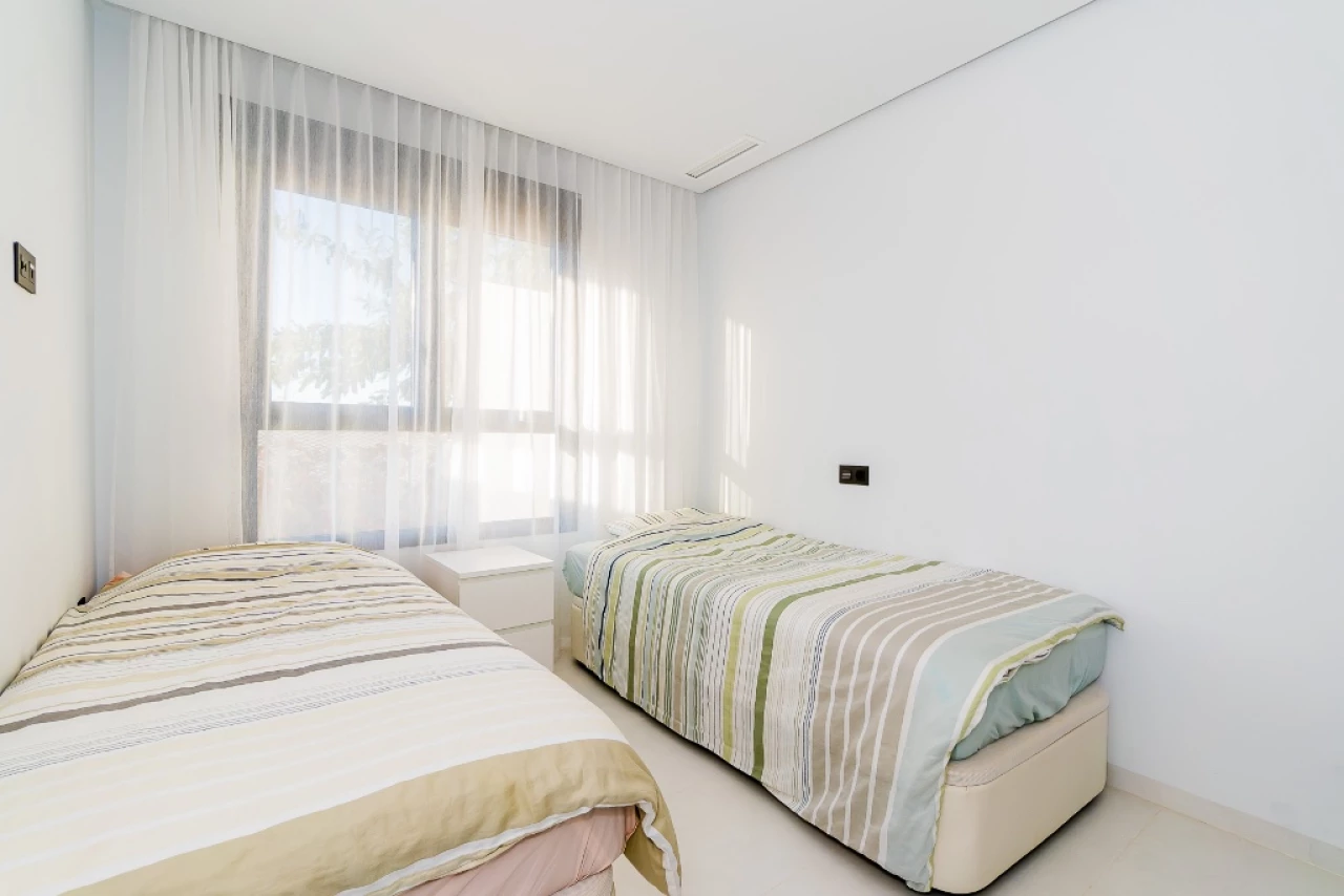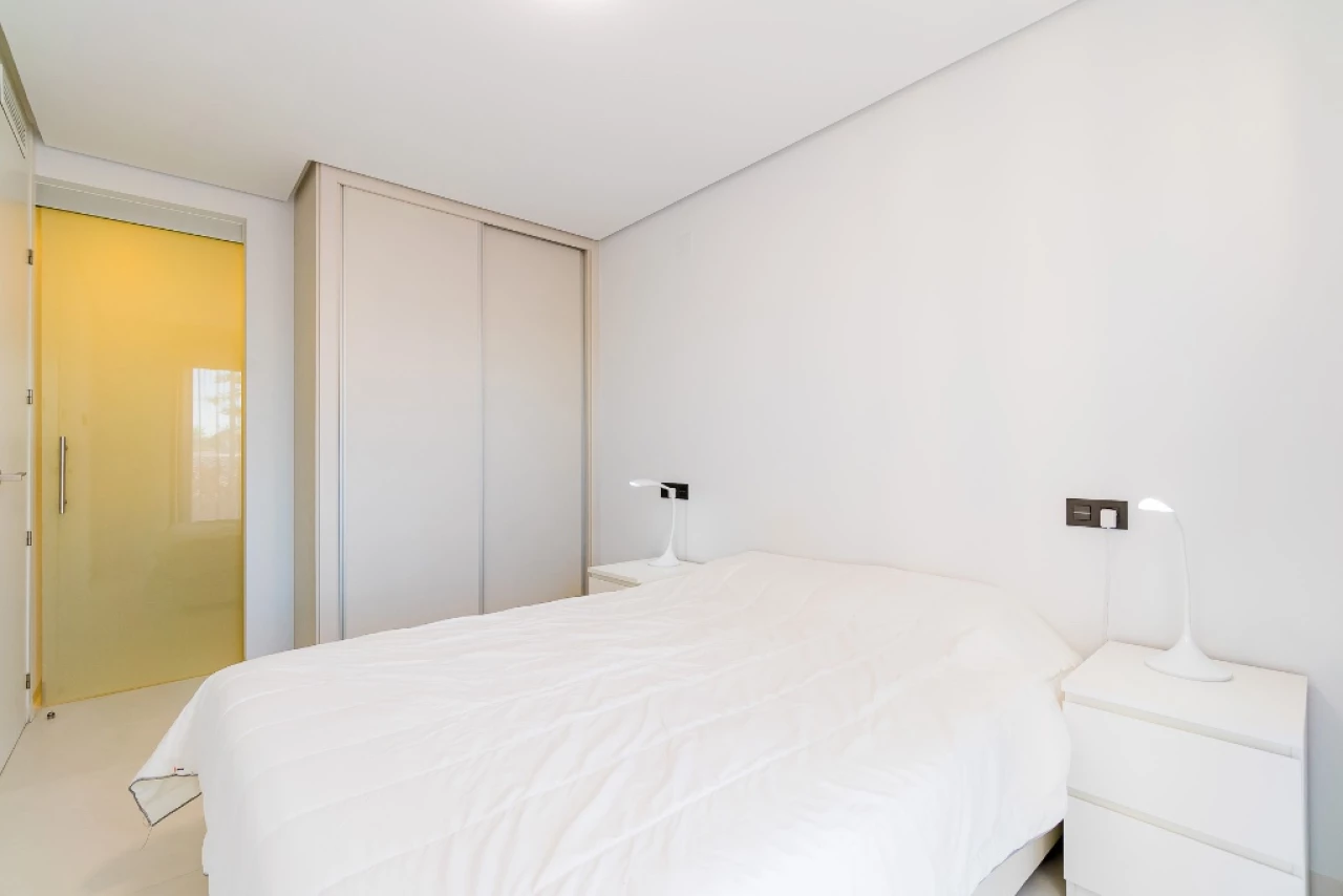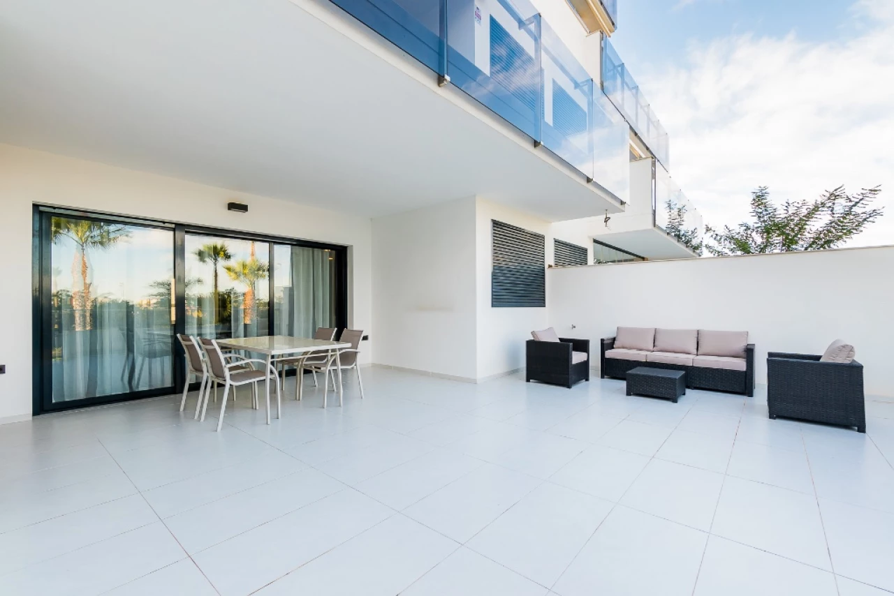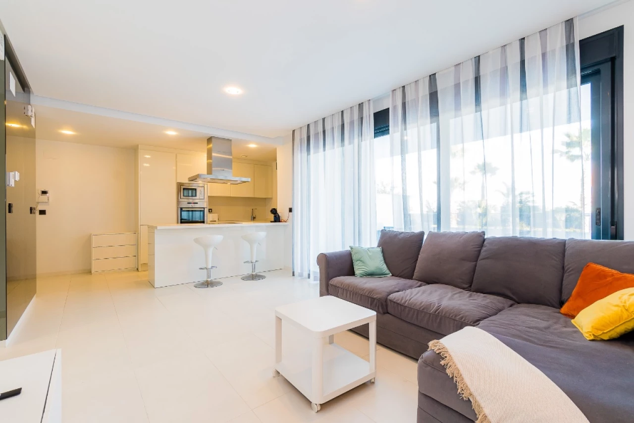 New beachside apartment for sale in Mil Palmeras, Costa Blanca, Spain.The apartment for sale is made of high quality materials according to the most modern standards. Spacious living rooms and terraces with lovely views, kitchen with utility room. The residential complex has a swimming pool with surrounding green areas and underground parking, gym and green areas.The residential complex is located on the beach of Mil Palmeras, which means "a thousand trees", in the prestigious tourist area on the Orihuela Costa South.Just a 35-40 minute drive from the international airports of Alicante and San Javier, as well as the cities of Murcia, Cartagena and Elche.