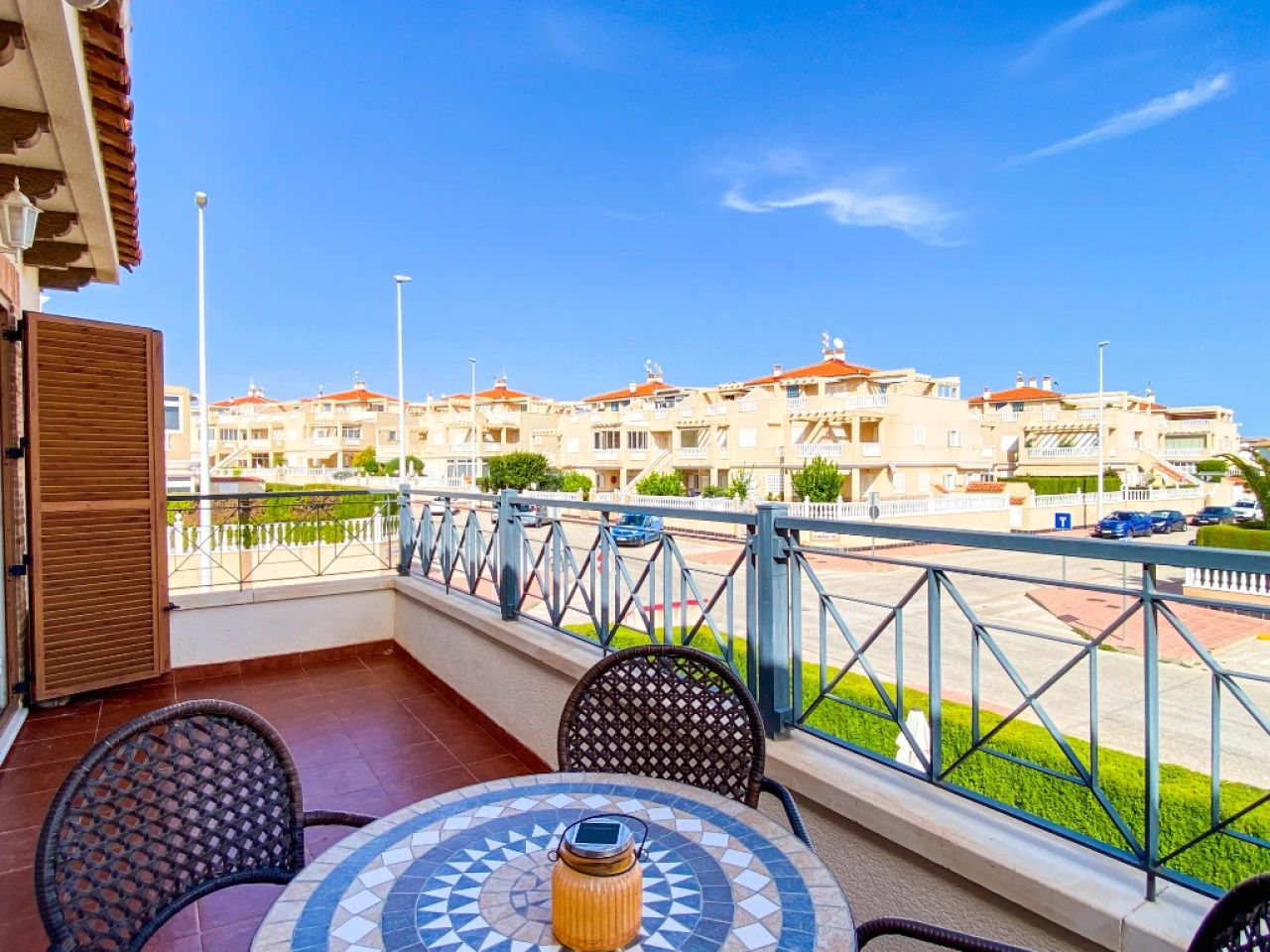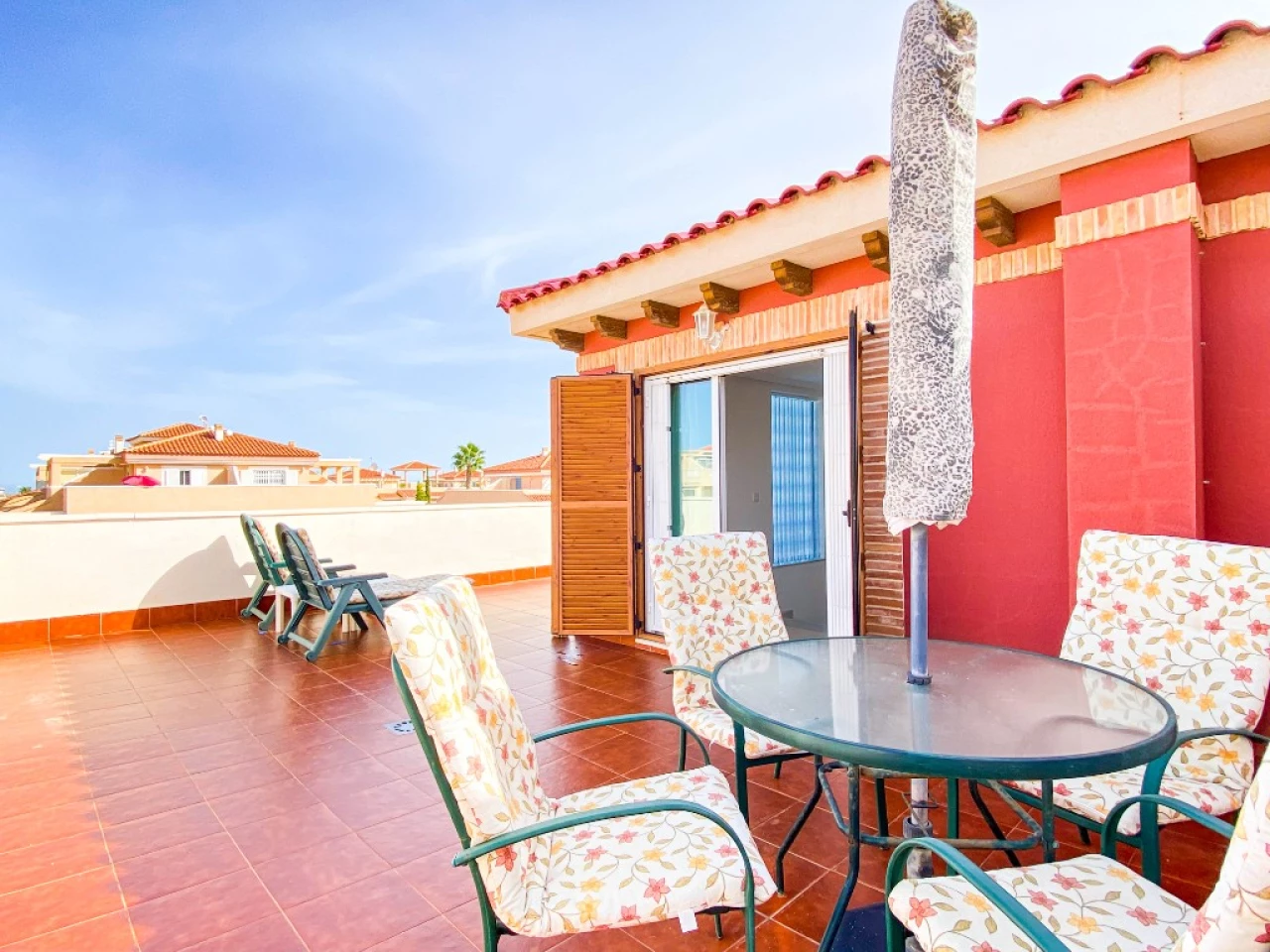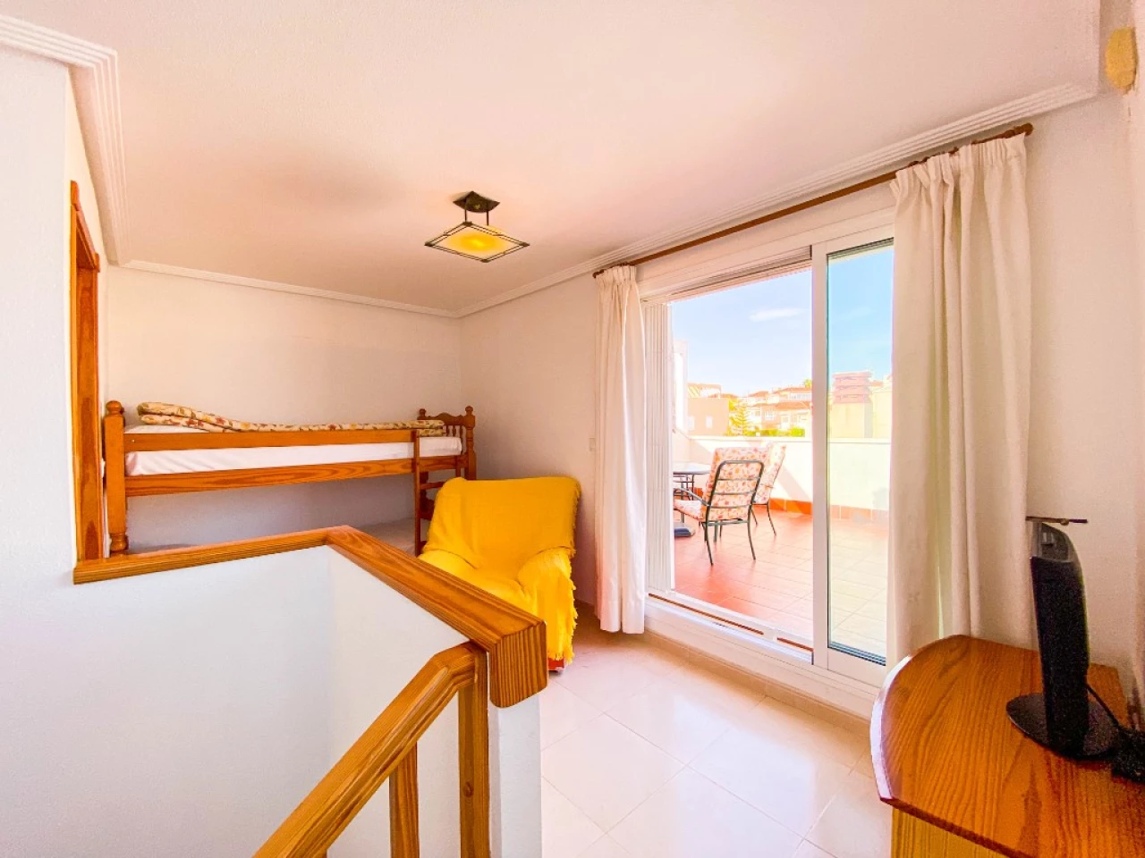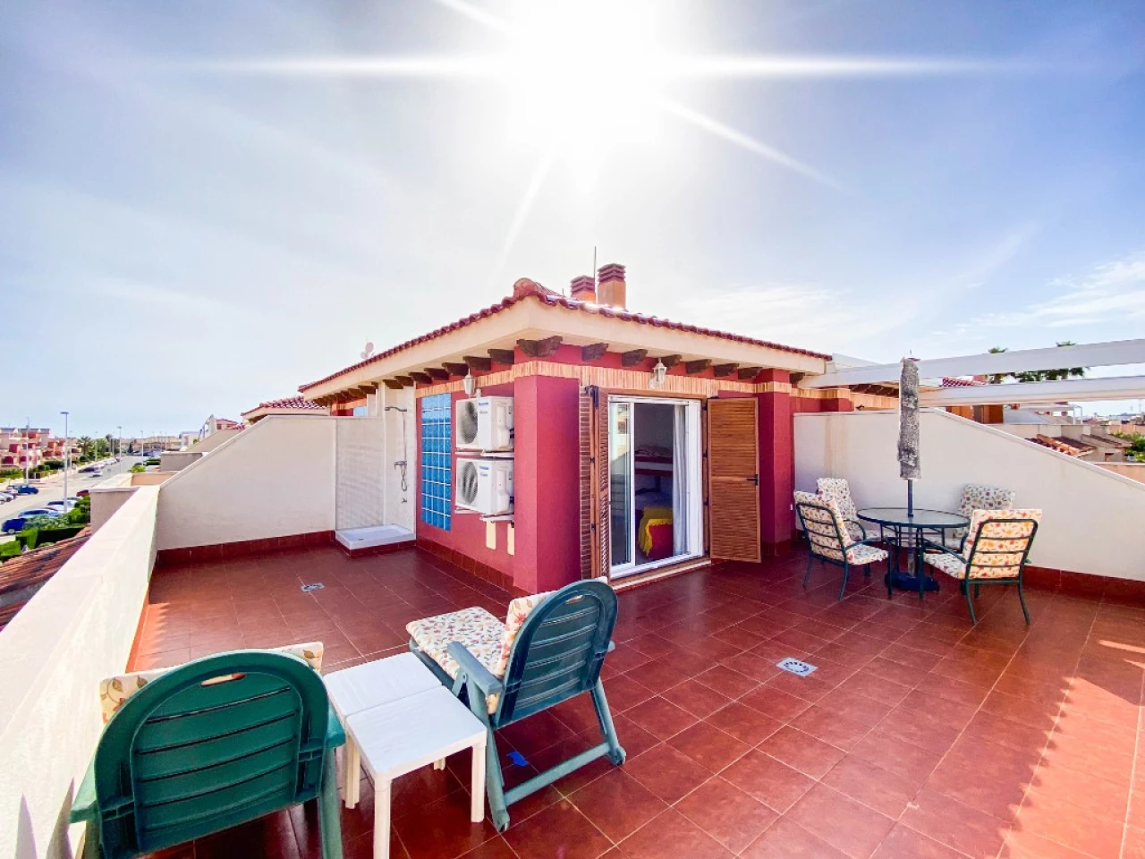 For sale an apartment (penthouse) in a gated complex Zeniamar 8 with open views.On the first level, the apartment has 2 bedrooms with built-in wardrobes, a bathroom, a fully equipped open kitchen with a breakfast bar, a storage room under the steps (with a built-in safe inside) and a living-dining room with access to a spacious balcony.On the second level there is another open bedroom, a bathroom and, of course, a huge private solarium. Thanks to the good location of the apartment, from the top terrace you can enjoy beautiful open views, the warm Spanish sun and even take a refreshing shower.Zeniamar is one of the most beautiful urbanizations in Playa Flamenca. The complex is closed and guarded, inside for the comfort of residents there is a magnificent swimming pool with green spaces, walking paths, there is also a gym. Necessary infrastructure - shops, bars, restaurants, pharmacies, parks, etc. - located a few minutes from the complex, and to the sea - about 30 minutes of leisurely walking.Every year, the Playa Flamenca area, which is located in the south of the Costa Blanca, attracts more and more tourists, thanks to the mild Mediterranean climate, friendly locals and the cleanest beaches, which are awarded the Blue Flag every year. This is an ideal place for both investment and permanent residence.The nearest airport is Alicante, 40 minutes away.Features: