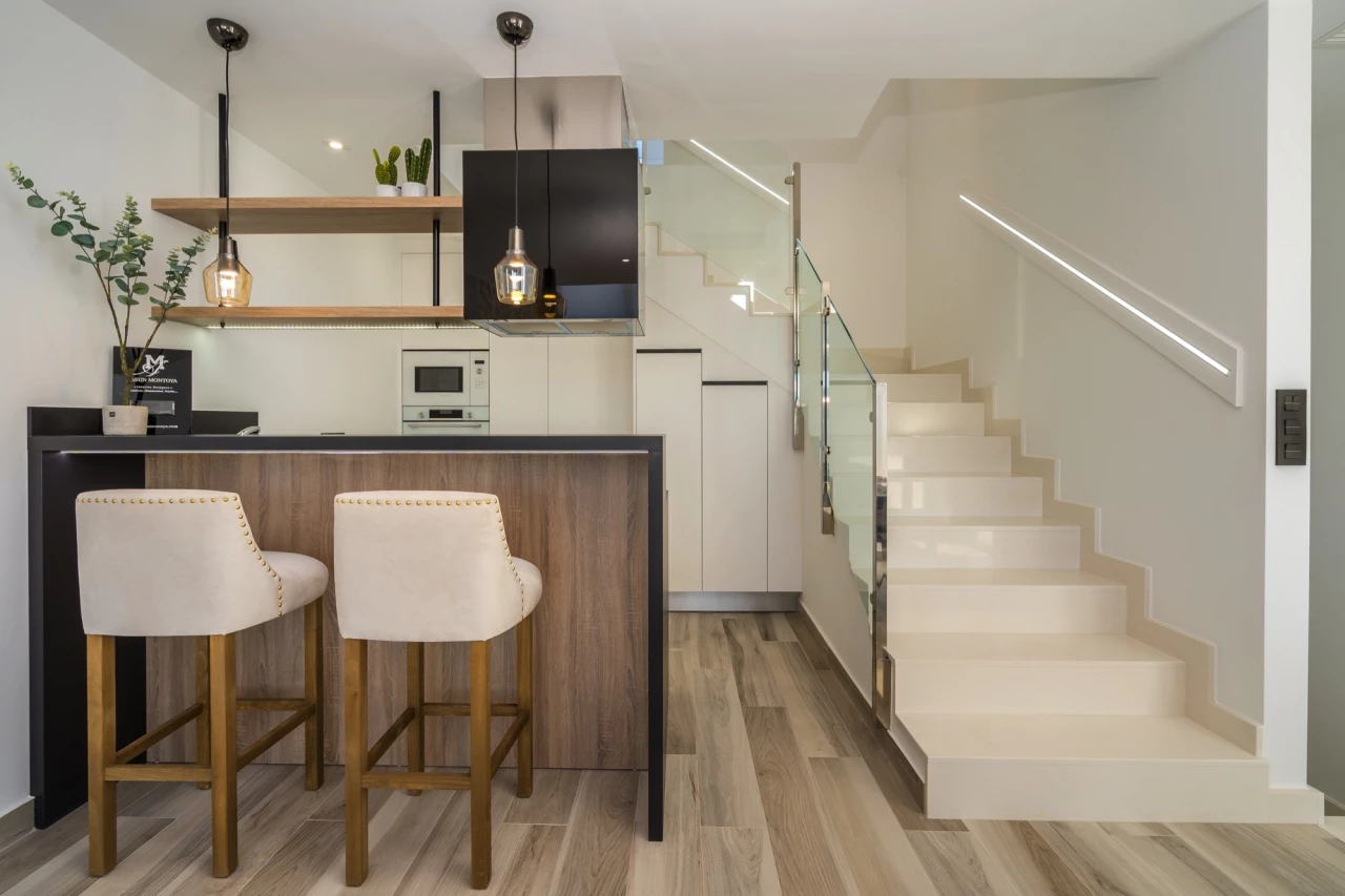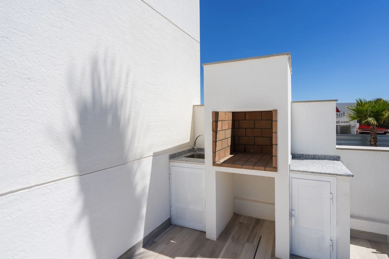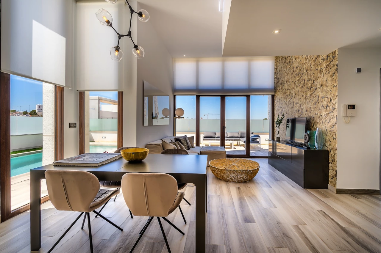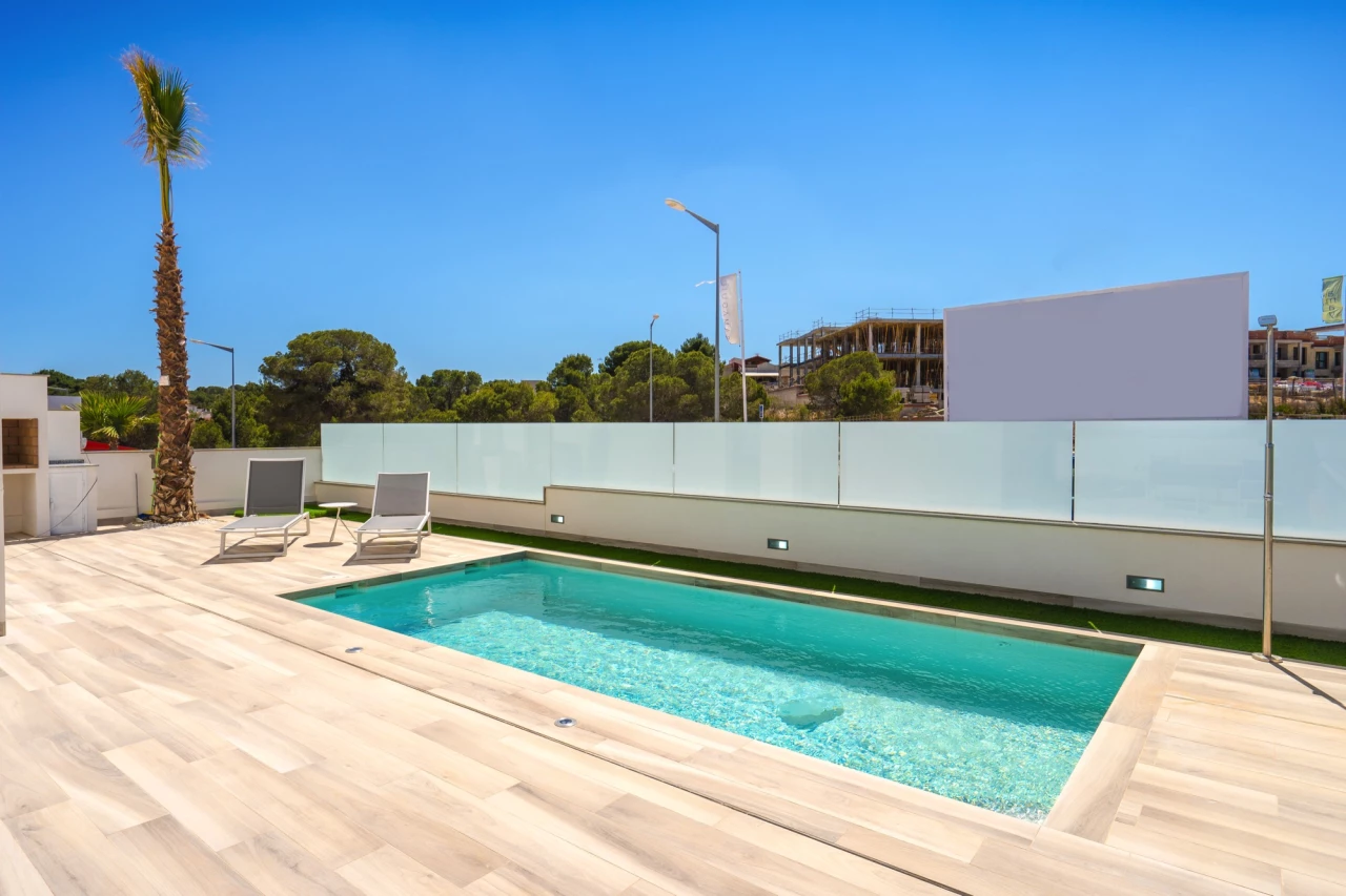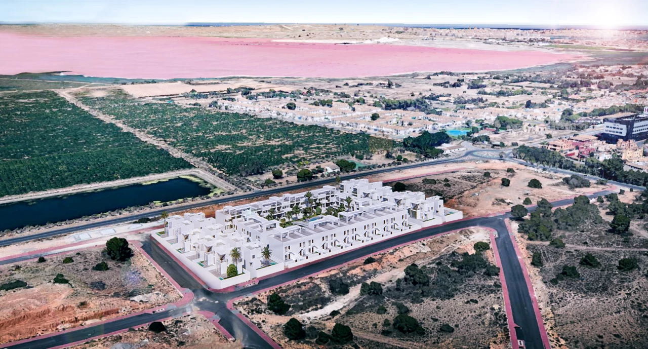This exclusive new development, Laguna Beach Resort (Prices from 349,900 Euros), is a gated residential area in Torrevieja, with stunning views over the Mediterranean and Salt Lakes. Close to the beach, local bars, restaurants, supermarkets, schools, services and sporting facilities. Close to Villamartin, Las Ramblas and La Finca Golf Resorts, this resort is in the perfect location to cater for all the family's requirements as a home/holiday home). This is a small development of ground floor and first floor apartments and detached villas. The 3 bed, 3 bath villas have the following key features:- Build size 165 m2 Plot size 263 m2 Private pool (6m x 3m) Roof Solarium with shower and sink (46 m2) Sun terrace 23 m2 Open plan lounge/dining/fully fitted kitchen Fully fitted bathrooms including shower screen and mirror Flooring and tiling (interior and exterior) Satellite TV installation Air conditioning Communal pool and garden area (including a children's area and hammock area) Open views Basement 74 m2 (fitted version optional to include living area/a 4th bedroom + utility room) Garage Furniture pack up to the value of 7,000 Euros included! Contact us for more information!