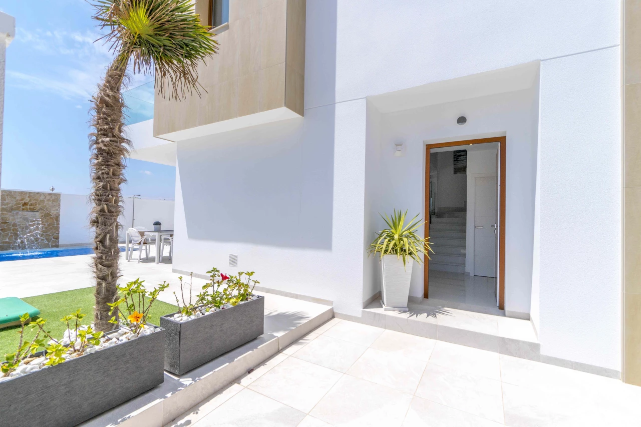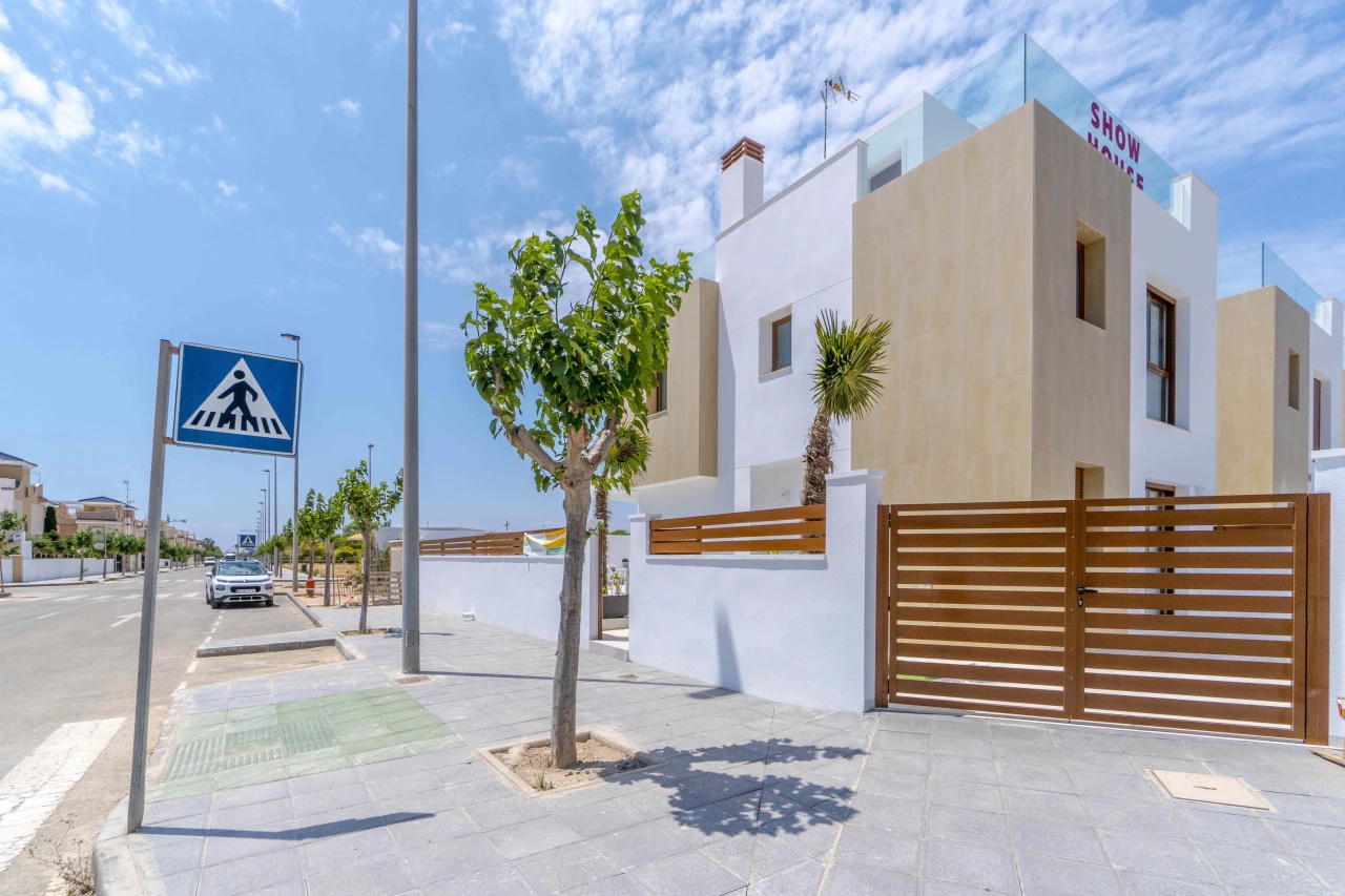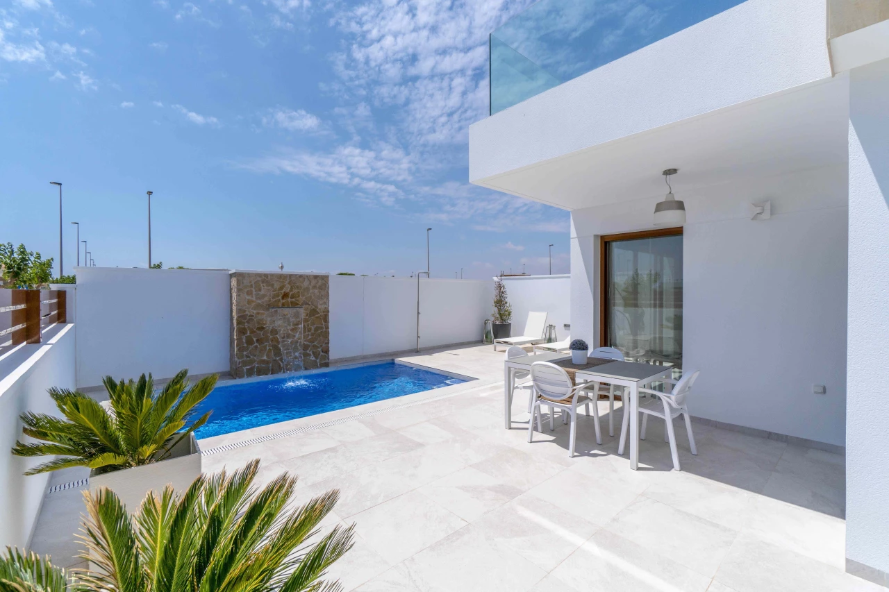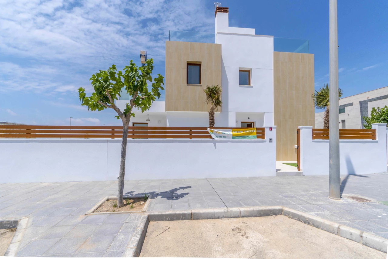 Description: Villa Beach Residential is located in one of the most beautiful places of the Costa Blanca, between Torre de la Horadada and Pilar de la Horadada. We invite you to live at this beautiful location at only 300m to the beach and just 1km to El Pilar de la Horadada, surrounded by all the amenities you would need such as two shopping centers (La Zenia Boulevard and Dos Mares) and several golf courses (Lo Romero, Villamartin, Roda, Mar Menor). Enjoy the sun in this area of Spain with more than 2500 hours of sunshine a year, with a temperature average of 18 - 20ºC and over 4 km of spectacular beaches on your doorstep. Furthermore, Villa Beach is surrounded by green areas, promenades, restaurants and bars, making this place an ideal place to live the whole year round. Luxury Villas with Sea Views • New development composed by 21 detached villas with private pool. Only 300m to the "Higuericas" beach, a wide and white sandy beach with lots of beach/bar restaurants. These properties are a 'must see'. 134m2 built size with top quality materials. Detached villas built in plots of 200m2. Private pool with waterfall and stone wall. Private garden and parking. Wide living room - kitchen of 41m2 with pool views. 3 Bedrooms (1 bedroom ground floor) and 3 Bathrooms (2 ensuite). Dressing room finished. Wide Solarium of 41m2. Semi basement used as a laundry room and storage room. Pre-installation of underfloor heating in the whole villa by water system Electric blinds. Double glazing 2 security doors. High-quality interior and exterior tiling Tiling anti-slip exterior. Exterior and interior lights included Fully fitted kitchen with appliances Air conditioning Furniture pack up to the value of 5,000 Euros is included in the price! Gift voucher for 10,000 Euros for reservations before 31st August 2021! Contact us today for more information!