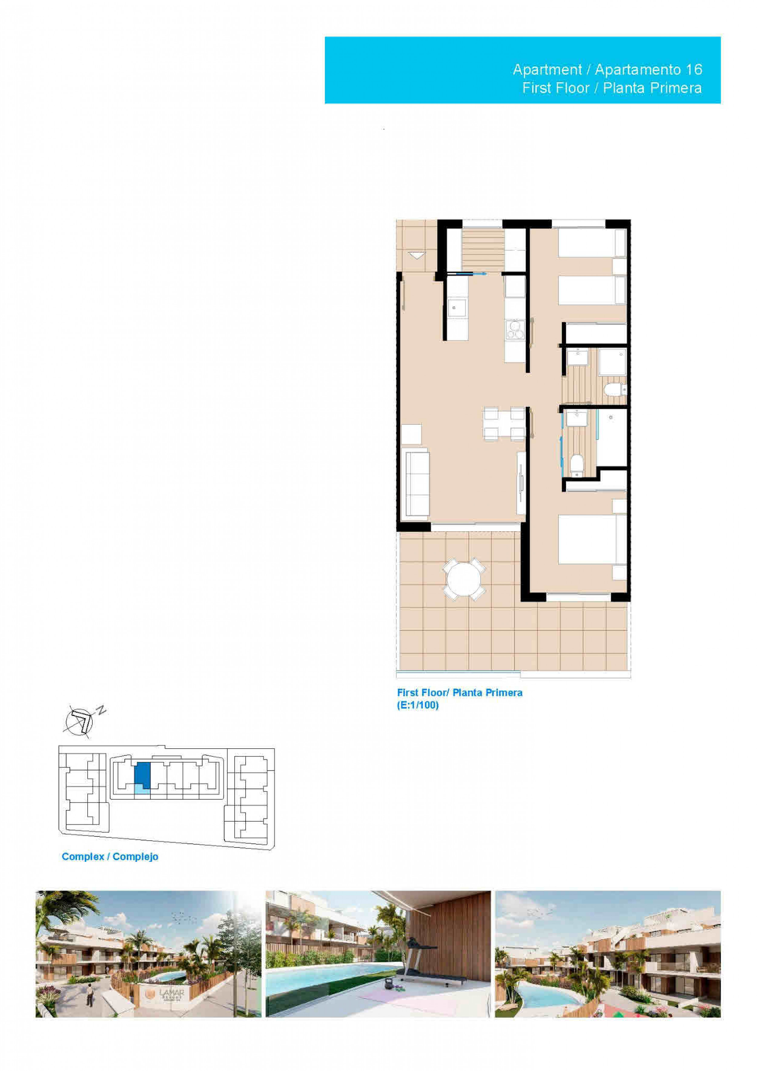 This new build development is a luxury complex composed of 34 apartments, distributed in 3 blocks, with community pool, jacuzzi, gym, playground and garage with storage room. Ground floors have large gardens, first floors offer terraces and penthouses feature a solarium with jacuzzi. Ready December 2023. Each property has 2 or 3 bedrooms and 2 fitted bathrooms. The properties have been designed with a contemporary style and an open planned concept, consisting of a fully-fitted kitchen and lounge-dining room. The development is located in Pilar de la Horadada, Alicante, surrounded by all services, sports facilities, near several Golf Courses and 5 minutes from the Mediterranean Sea. The properties will meet the highest standards and will be equipped with: Community swimming pool. Community jacuzzi. indoor gym in front of swimming pool. Playground area. Kitchen completely furnished and equipped with oven and microwave in column, dishwasher, fridge, induction hob, extractor fan and washing machine. LED Lighting: inside the property (dining room, kitchen, corridors and bathrooms), as well as indirect lighting in outdoor areas. Lined wardrobes with drawers. Fully fitted bathrooms with suspended vanity unit, suspended toilet, mirror, rainfall shower and shower screens. Heated floors in bathrooms. Pre-installation for ducted air conditioning. Summer kitchen in solarium on the top floors, built-in pergola, jacuzzi and artificial grass. Parking space and storage room in the basement. Lift from basement to penthouses. Pilar de la Horadada is located south of Alicante. The town and its neighbouring beach town Torre de la Horadada has many shops, bars and restaurants to choose from. Easy access to the motorway running right up and down the coast. Torre De La Horadada is located on the Mediterranean sea and lies north of the Mar Menor. Torre De La Horadada comes under as the coastal town of Pilar De La Horadada. The town is well known for its beautiful blue flag beaches with fine sand and crystal clear waters. Torre De La Horadada marina has plenty of tapas bars, fish restaurants, ice cream parlours with views across the Mediterranean sea. You can walk along the promenade to the next town “El Mojon”. Just around the corner from the Marina there is a busy square with a wide selection of English/Spanish bars, restaurants, shops etc. Local markets are held on a Wednesday in summer season and on a Friday in Pilar De La Horadada. Torre De La Horadada is well connected with the motorways to Alicante and Cartagena/Murcia. Only 5-10 minute drive to a variety of golf courses. Bus service running along the coast up to Alicante and down to Cartagena. Local hospitals in nearby Torrevieja and San Javier. Good choice of both local and international schools close by.