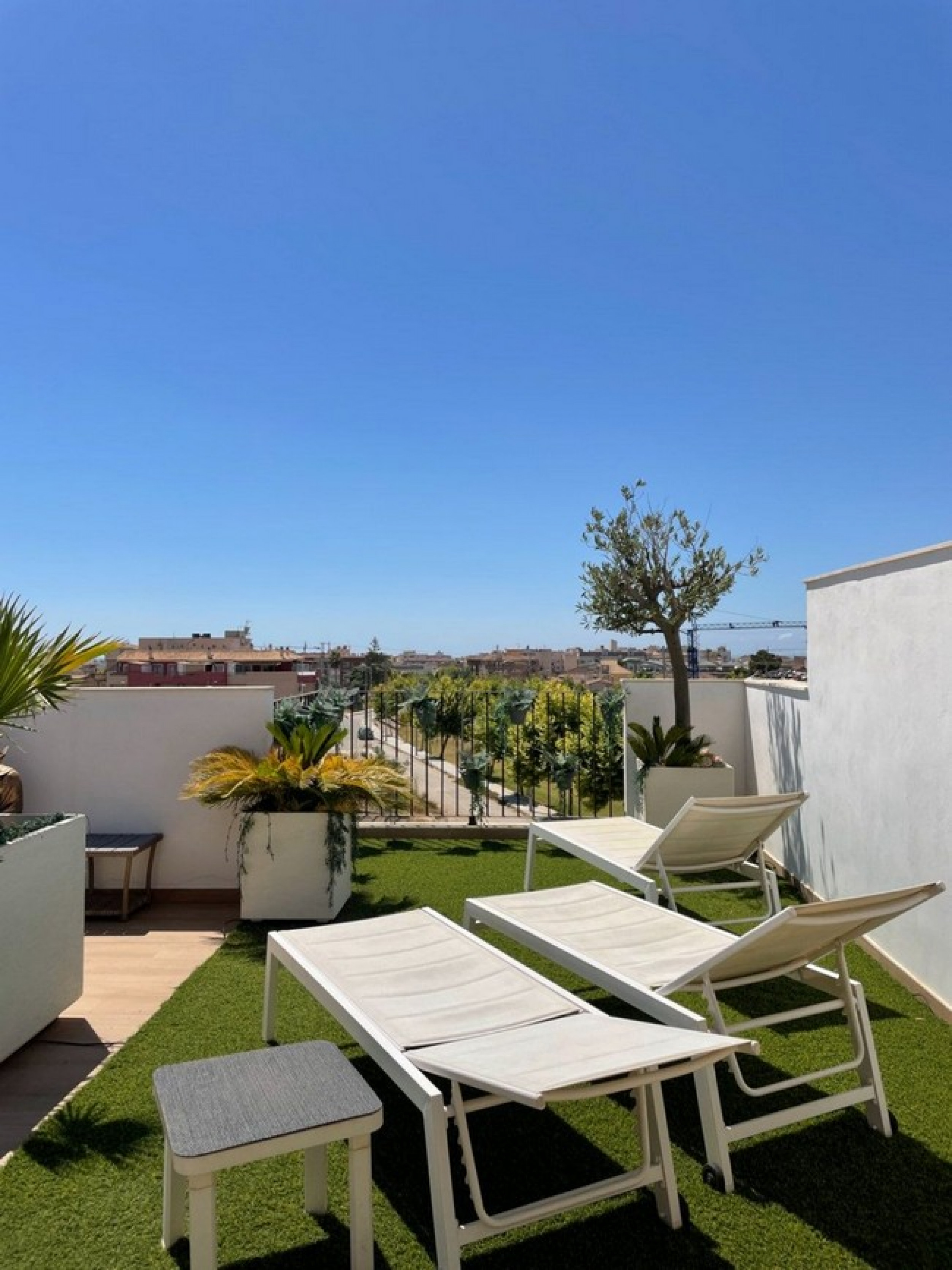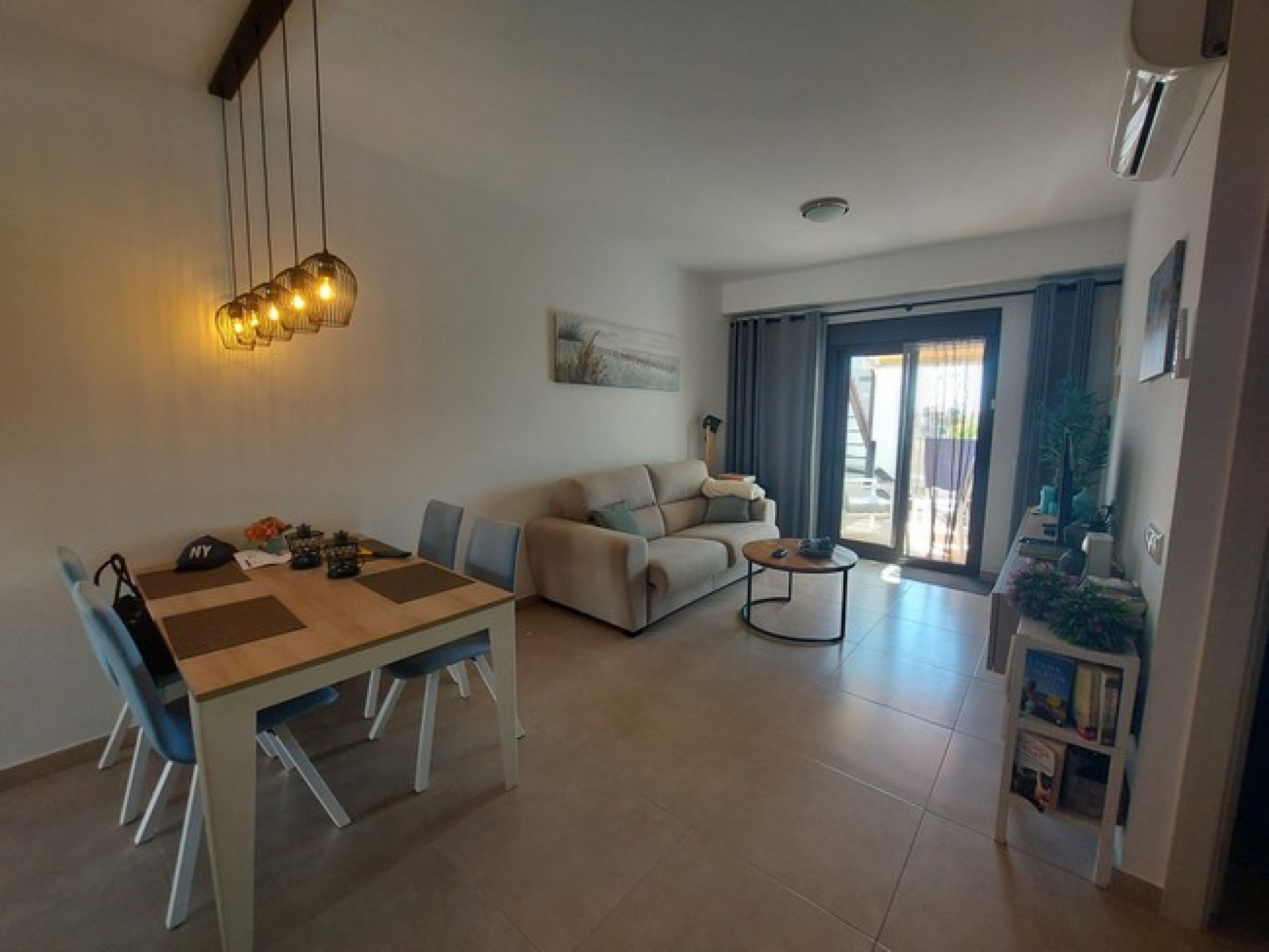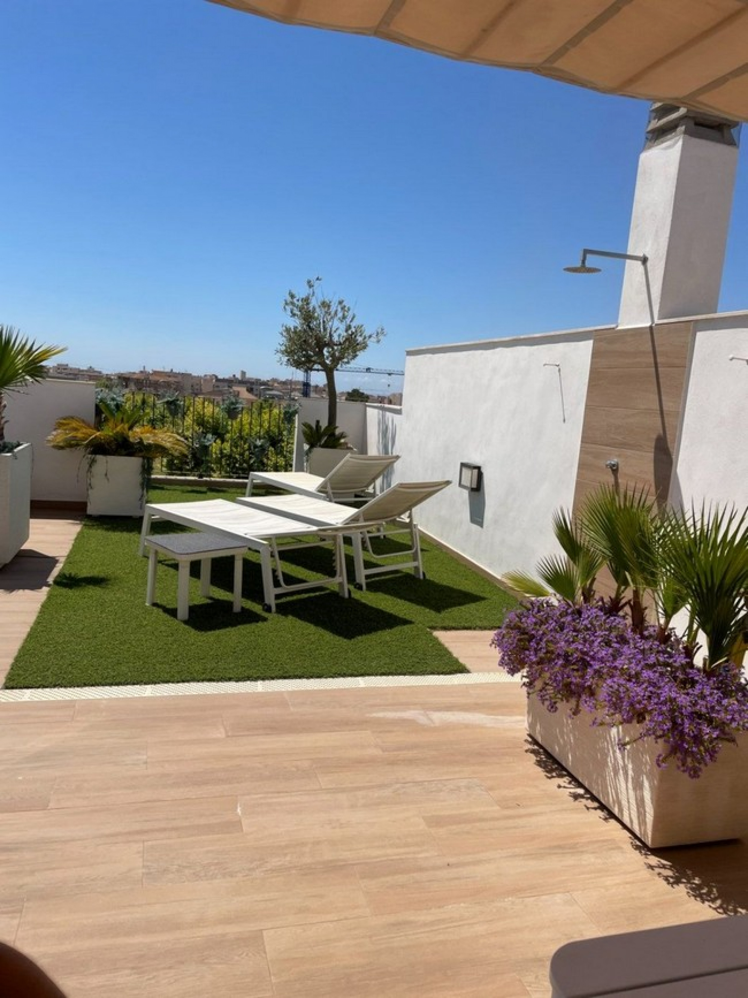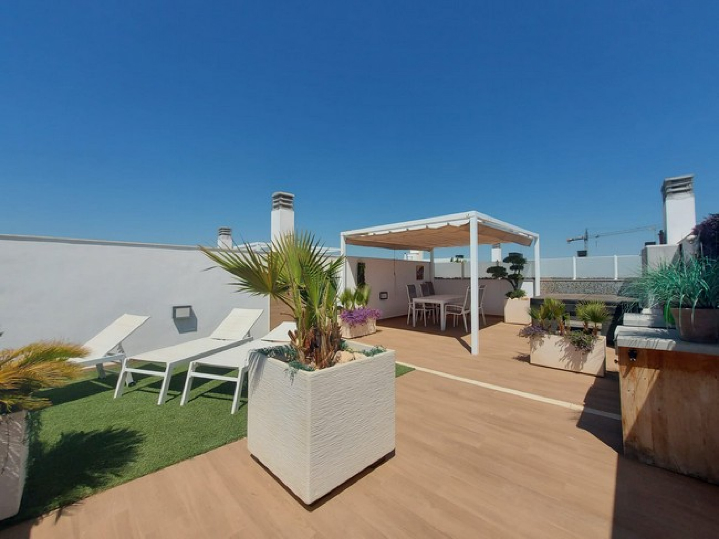 This resale penthouse apartment is on the upper floor of a two storey block in a residential development in Pilar de la Horadada and is only 3.1km to the beach. The property has an open plan lounge/dining/kitchen area, two double bedrooms, one with en suite plus another shower room. There is a large rooftop solarium with a shower and summer kitchen which is accessed by stairs from the terrace below. Features include - Communal Pool and Garden An underground garage for parking Air Conditioning Aerothermal Hot Water System Automatic Blinds Mosquito Nets on all Windows Option to buy the furniture and Jacuzzi for an extra cost of 14,000 euros. Pilar de la Horadada is located south of Alicante. The town and its neighbouring beach town Torre de la Horadada has many shops, bars and restaurants to choose from. Easy access to the motorway running right up and down the coast. Torre De La Horadada is located on the Mediterranean sea and lies north of the Mar Menor. Torre De La Horadada comes under as the coastal town of Pilar De La Horadada. The town is well known for its beautiful blue flag beaches with fine sand and crystal clear waters. Torre De La Horadada marina has plenty of tapas bars, fish restaurants, ice cream parlours with views across the Mediterranean sea. You can walk along the promenade to the next town “El Mojon”. Just around the corner from the Marina there is a busy square with a wide selection of English/Spanish bars, restaurants, shops etc. Local markets are held on a Wednesday in summer season and on a Friday in Pilar De La Horadada. Torre De La Horadada is well connected with the motorways to Alicante and Cartagena/Murcia. Only 5-10 minute drive to a variety of golf courses. Bus service running along the coast up to Alicante and down to Cartagena. Local hospitals in nearby Torrevieja and San Javier. Good choice of both local and international schools close by.