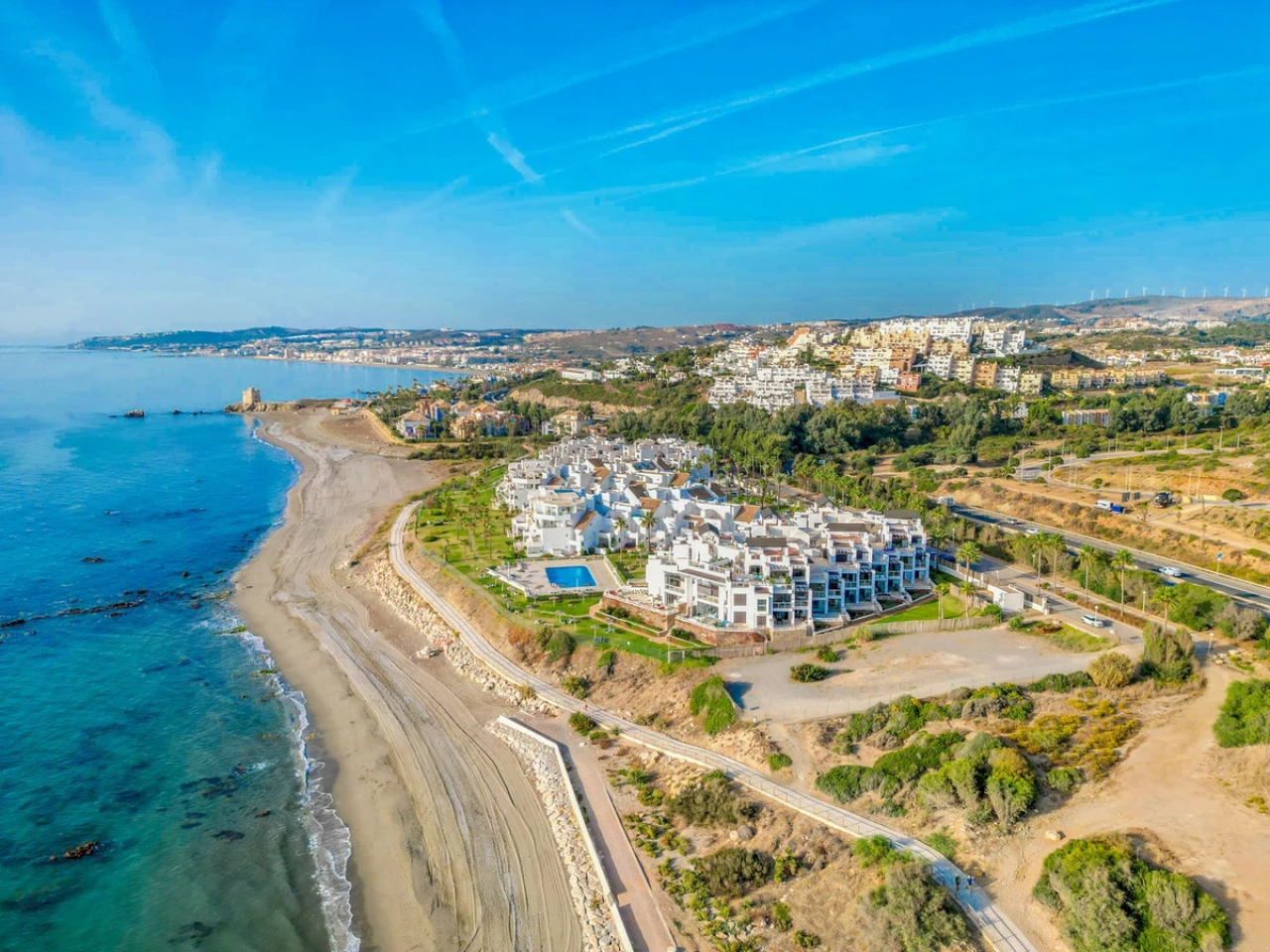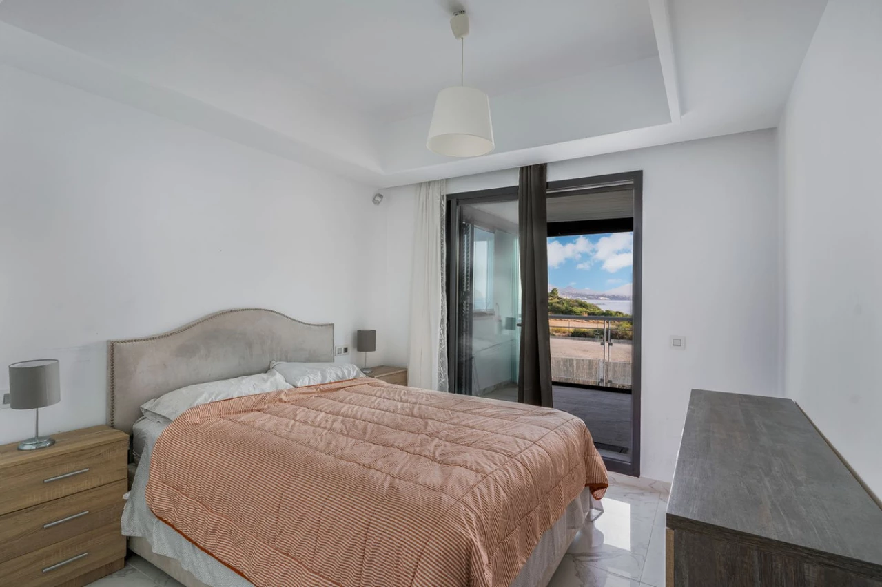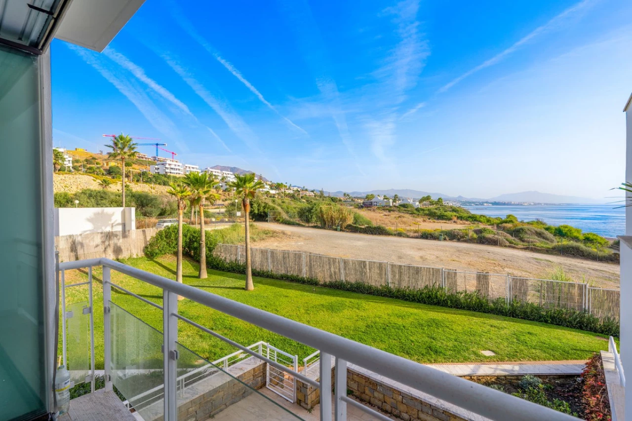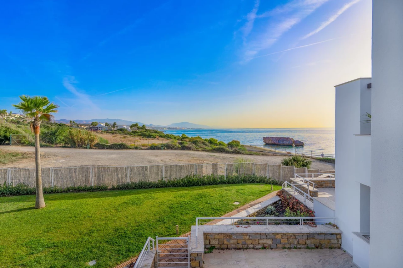 Stunning sea views: Frontline beach 2-bedroom 2-bathroom Apartment in luxury urbanisation with vast communal gardens and direct access to the beach promenade. This property enjoys panoramic sea views over the bay of Estepona. The apartment comes with 2 garage spaces included in the price, ensuring that parking is not a problem even in summer. The apartment has access to a large private terrace that has been enclosed with "lumon" crystal curtains – perfect for al fresco dining all year round. You can enjoy the beautiful sea views the property offers from the inside (living room & master bedroom) and out of the apartment. The modern, independent kitchen is fully fitted with top-of-the line appliances. The apartment is built to a very high standard with marble floors, hot/cold air conditioning using a heat pump and double glazing.
