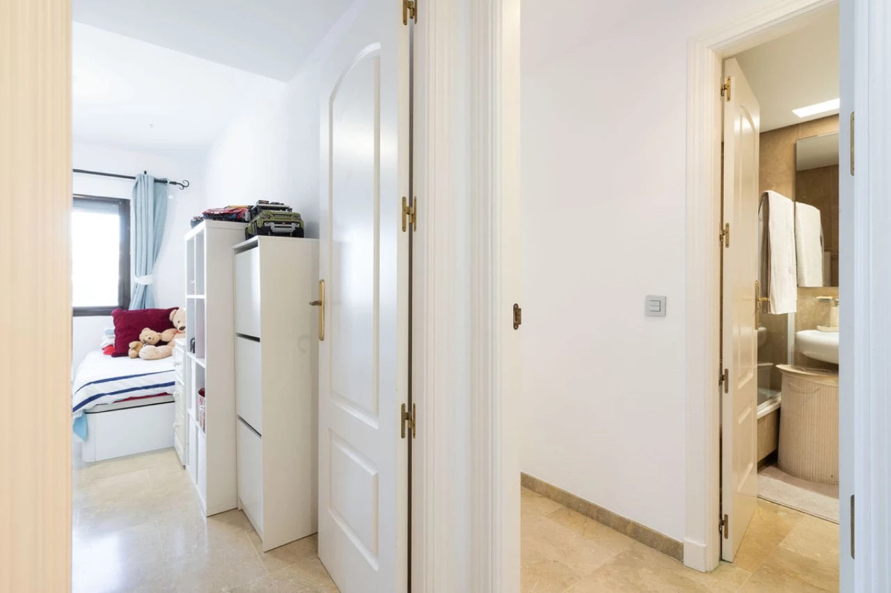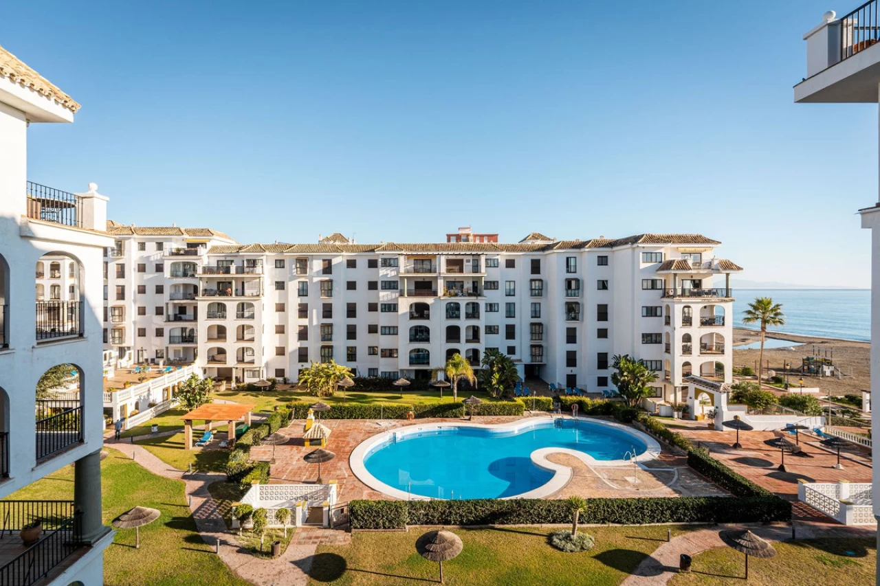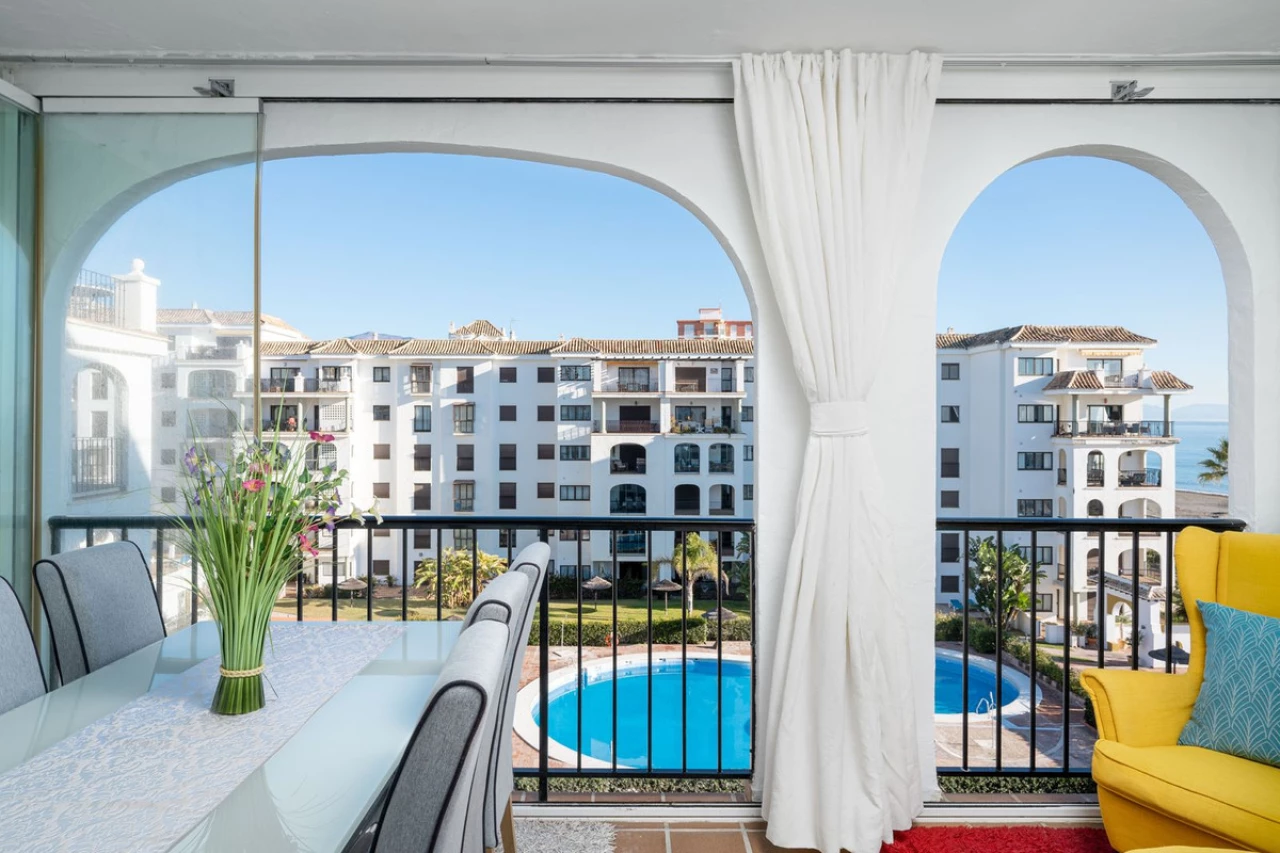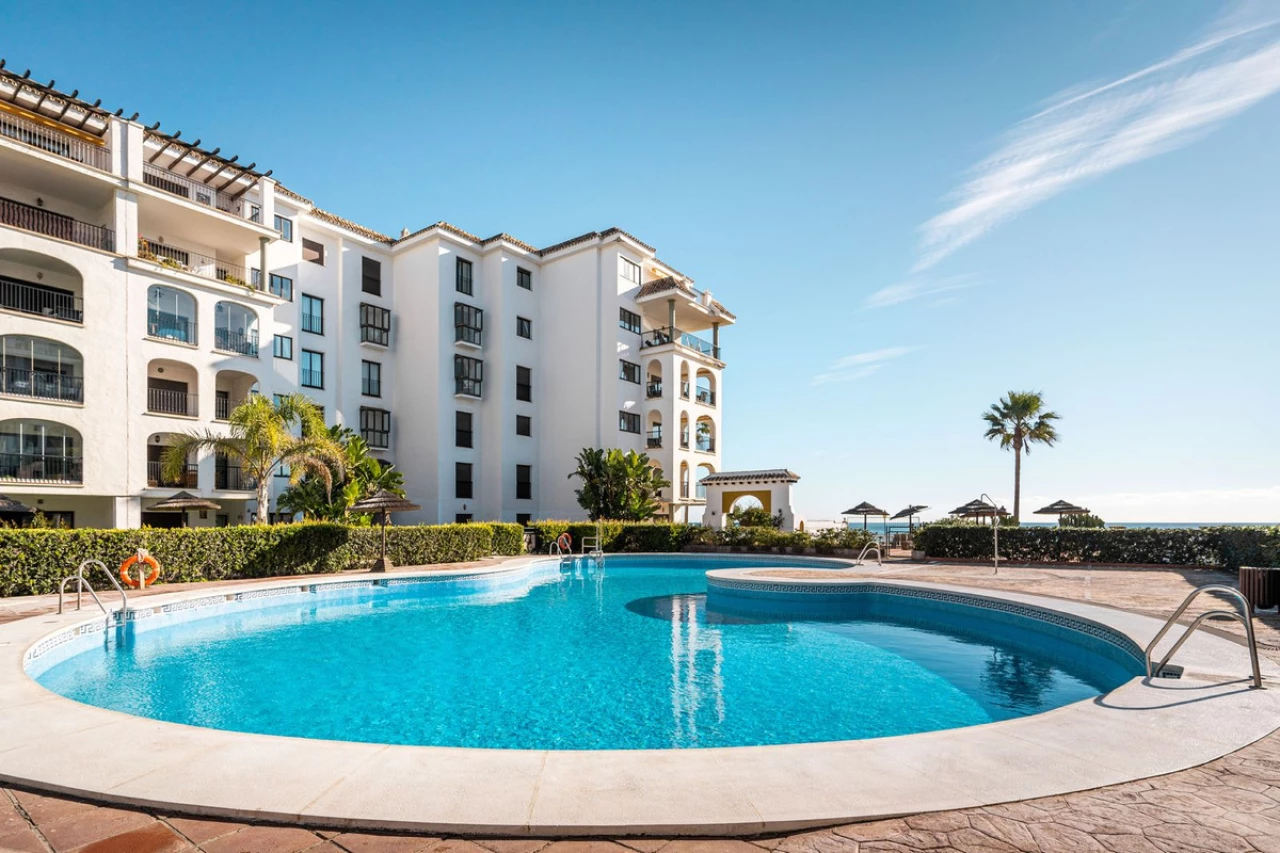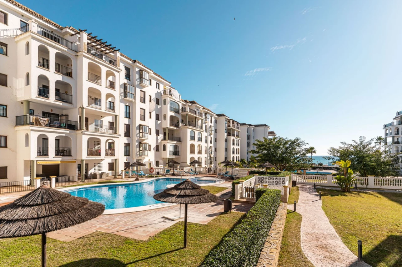 Stunning beachfront 2-bed apartment with private terrace, pool and sea views in luxury urbanization in the heart of Duquesa Port. The living room is bright and gives access to a large private terrace with incredible views to the community pool and the sea. The kitchen is fully equipped with appliances and includes an utility room next to it. The master bedroom is very bright and has an en-suite bathroom and fitted wardrobes, and the large floor to ceiling glass door faces the pool allowing plenty of sunlight. The second bedroom is of a good size with fitted wardrobes too and right next to a full family bathroom. All windows are fitted with mosquito nets, making sure you can keep the window open without worries. The apartment is sold fully furnished and ready to move in: marble floors, hot/cold Ac system, double glazing and fitted closets. The luxury urbanization has 4 community pools (one heated), children's pool, sauna, 2 paddle tennis courts, gym, a common room with ping-pong tables, a small library with a reading room, and of course 24/7 security. The apartment comes with a garage space and a storage room included in the price. The location could not be better. Right in Puerto de la Duquesa with all the amenities needed around you: supermarkets, bars and restaurants, taxi services, pharmacies, etc. and direct access to the promenade and the beach. The Urbanization is on the very first line of the beach with access to the promenade, so it is just a few meters from the Duquesa marina, and a few minutes from Sabinillas with all its services. It is just a few minutes from several golf courses, and half an hour to Marbella and Gibraltar. It is an ideal investment, due to its unbeatable location, and has a history of short- and long-term rentals.