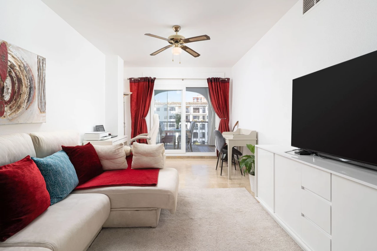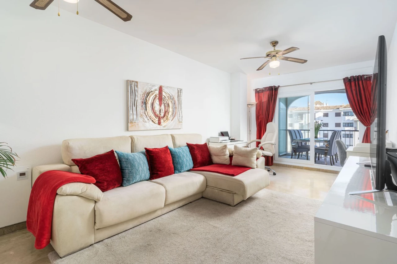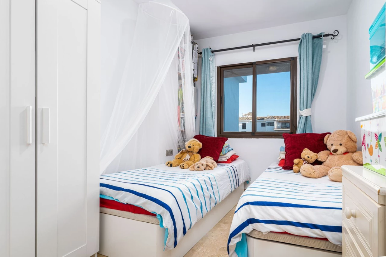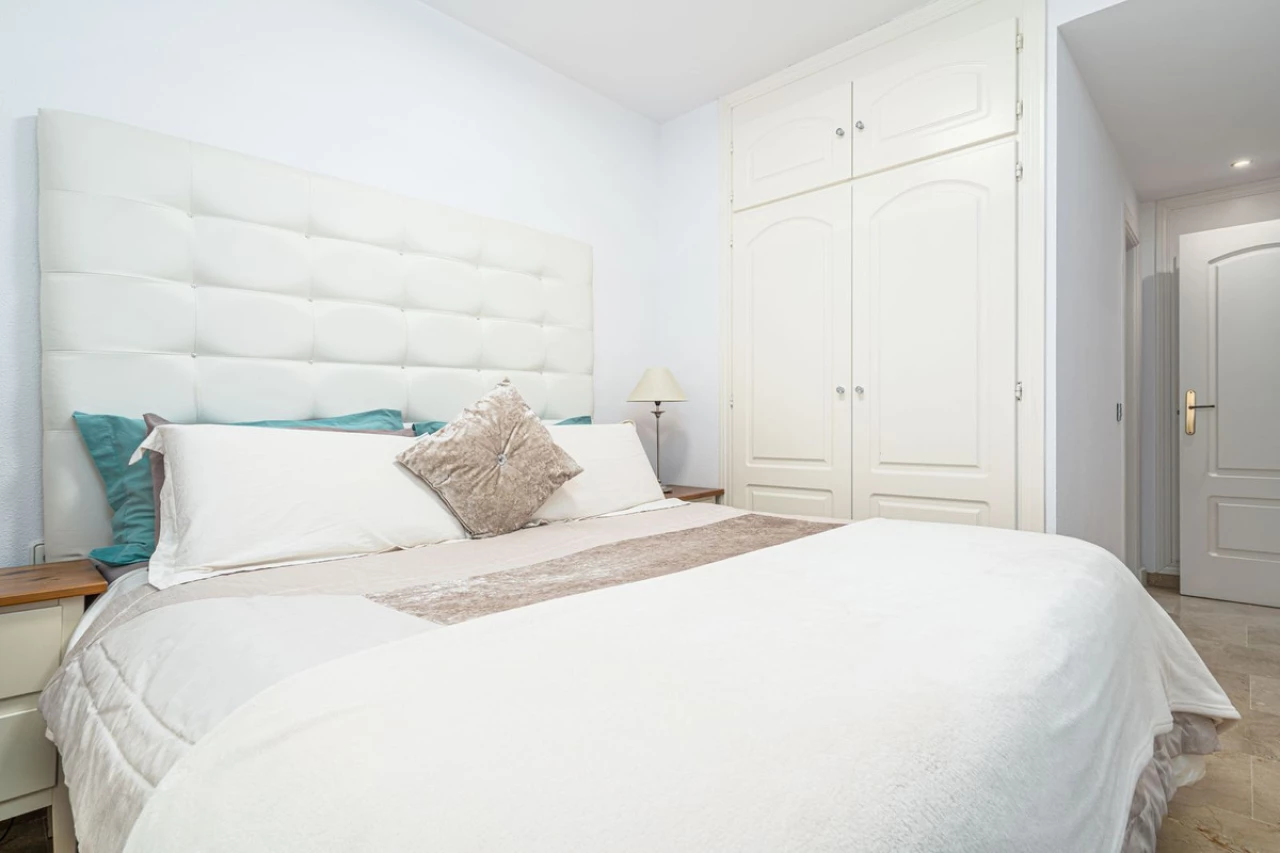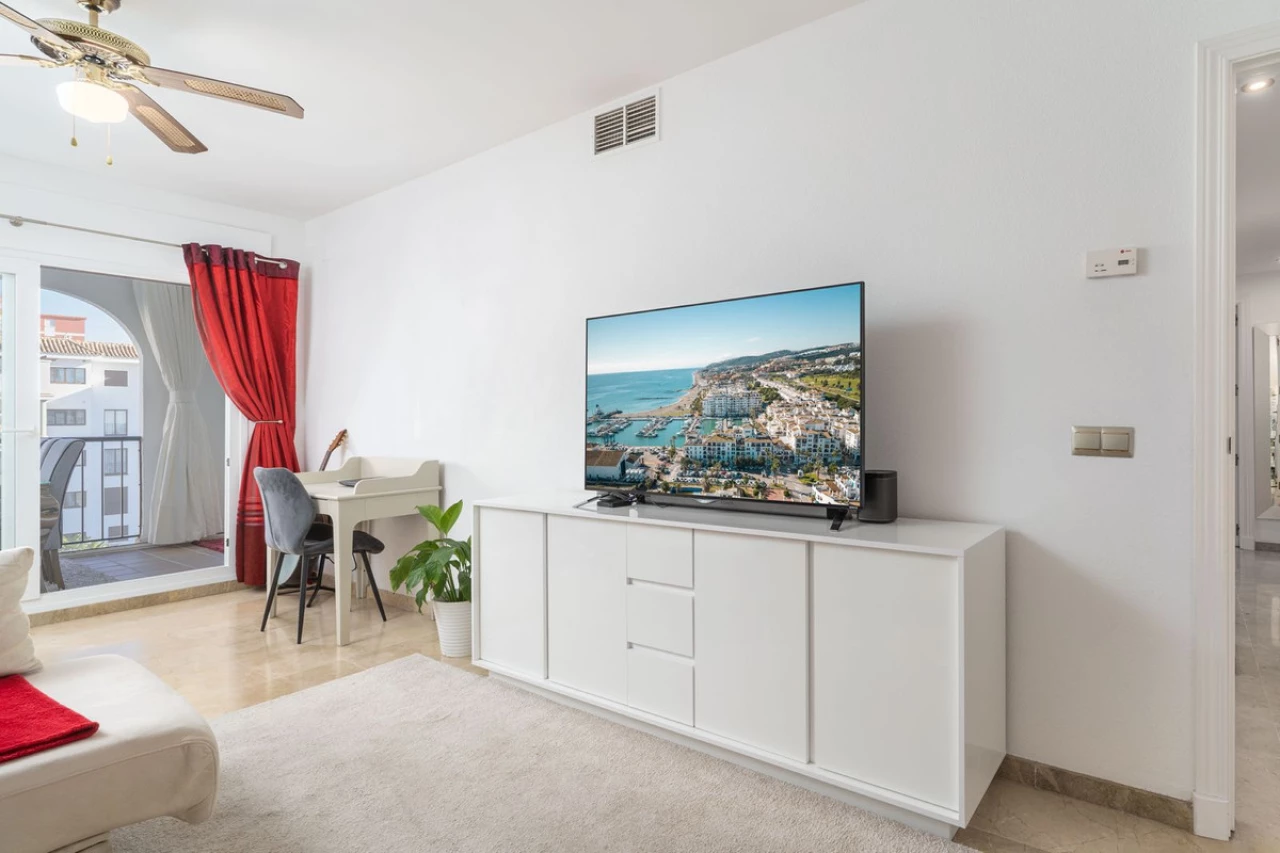Stunning beachfront 2-bed apartment with private terrace, pool and sea views in luxury urbanization in the heart of Duquesa Port. The living room is bright and gives access to a large private terrace with incredible views to the community pool and the sea. The kitchen is fully equipped with appliances and includes an utility room next to it. The master bedroom is very bright and has an en-suite bathroom and fitted wardrobes, and the large floor to ceiling glass door faces the pool allowing plenty of sunlight. The second bedroom is of a good size with fitted wardrobes too and right next to a full family bathroom. All windows are fitted with mosquito nets, making sure you can keep the window open without worries. The apartment is sold fully furnished and ready to move in: marble floors, hot/cold Ac system, double glazing and fitted closets. The luxury urbanization has 4 community pools (one heated), children's pool, sauna, 2 paddle tennis courts, gym, a common room with ping-pong tables, a small library with a reading room, and of course 24/7 security. The apartment comes with a garage space and a storage room included in the price. The location could not be better. Right in Puerto de la Duquesa with all the amenities needed around you: supermarkets, bars and restaurants, taxi services, pharmacies, etc. and direct access to the promenade and the beach. The Urbanization is on the very first line of the beach with access to the promenade, so it is just a few meters from the Duquesa marina, and a few minutes from Sabinillas with all its services. It is just a few minutes from several golf courses, and half an hour to Marbella and Gibraltar. It is an ideal investment, due to its unbeatable location, and has a history of short- and long-term rentals.