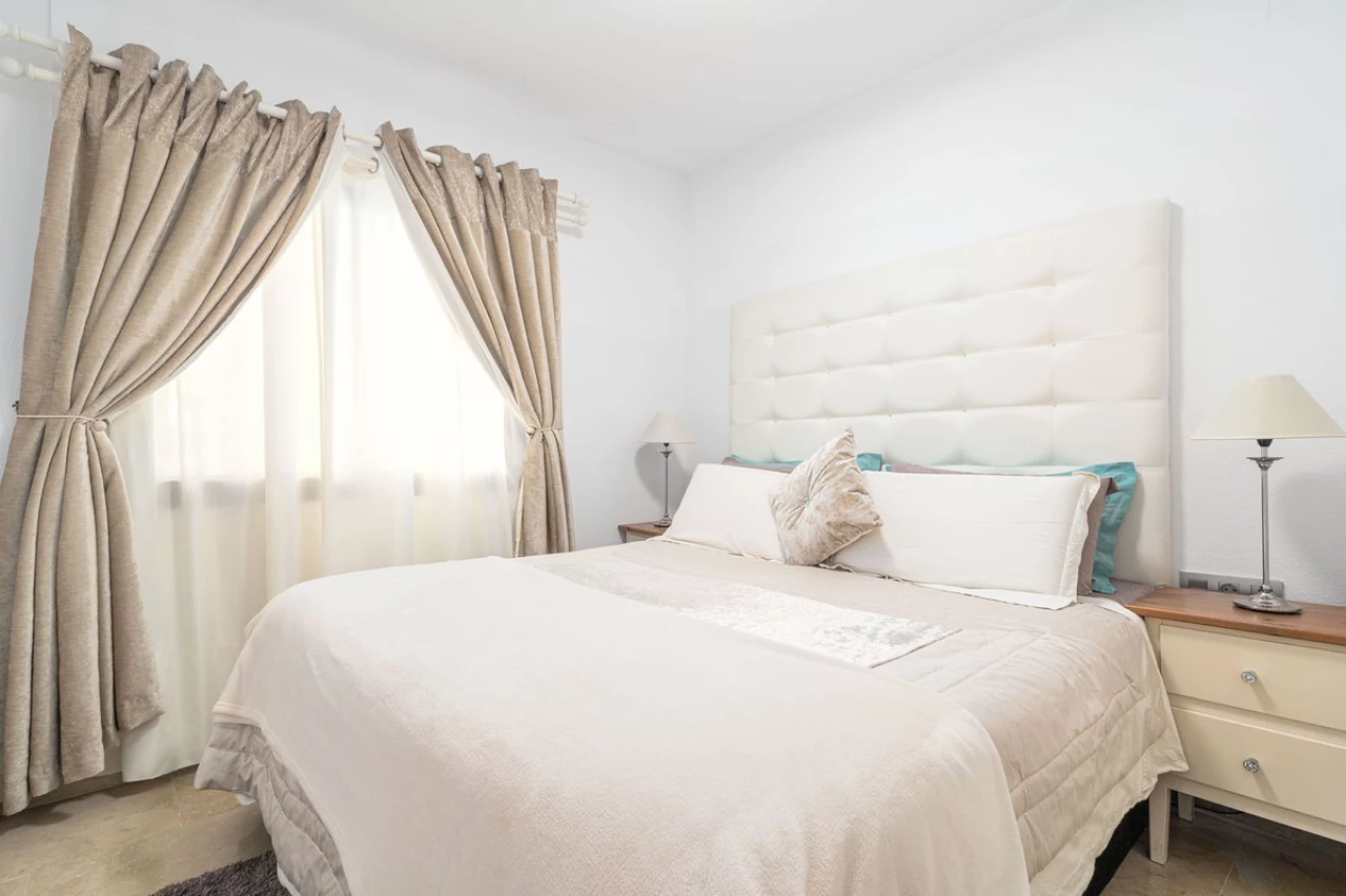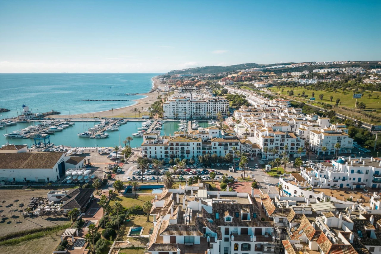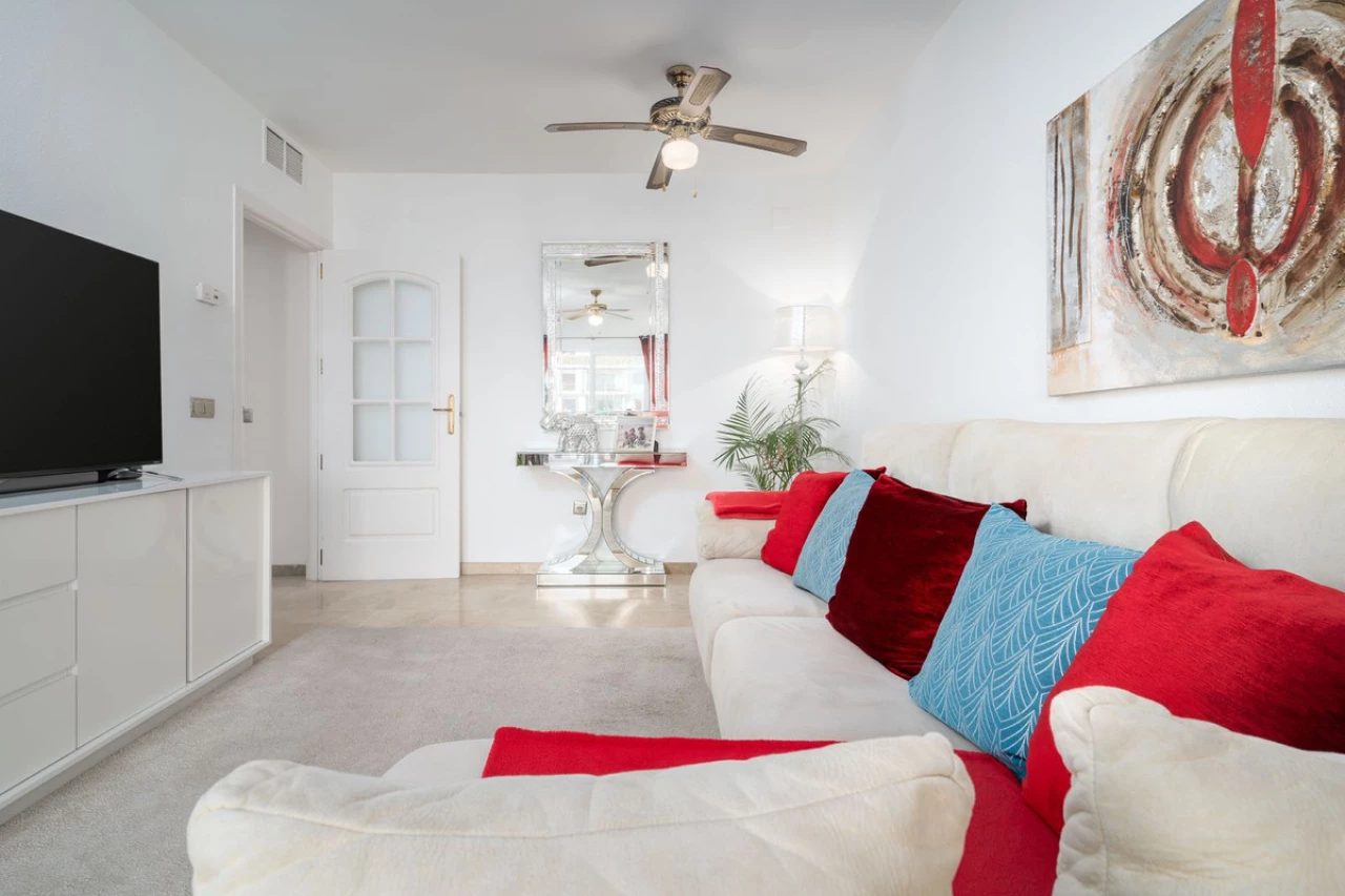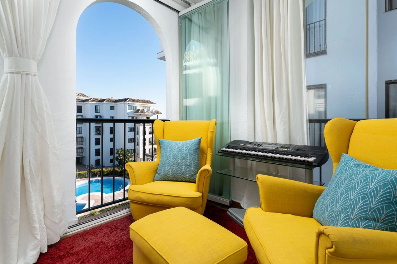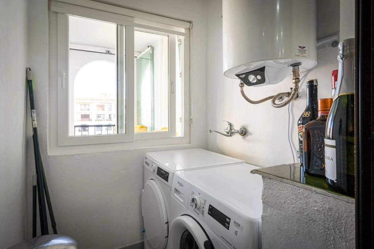 Stunning beachfront 2-bed apartment with private terrace, pool and sea views in luxury urbanization in the heart of Duquesa Port. The living room is bright and gives access to a large private terrace with incredible views to the community pool and the sea. The kitchen is fully equipped with appliances and includes an utility room next to it. The master bedroom is very bright and has an en-suite bathroom and fitted wardrobes, and the large floor to ceiling glass door faces the pool allowing plenty of sunlight. The second bedroom is of a good size with fitted wardrobes too and right next to a full family bathroom. All windows are fitted with mosquito nets, making sure you can keep the window open without worries. The apartment is sold fully furnished and ready to move in: marble floors, hot/cold Ac system, double glazing and fitted closets. The luxury urbanization has 4 community pools (one heated), children's pool, sauna, 2 paddle tennis courts, gym, a common room with ping-pong tables, a small library with a reading room, and of course 24/7 security. The apartment comes with a garage space and a storage room included in the price. The location could not be better. Right in Puerto de la Duquesa with all the amenities needed around you: supermarkets, bars and restaurants, taxi services, pharmacies, etc. and direct access to the promenade and the beach. The Urbanization is on the very first line of the beach with access to the promenade, so it is just a few meters from the Duquesa marina, and a few minutes from Sabinillas with all its services. It is just a few minutes from several golf courses, and half an hour to Marbella and Gibraltar. It is an ideal investment, due to its unbeatable location, and has a history of short- and long-term rentals.