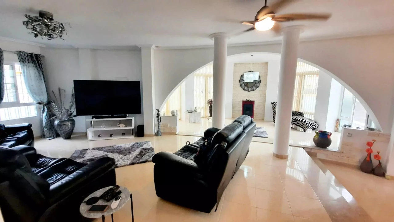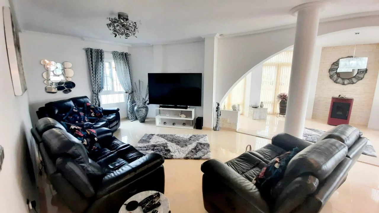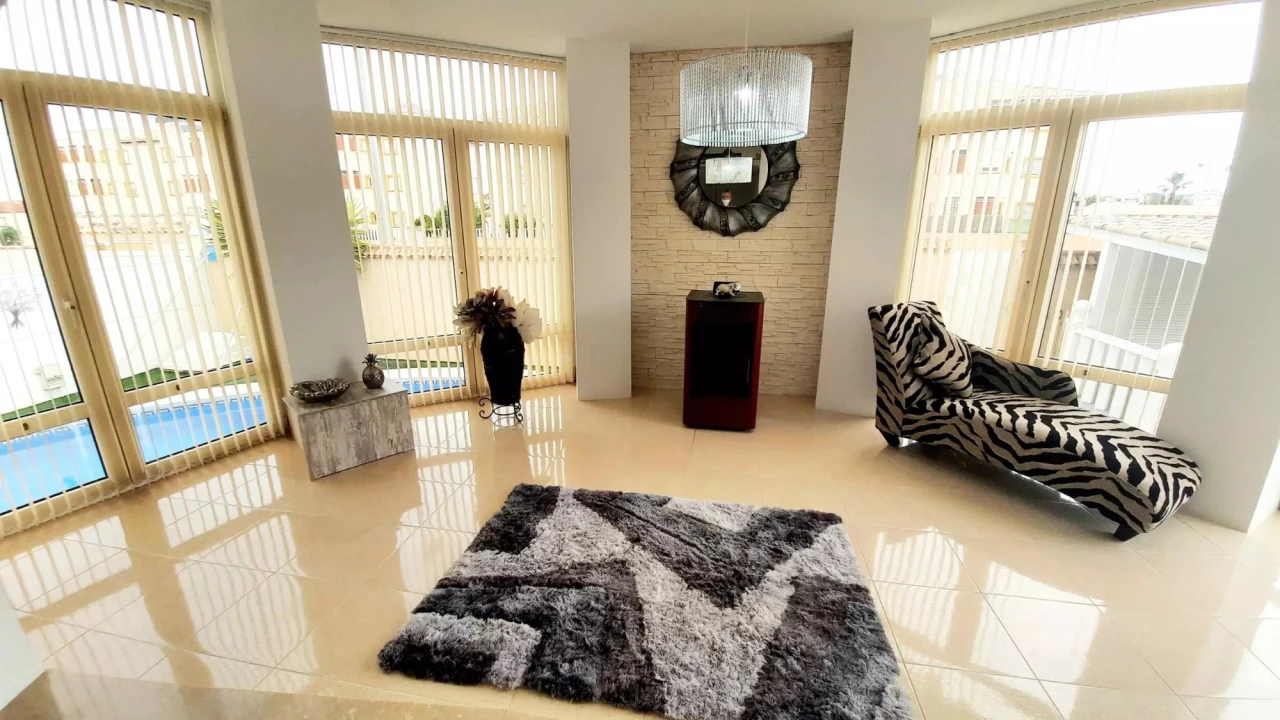 Reference R8484D A South East facing 5 bed 3 bath luxury detached villa with a private swimming pool located in Lomas de Cabo Roig, Cabo Roig, Costa Blanca South. This 5-bedroom villa was built in 2006 & is distributed over 3 levels. It sits on a plot of around 450 m2 & very briefly consists of the following :- As you enter the property, the lounge and dining area is stunning & impressive with many modern features & offers a very high level of comfort and luxury which includies an energy-efficient pellet burner fire. The lounge area is very spacious and is split-level with the dining area slightly lower than the upper lounge and entrance area. There is also a bedroom on this floor (currently used as an office), a shower room and a large separate kitchen which is fully-fitted to a very modern standard with a breakfast bar and rear access to the garden. There is plenty of cupboard and worktop space. An elegant marble staircase leads to the upper and lower floors. The upper floor is made up of a landing with two double bedrooms at opposite end with a large central family bathroom with steps to a raised bathtub. The lower level of this highly desireable property is dedicated to entertainment with a large second lounge area and pool table and access to the adjacent barbecue area. There are also 2 bedrooms and a bathroom on this level. The kidney-shaped private pool is located in the front garden on the south side of the plot To the side of the property is a raised decking area with a great view towards the communal pool. There is a large carport offering secure private parking and a very spacious storage area to the rear of the carport. This stunning property benefits from ducted air conditioning throughout as well as a high-level security and alarm system and several electric shutters. The gorgeous low maintenance garden has stone carpet and artificial grass surrounding the pool. This property is located just a short walk from local bars, shops, restaurant, supermarket & the local bus stop. The golden beaches of Campoamor & Cabo Roig are just a few minutes drive away as are 4 golf courses. The Zenia Boulevard shopping mall is a 5 minute drive.Alicante airport is 50 minute. If you are looking for a spacious family home in a great location, this villa is a must see. Why Choose The Costa Blanca & Murcia regions of Spain? With property prices still around 50% of what they were in 2007/2008 properties are excellent value for money but be quick, prices are rising - buy now before the boom! Why Choose Solmar Estates? Whether you are looking to buy or sell a property Solmar Estates are your local resale property experts & we have a real passion for Spanish Property. We have been established in Spain since 2005 & we are a fully legal, fully registered & fully insured company. We area also verifiable members of the AIPP - The Association of International Property Professionals. We have built up our family run business based firmly around honesty, integrity and excellent customer care & service. We pride ourselves on understanding our client´s needs & we strive to ensure that your viewing experience is relaxed, un-pressured and most of all enjoyable. If you have a property to sell then we will use the latest systems, marketing techniques and online digital advertising media to ensure your property has the widest possible exposure to the biggest potential market. If you are planning a viewing trip to Spain do not waste your valuable time making appointments with numerous agents which can be very time consuming & costly. When you view with Solmar Estates we can show you any properties that you may see advertised online, no matter what agency they are advertised with & we offer to make a contribution towards your viewing trip costs when you purchase a property with us * We take the worry & stress out of the purchase or selling process by offering multi lingual legal services (purchase & selling conveyancing, NIE numbers, power of attorney, bank accounts, Spanish mortgages, utilities connection, tax returns, currency exchange etc.) Do you know someone else looking to buy a Spanish property? If so then refer them to us & receive 500 euros when they buy a property with us. * Do you know someone looking to sell a Spanish property? If so then refer them to us & receive 500 euros when we sell their property. * Properties always needed for waiting clients. * Terms & conditions apply - see solmarestates.com for details.