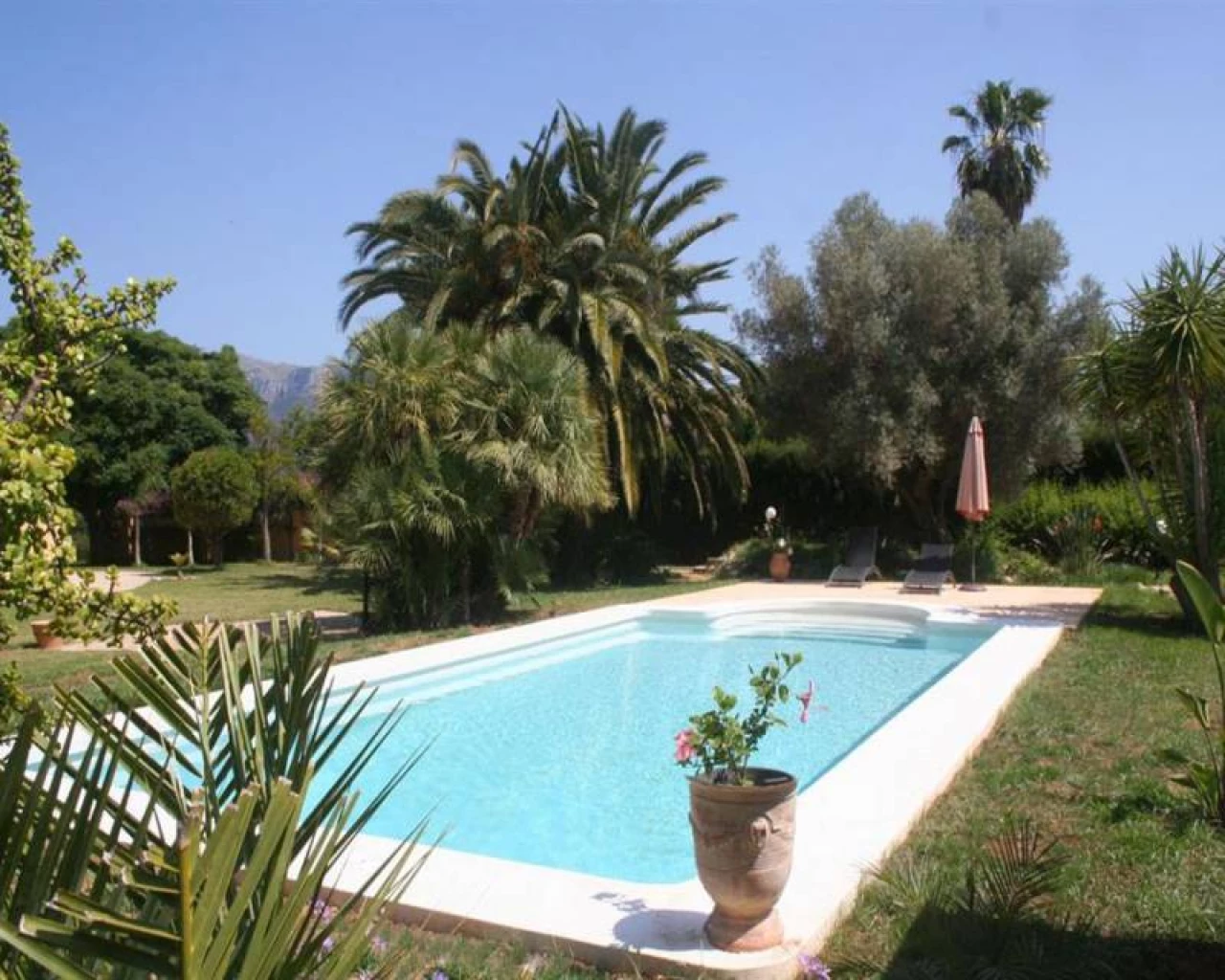 Beautiful property for sale in Denia between Torrecarrals, La Xara and Ondara, in a very calm place - Park of 5000 m2 totally settled: different Mediterranean species, palm trees, orange grove, shrubs, flowers, succulent plants, several terraces and a swimming pool of 12m x 5m with roman steps - The villa of 150 m2 comprises an entrance hall with built-in wardrobes, a large living / dining room, a glazed rotunda with view on the park, fully equipped kitchen, 3 double bedrooms with built-in wardrobes, 2 bathrooms and a guest toilet - Gas central heating, air conditioning, double glazing, shutters and mosquito nets - Next to the house is an independant studio of 50 m2 with American kitchen, full bathroom, large closets and a very nice covered terrace - Carport for 1 car and outside parking for 5 cars - The whole property is fenced and closed by a metallic gate with intercom - Very interesting to view !