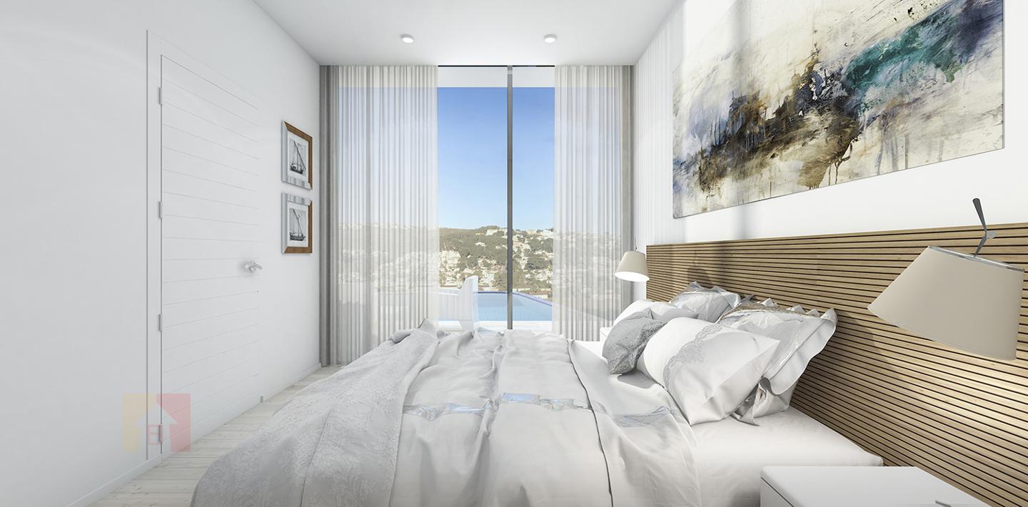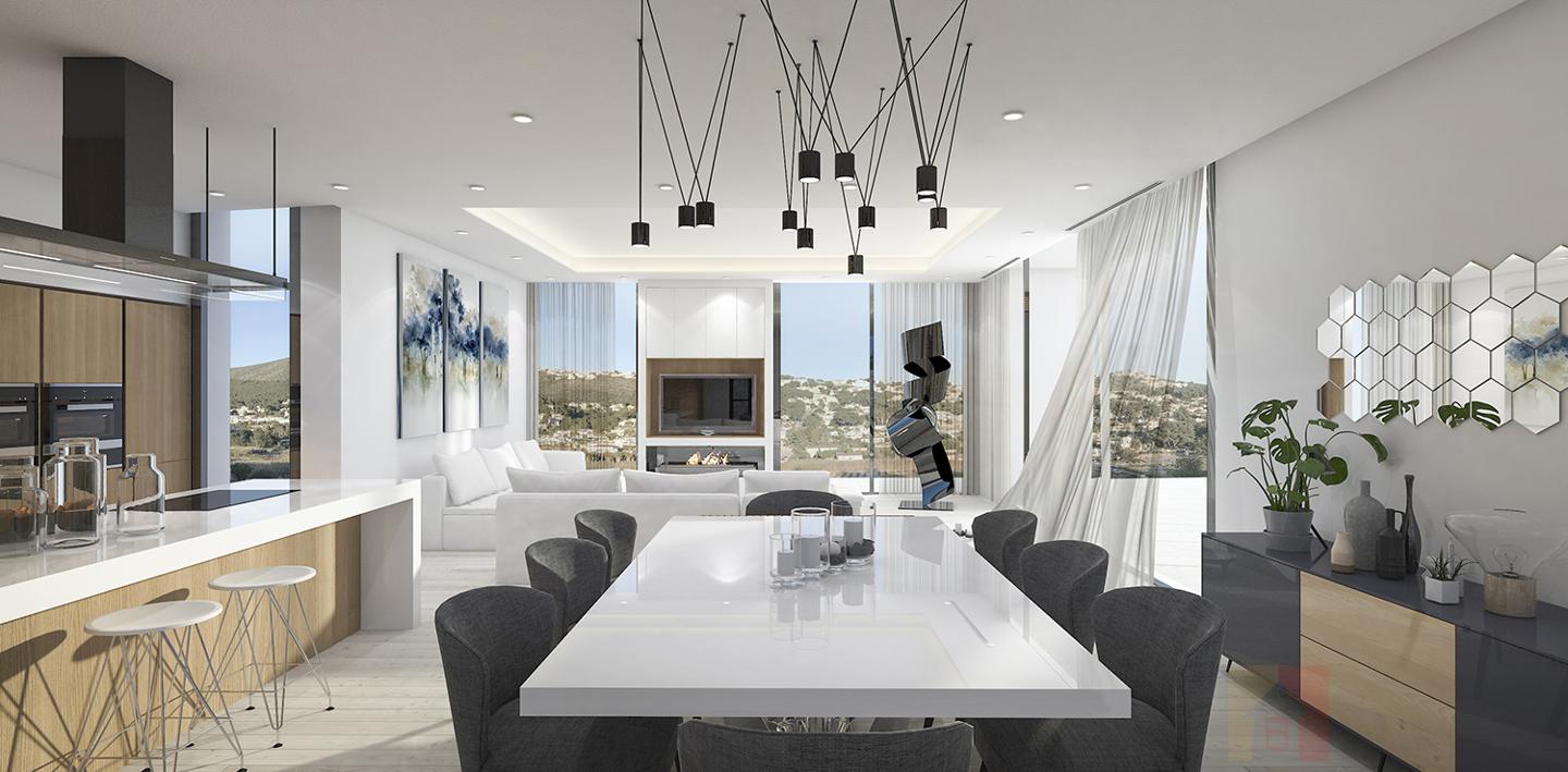 Modern villa of new construction for sale in Moraira Located in the prestigious urbanization Sol Park, close to the center of Moraira and the sea. It is built on a plot of 800 m2 with a construction area of 296 m2 (with the possibility of being increased to 492 m2). It consists of a residential floor, basement and solarium. On the residential floor there is a large living room with open-plan kitchen with island, fully equipped with reliable and easy to use SIEMENS appliances, 3 bedrooms, one of which with en-suite bathroom, pantry with a laundry room and guest toilet with shower. The living room has a wood-burning fireplace, where having conveniently settled down you can enjoy the warmth and beauty of the flame. The external sliding doors and windows are made of TECNAL aluminum profile with double glazing, each 6 mm thick with an air gap between them. The living room and all the bedrooms have direct access to the terrace with 8×4 m infinity swimming pool. The side part of the terrace with barbecue area can be accessed from the kitchen. From the terrace, an external staircase leads to a spacious solarium of 60 m2, 30 m2 of which relate to a pergola where you can enjoy the coolness. The SPA that is installed on the open part of solarium can be used by up to four persons simultaneously. Ready for finishing basement, has a separate entrance and can be used as a full-fledged residential floor, distributed into a large living room, 3 bedrooms, 2 bathrooms, dressing room, pantry and kitchen. The living room has large, floor to ceiling, sliding windows with panoramic views. In the semi-ground floor, there is also a ready for finishing space, with a separate entrance consisting of a bathroom and small kitchen that can be used as guest apartment or by staff. Including the area of the semi-ground floor, the total area of villa will be 492 m2. During the construction, only the highest quality materials were used. The villa is located almost a 2-minute walk from a restaurant, cafe, bakery, pharmacy, tennis club and mini-golf. Three minutes by car is also enough to get you to the center of Moraira with an abundance of restaurants, cafes, bars, shops and its unique charm. Nearby there is a private, cozy yacht club and sandy beaches with clear water.