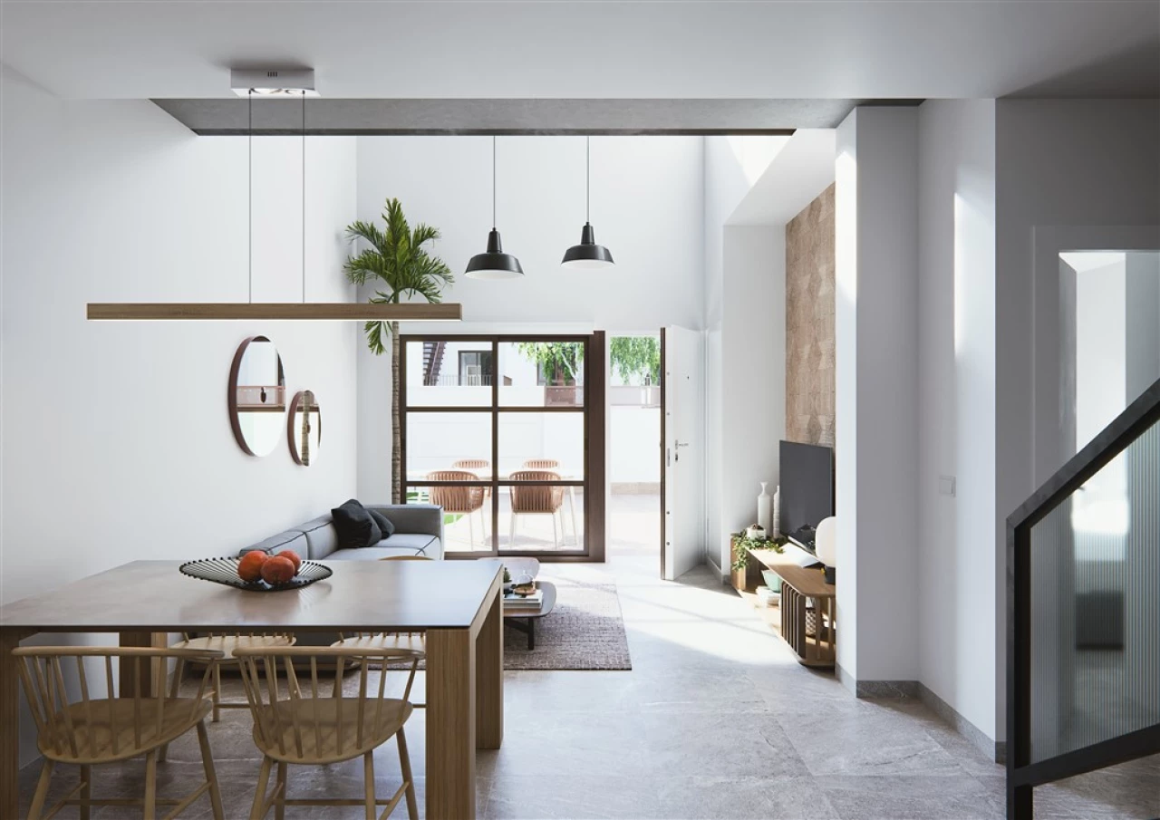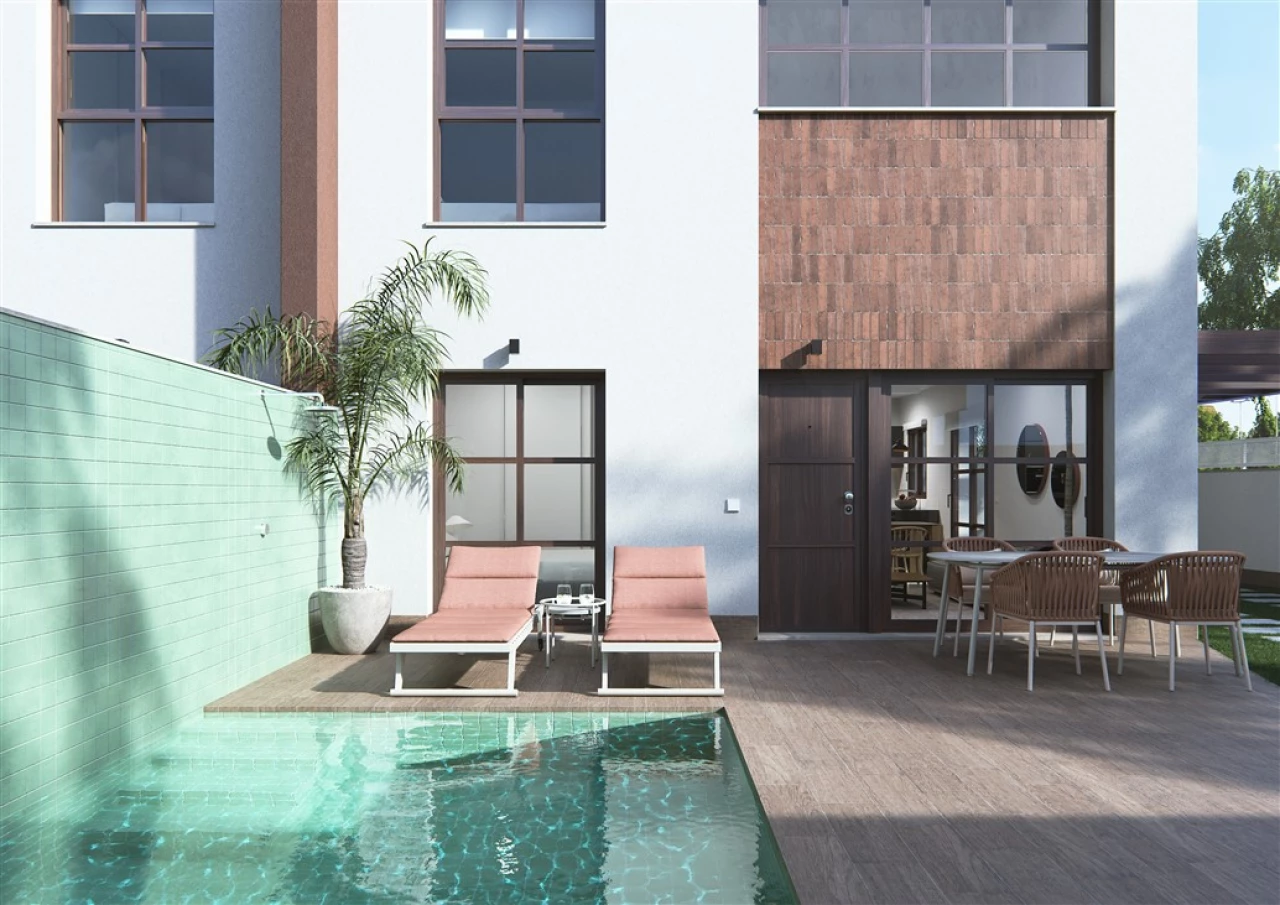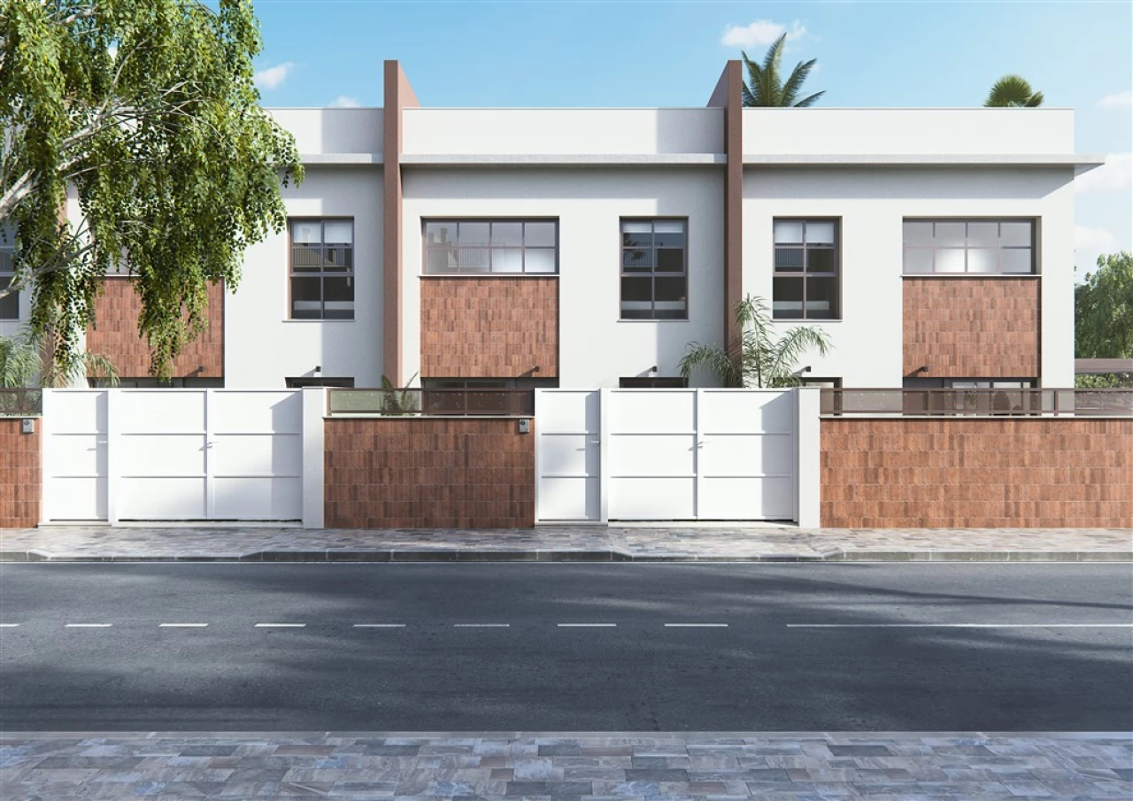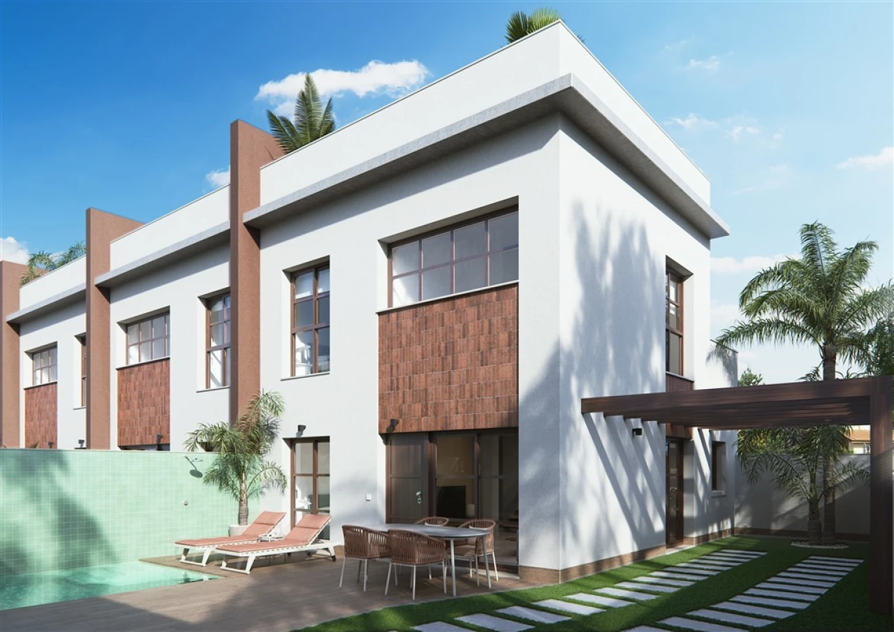 2 left!!Exclusive presentation of our new Residential Thai IV. Only 4 duplex with private pool and solarium, located in Pilar de la Horadada QUALITIES: STRUCTURE - Formed by pillars, flat beams and reinforced concrete joists. Metal exterior stairs. PARTITION - Ceramic brick in separation between dwellings. - Interior distribution with ceramic brick, to be defined FACADES - Closings of main facades in triple hollow brick, covered with mortar, finished in white, air pocket with interior insulation and interior partition of double hollow brick, to be defined COVER - Transitable roof (terrace-solarium), waterproof, finished with special exterior stoneware tiles. EXTERNAL WOODWORK - Doors and windows in aluminum carpentry, color to be defined with sliding window's opening system. - P.V.C. case and shutters in injected aluminum. INTERIOR CARPENTRY - Security door at the entrance of the house. - Wardrobe in bedrooms. Front with sliding doors and lined inside. - Interior doors in color and texture, to be defined . Handles and fittings finished in mate stainless steel. PAVIMENTS - First quality stoneware paving, light color, to be defined . in the whole house. - Special pavement for exteriors in the different areas to be defined . TILING - Tiled bathrooms in first quality tiles inside showers. SANITARY EQUIPMENTS - Vitrified porcelain washbasin and toilet, medium series, color white. Model and brand, to be defined - Chrome-plated mixer taps in washbasins and shower with overhead and shower hose. AIR CONDITIONING - Pre-installation of air conditioning in all homes, bedrooms and living room. ELECTRICITY - Degree of electrification according to REBT. - Recessed ducts in homes, according to standards, with Niessen or similar mechanisms. - Terrestrial TV-FM reception and distribution equipment. - Pipelines for TB (basic telephony). - Installation of halogens in kitchen and bathrooms. - Doorbell with push button. HOUSEHOLD GOODS - Furnished kitchen with high and low furniture in wood colour, ceramic hob, sink with mixer tap, oven and hood smoke extractor incorporated in furniture. Countertop in white Silestone or similar. PAINT, DECORATION AND PARAMENTS - Vertical and horizontal walls, trimmed with machine-cast plaster. - False plaster ceiling or plasterboard, distributor, kitchen and bathrooms. - Housing: Smooth plastic paint, a single white color on walls and ceilings. GLASS - Double glazing of houses with glass of camera. - Installation of tempered glass screens for shower trays in bathrooms. GARDEN - Private pool. - Area of artificial turf for sunbathing and parking car. AEROTERMIA - System of production of sanitary hot water by individual air heater per dwelling.