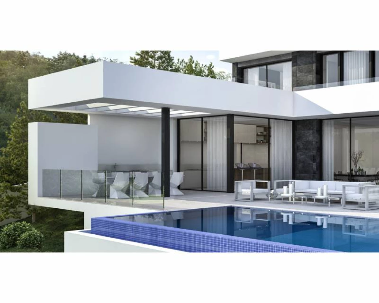New project of a modern villa to be built on a southwest facing plot in Paichi, Moraira, close to the town of Moraira and the amenities. The villa has 2 floors, with the main entrance on the first floor. On this floor you'll find 3 double bedrooms and 2 bathrooms (of 1 en-suite). Stairs or a lift lead you to the ground floor with an open plan distribution; living/dining area, large kitchen with isle, utility room and guest toilet. Large windows lead to the pool terrace, summer kitchen under the pergola and the pool, from where you can enjoy the beautiful views and some sea views. The villa will be built with first class quality materials and will include: under floor heating, double glazed windows, bedrooms with shutters, air conditioning and alarm installation. There is the option to extend the villa with a multi-functional finished basement (incl. extension elevator) of 50 m2. Project price in that case is: 930.000 euros