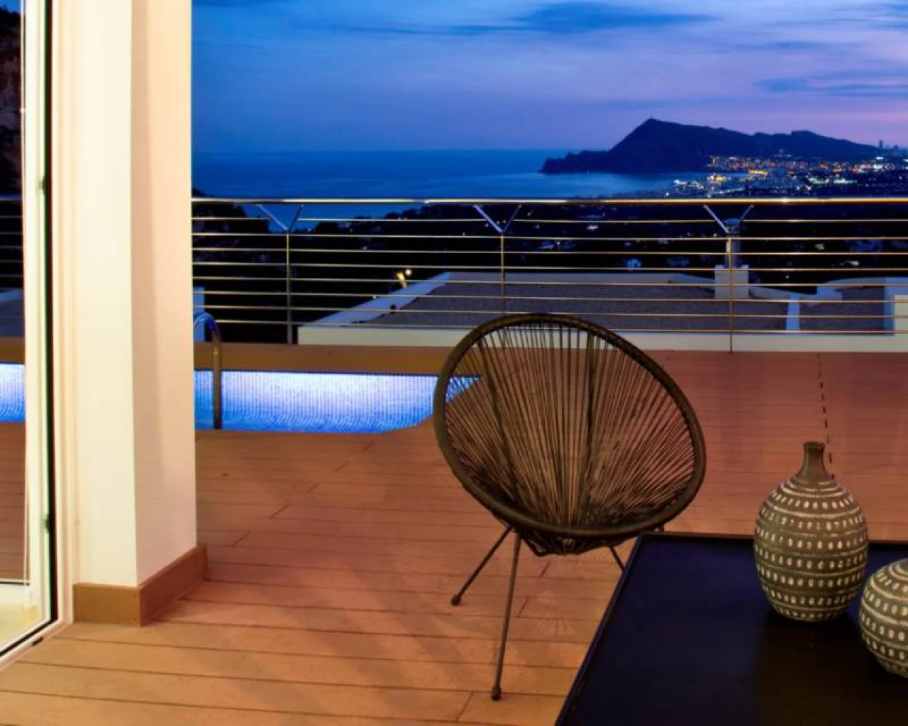 This villa is part of a new residential complex with modern and unique villas that all have views towards the Mediterranean Sea and the skyline of Benidorm. All villas have large interior spaces and a lot of natural light. It is 10km to Benidorm and closer to the lovely town of Altea where you can find everything you need. The floor at pool level consists of a large open plan lounge-dining with adjacent kitchen with cooking island and breakfast bar. With direct access to the large pool terrace. Also on this floor we find a double bedroom en-suite. The so-called "night-floor" has 3 en-suite bedrooms, either with dressing area or build-in wardrobes. The last floor comprises the 5th bedroom en-suite and garage for 3 cars.