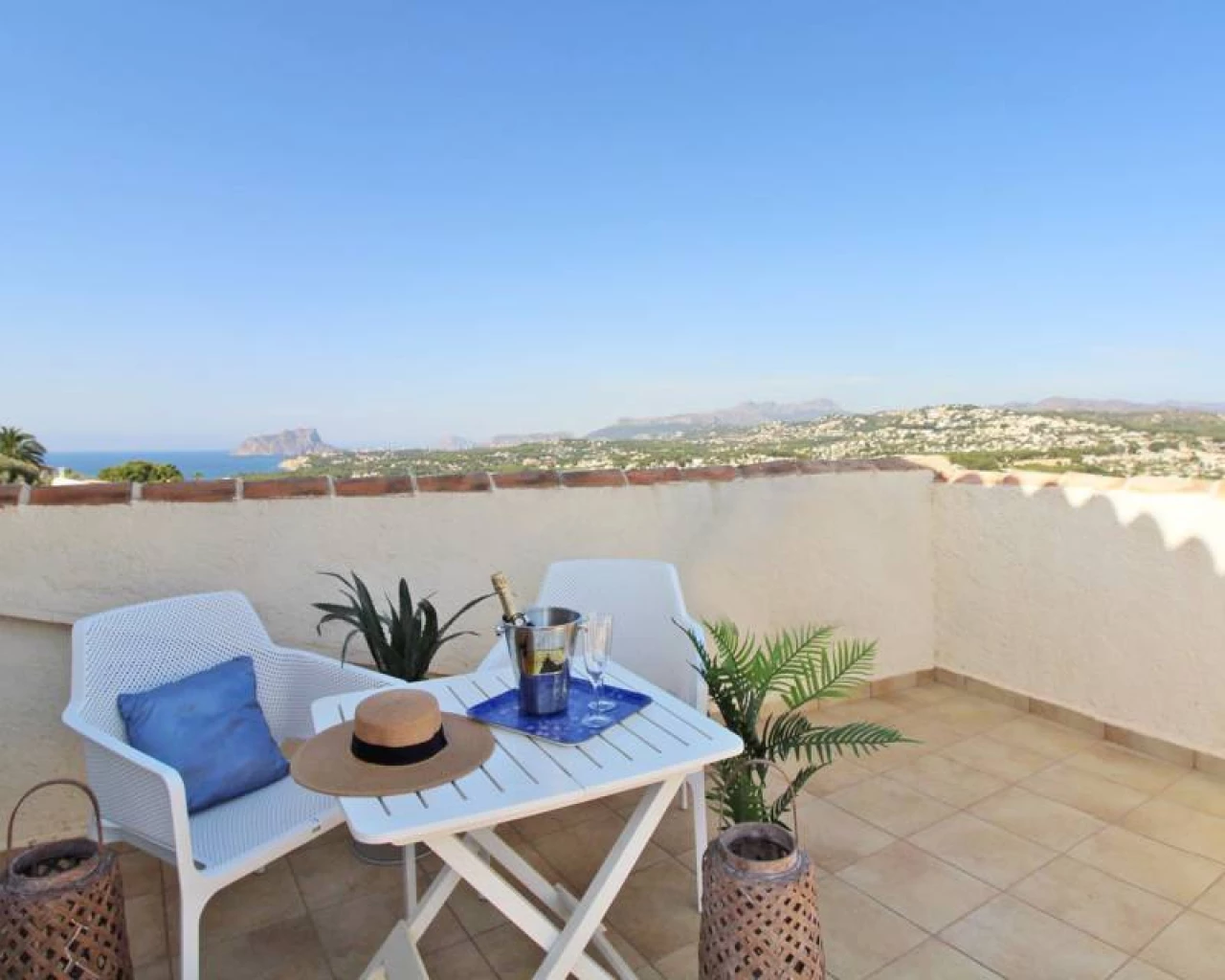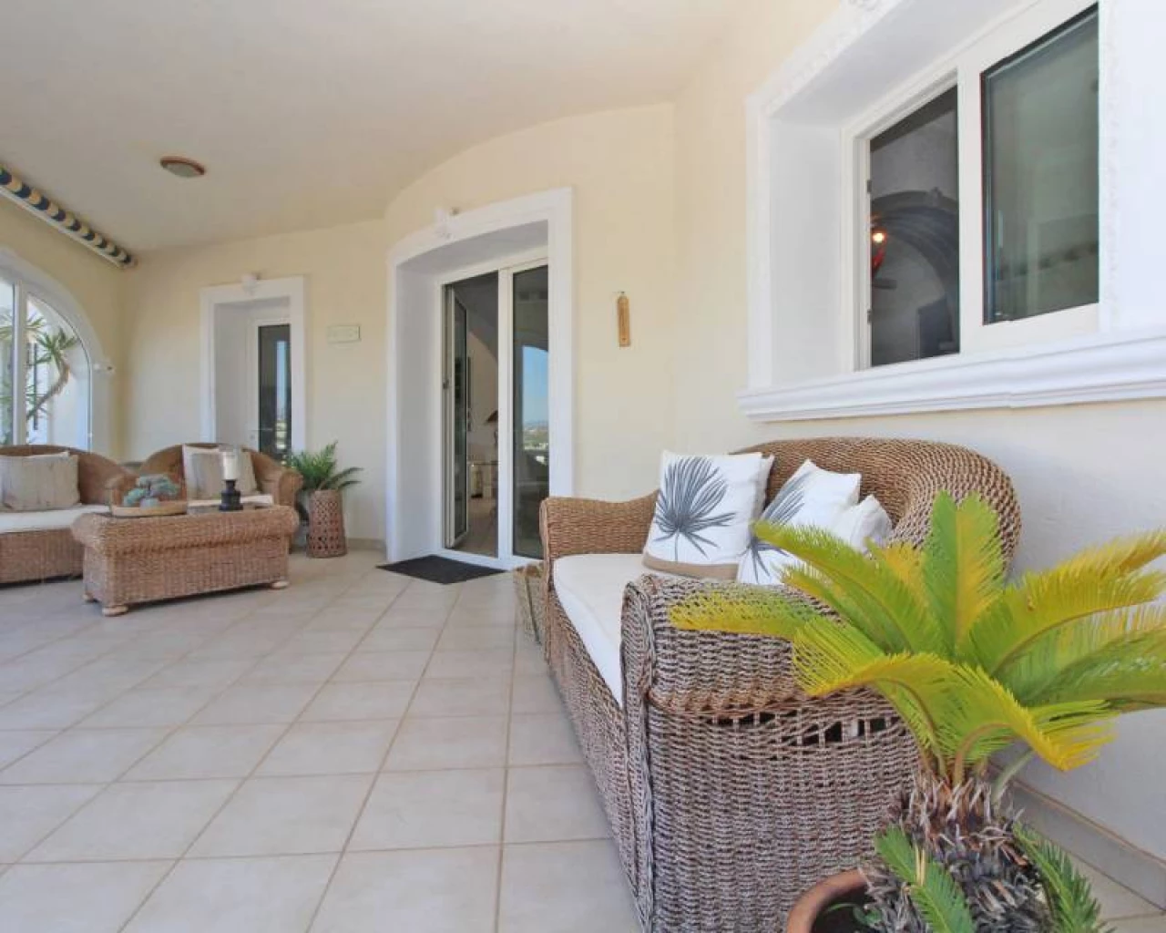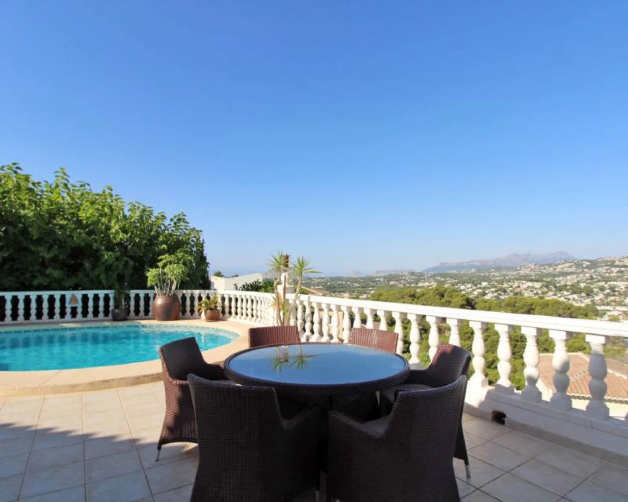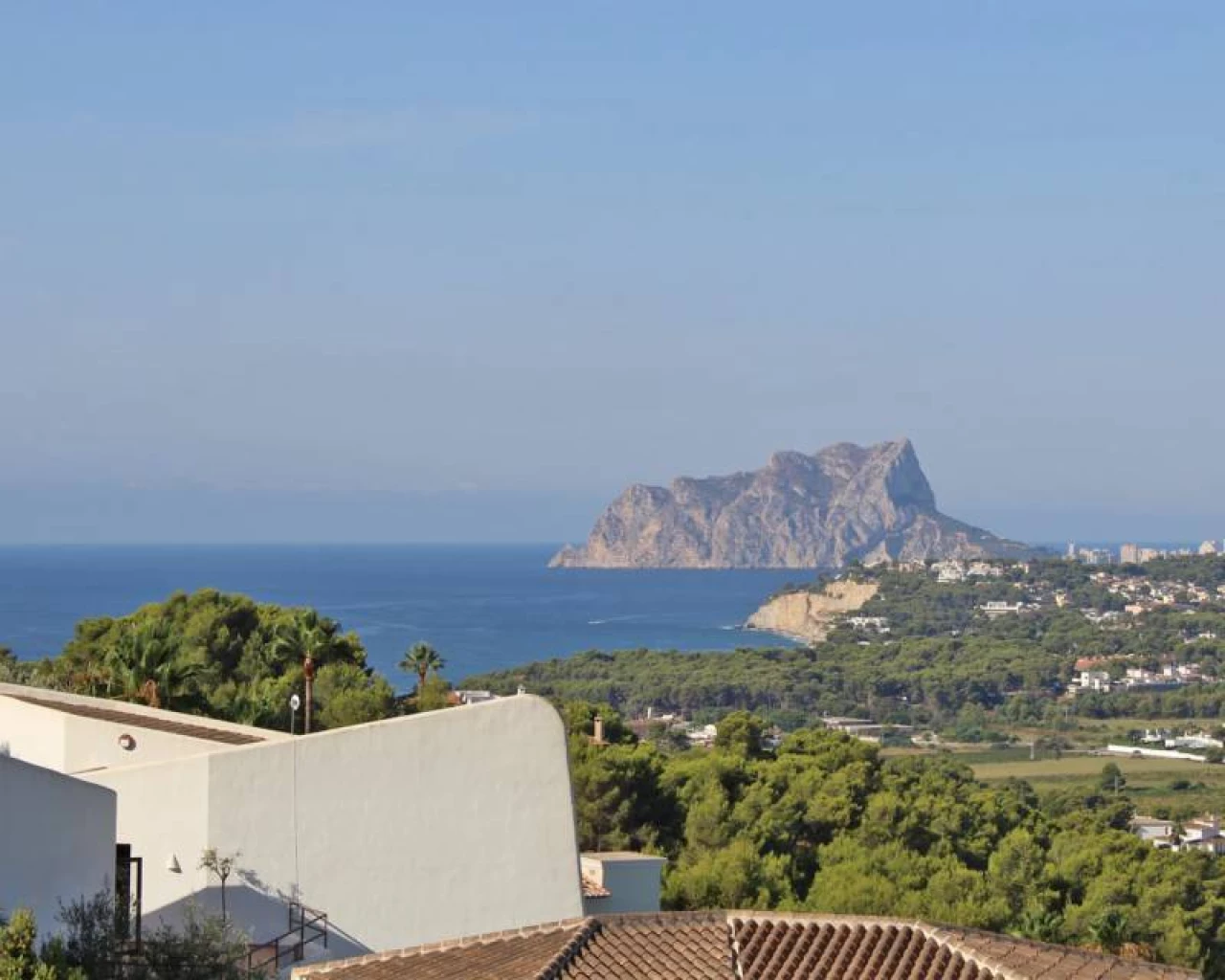 Traditional villa for sale in Moraira with lovely sea views. Situated in the Paichi district which is only 5 car min away from Moraira. Moraira is an attractive, small village where you find many bars, restaurants, shops and nice beaches. This property is in a very good condition and apart from the sea views it also has beautiful views over the valley. There are 2 entrances on the plot. From the hallway you enter the spacious and bright living-dining area with direct access to the porch and the pool terrace. Also on this floor is a fully equipped open kitchen with pantry, 2 bedrooms and 2 bathrooms. The staircase leads up to the master bedroom with bathroom and own terrace. It has a separate office part, but this could easily be converted into an ample dressing area. The villa has central heating and airconditioning. The outside space offers various sitting areas and a pretty garden. Garage for one car and large storage room.