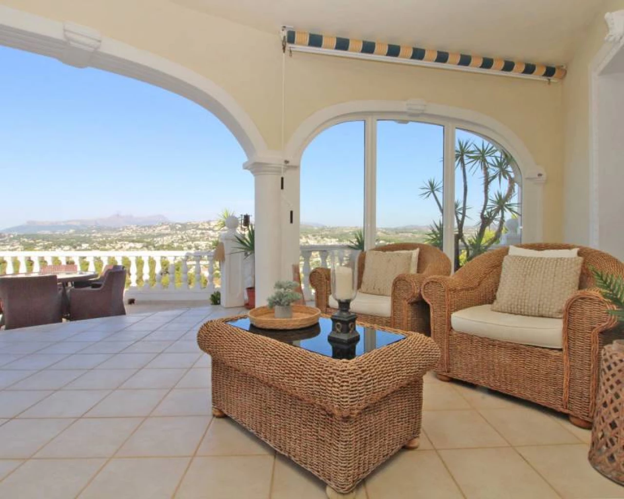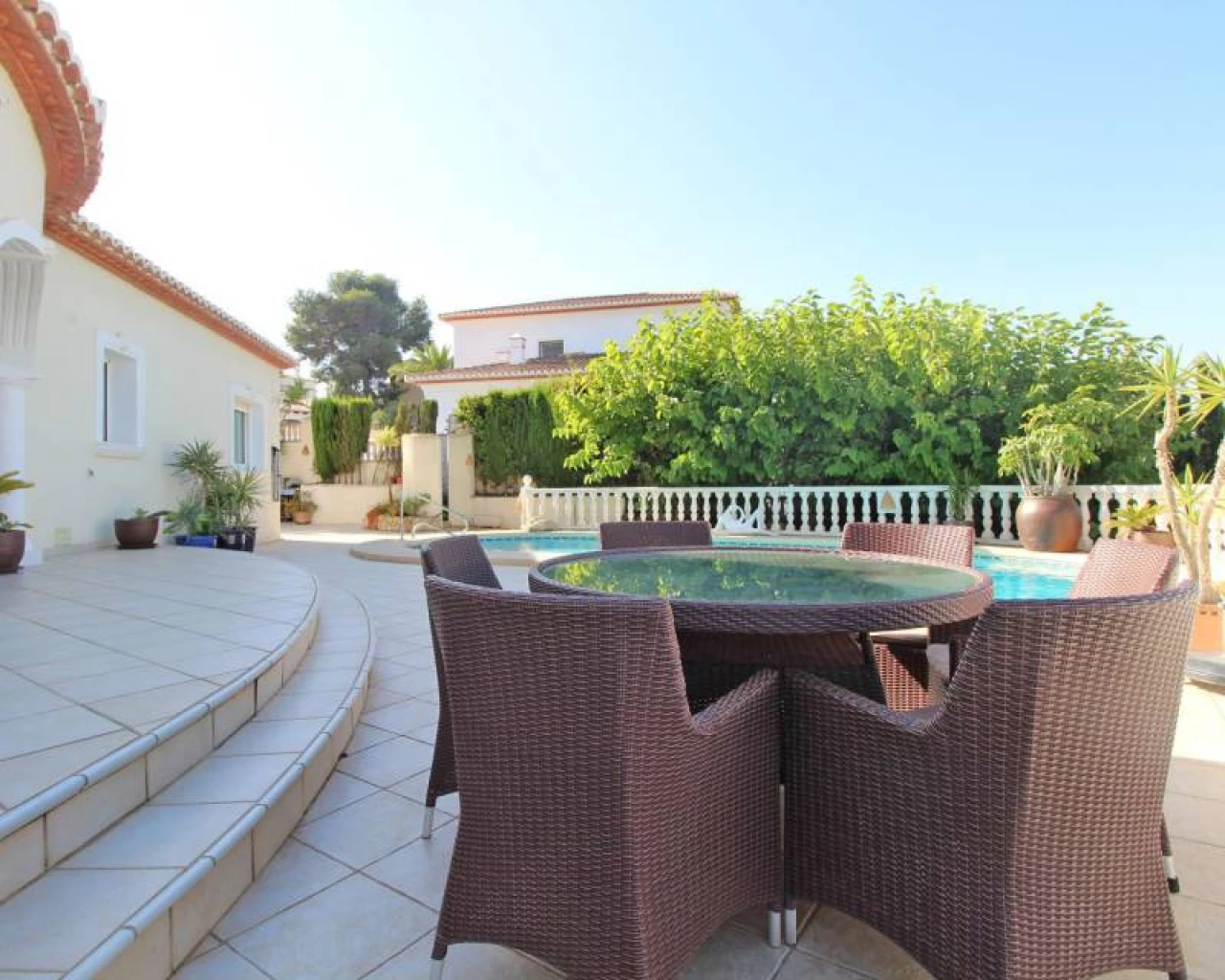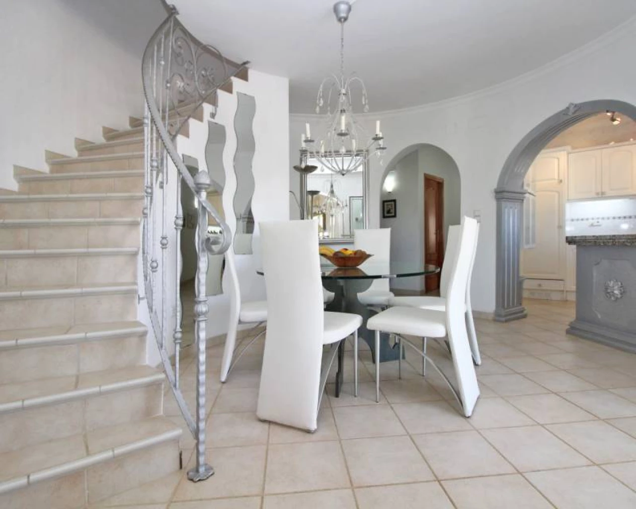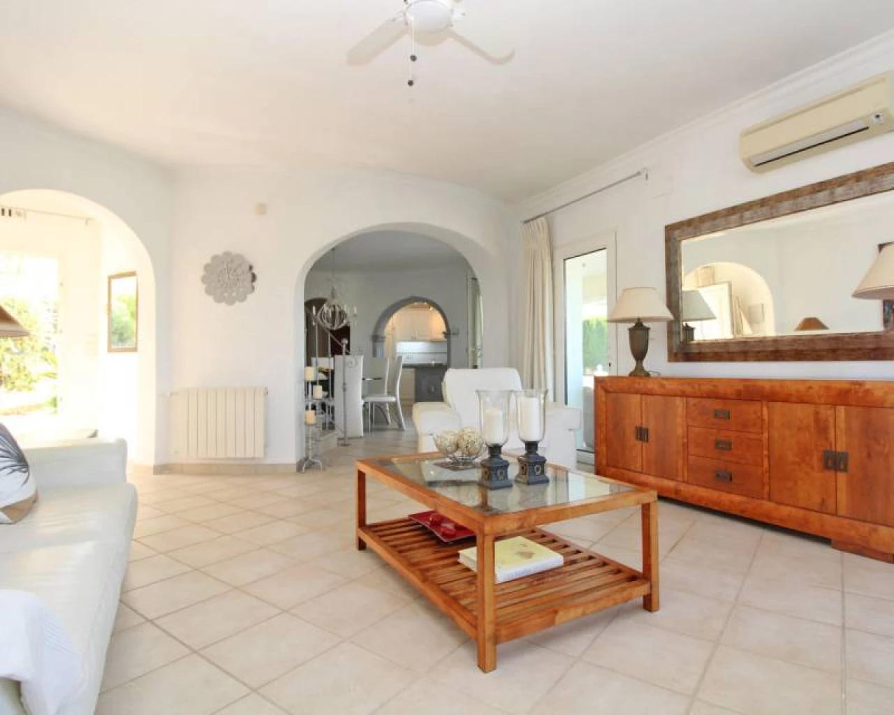Traditional villa for sale in Moraira with lovely sea views. Situated in the Paichi district which is only 5 car min away from Moraira. Moraira is an attractive, small village where you find many bars, restaurants, shops and nice beaches. This property is in a very good condition and apart from the sea views it also has beautiful views over the valley. There are 2 entrances on the plot. From the hallway you enter the spacious and bright living-dining area with direct access to the porch and the pool terrace. Also on this floor is a fully equipped open kitchen with pantry, 2 bedrooms and 2 bathrooms. The staircase leads up to the master bedroom with bathroom and own terrace. It has a separate office part, but this could easily be converted into an ample dressing area. The villa has central heating and airconditioning. The outside space offers various sitting areas and a pretty garden. Garage for one car and large storage room.