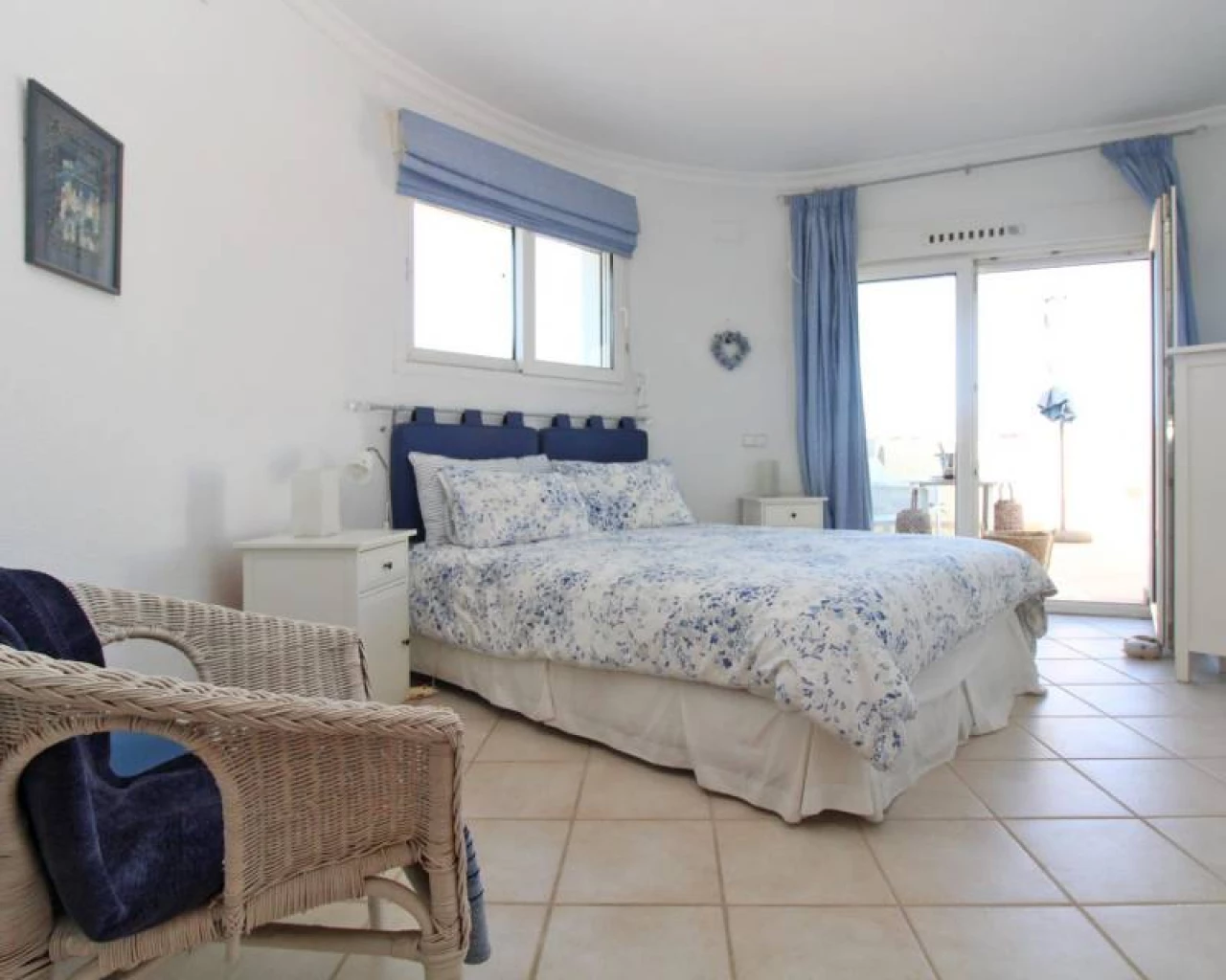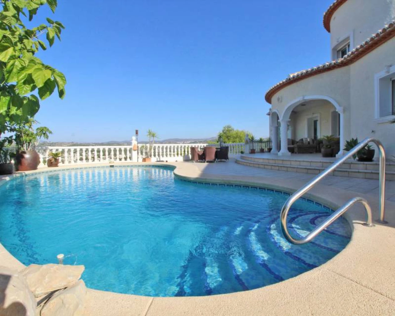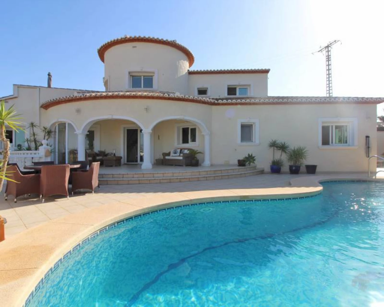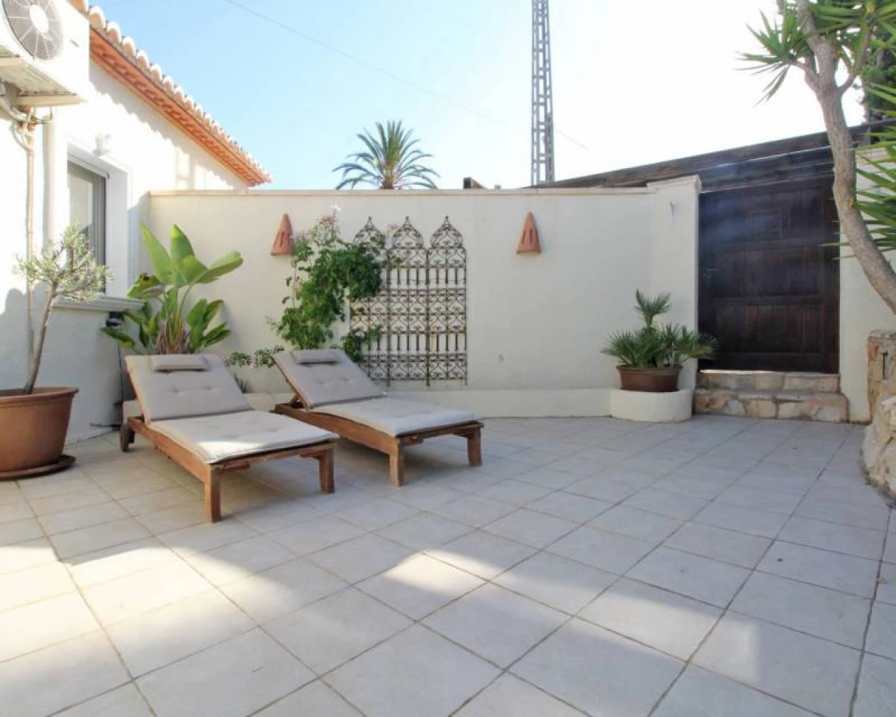 Traditional villa for sale in Moraira with lovely sea views. Situated in the Paichi district which is only 5 car min away from Moraira. Moraira is an attractive, small village where you find many bars, restaurants, shops and nice beaches. This property is in a very good condition and apart from the sea views it also has beautiful views over the valley. There are 2 entrances on the plot. From the hallway you enter the spacious and bright living-dining area with direct access to the porch and the pool terrace. Also on this floor is a fully equipped open kitchen with pantry, 2 bedrooms and 2 bathrooms. The staircase leads up to the master bedroom with bathroom and own terrace. It has a separate office part, but this could easily be converted into an ample dressing area. The villa has central heating and airconditioning. The outside space offers various sitting areas and a pretty garden. Garage for one car and large storage room.