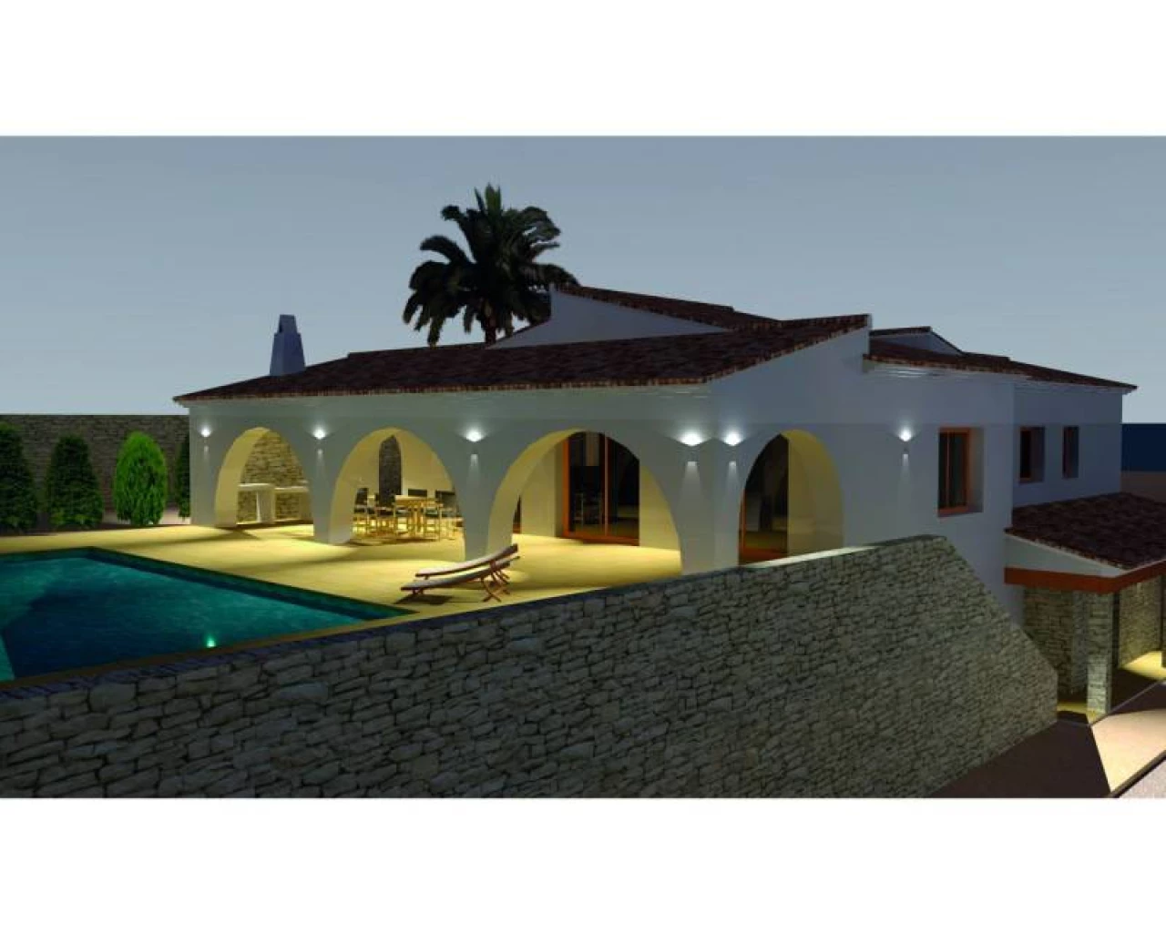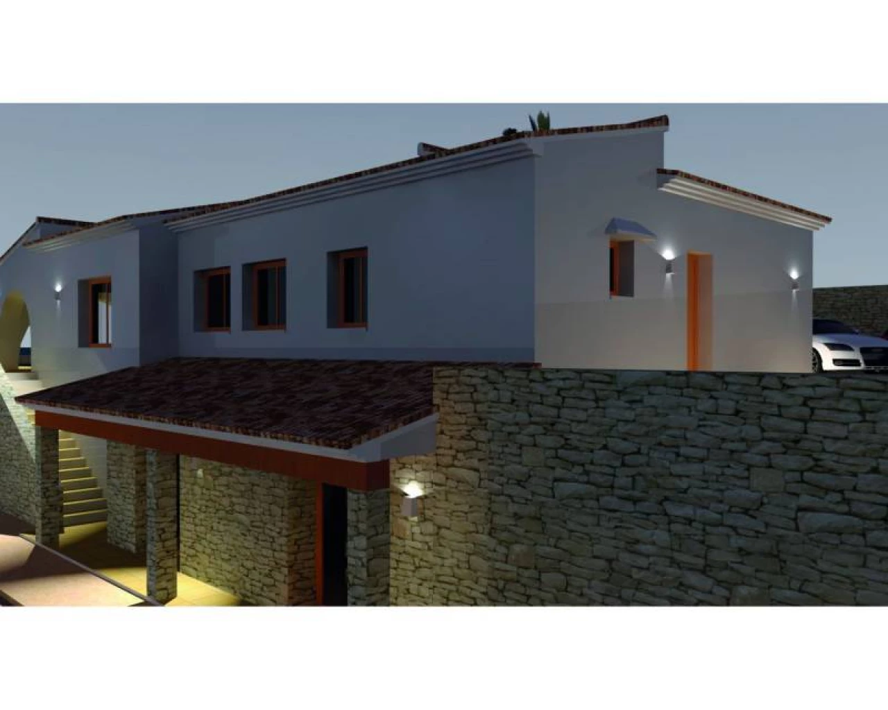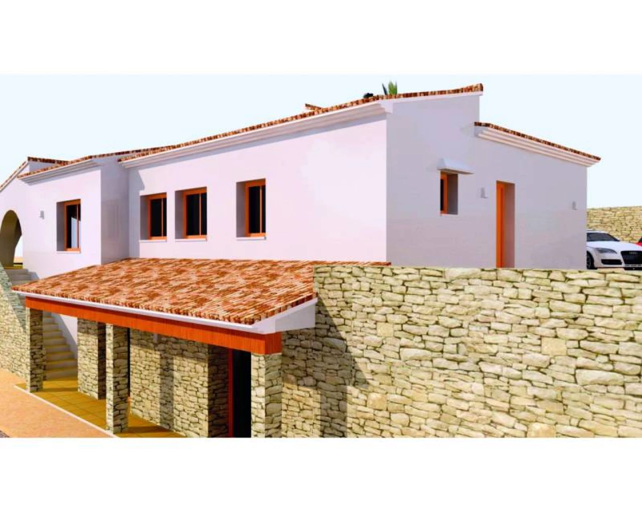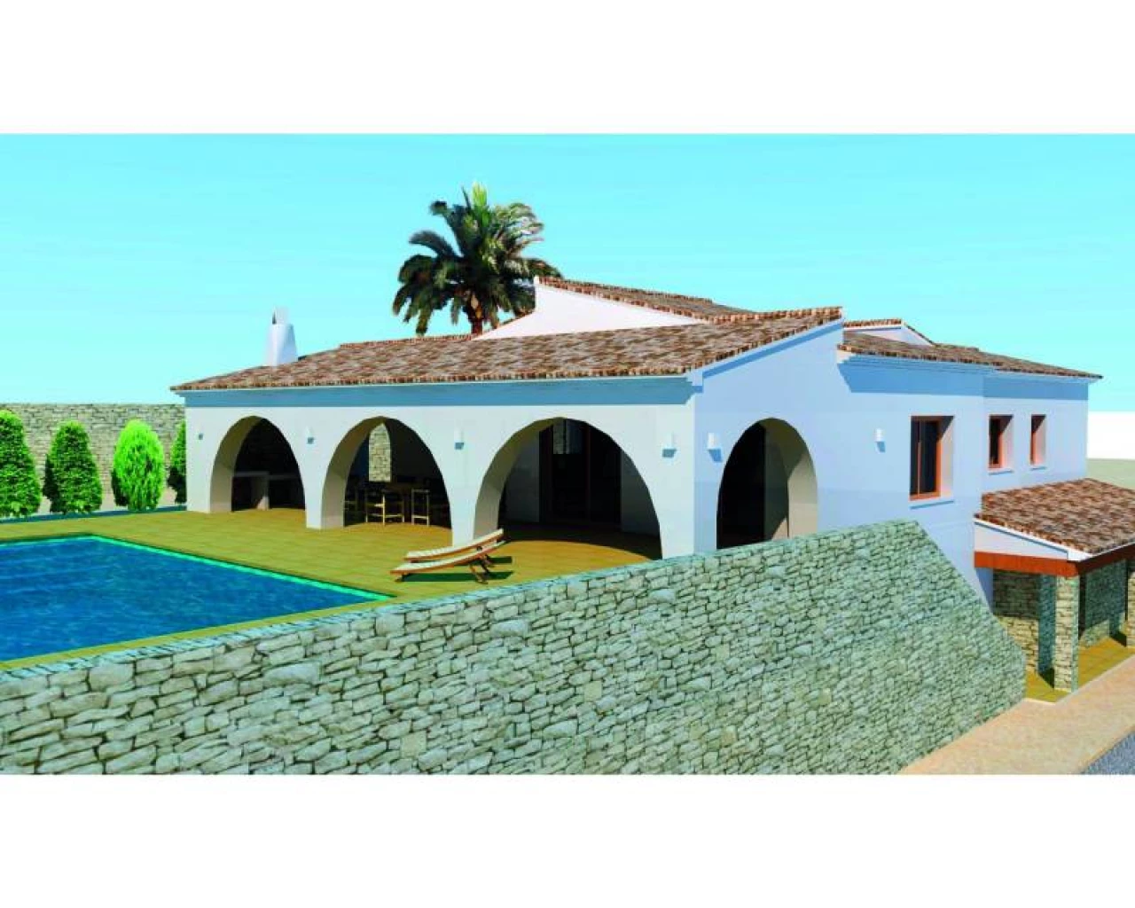 Project of a rustic style finca to be built on a fantastic plot situated on just 4 kilometers from the centre of Moraira, offering panoramic views over the valley towards the sea. On the main floor; entrance hall with access to laundry, double bedroom with en-suite, guest toilet and entrance to the open plan living / dining / equipped kitchen. From the living / dining area you'll have access to the large naya, pool and ample pool terrace. From the hall, stairs lead down to the lower level with 3 double bedrooms and 3 bathrooms (of which 2 en-suite). Two of the bedrooms have french doors opening towards the garden. Contact our office for more information.