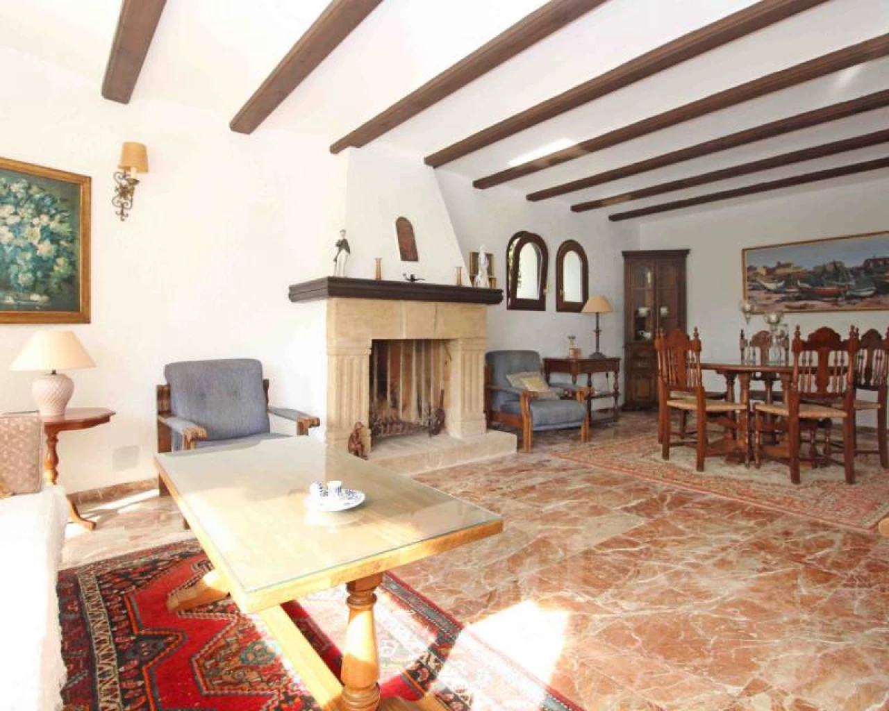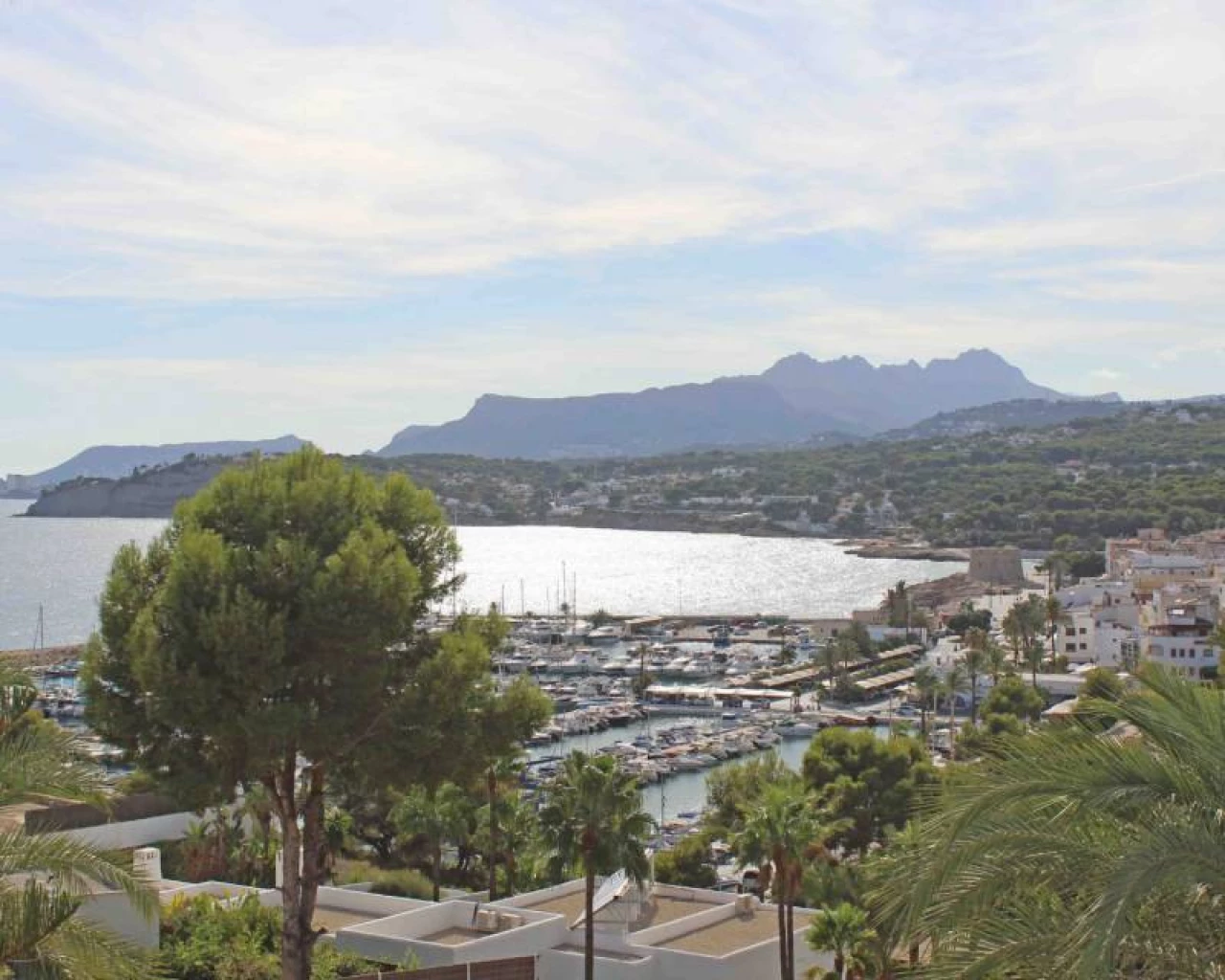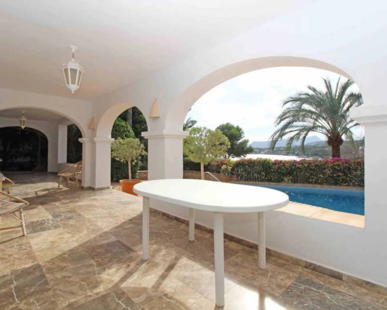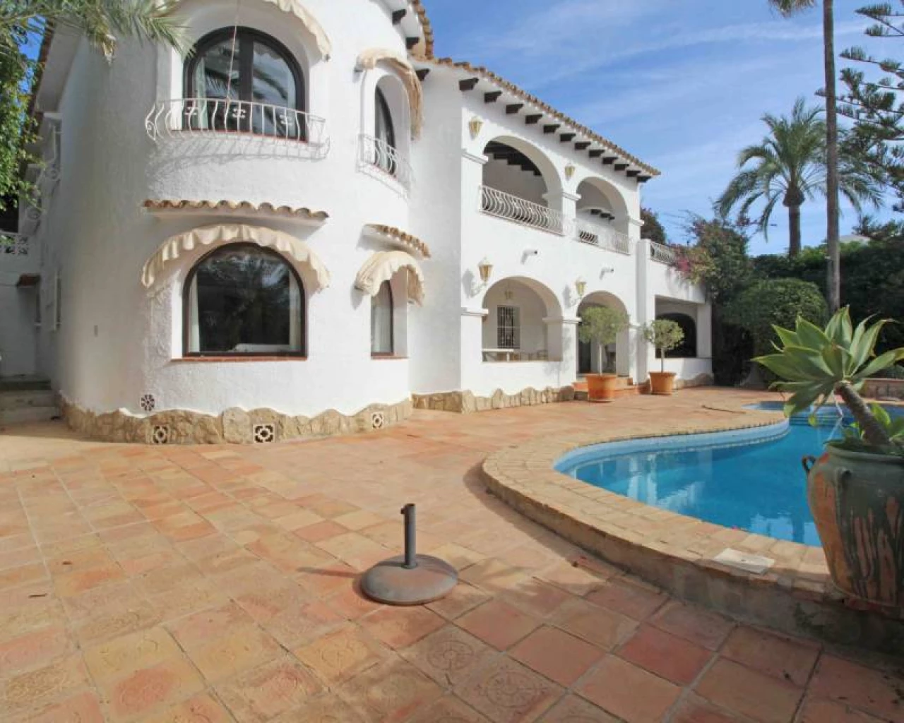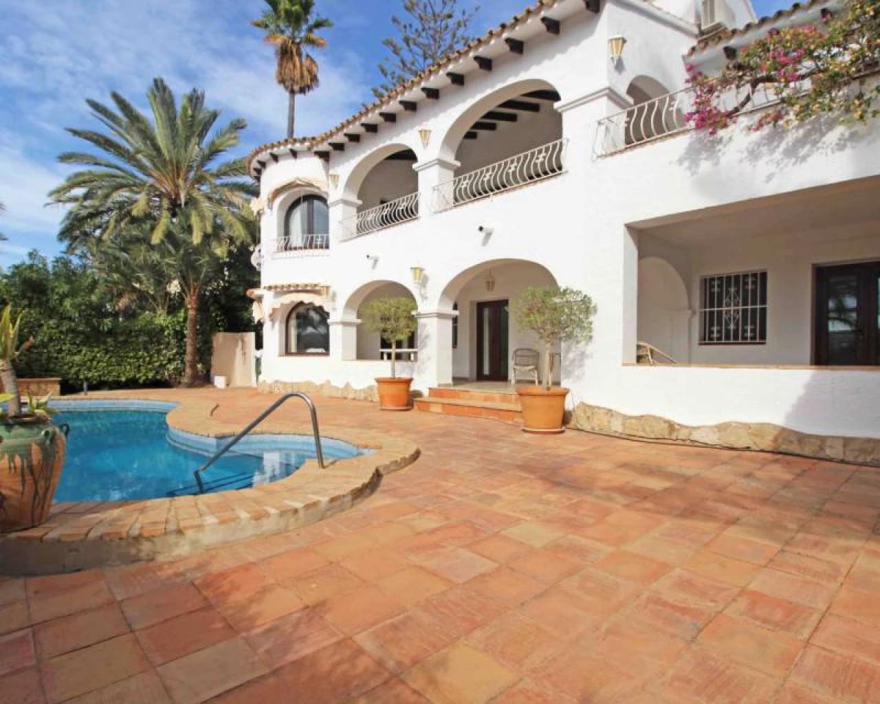 Traditional villa for sale with fantastic sea views in El Portet, Moraira. What a location! Panoramic sea views and lovely views of Moraira's marina. This villa for sale in El Portet can definitely be called generous. There are 3 floors. On the top floor we find a small living room with kitchenette and fireplace and a bedroom en-suite. Here also a terrace with barbecue. The middle level is more spacious. It has a lounge with fireplace, a dining room, kitchen and 3 bedrooms en-suite. There is a partially covered terrace. The lowest level is at pool level and consists of a living-dining room, kitchen, laundry room, storage room, toilet and a large covered terrace. Around the kidney-shaped swimming pool is a spacious sun terrace. All rooms have central heating and the bedrooms have air conditioning. Alarm system, 2 car ports (one with electric garage door) and extra storage space. In the mature garden, decorative palm trees give a Mediterranean atmosphere. Also here a barbecue and summer kitchen. A unique villa in a unique location!