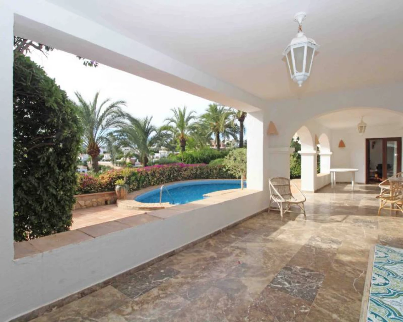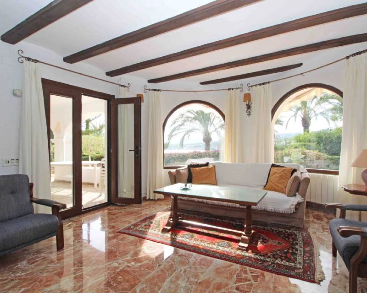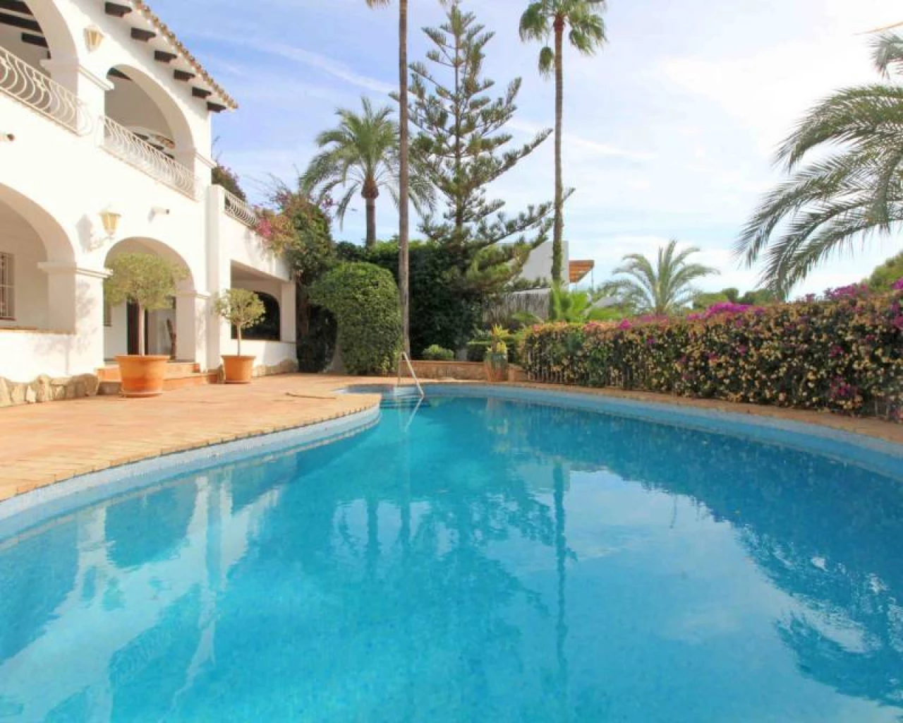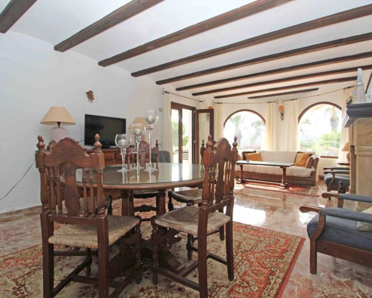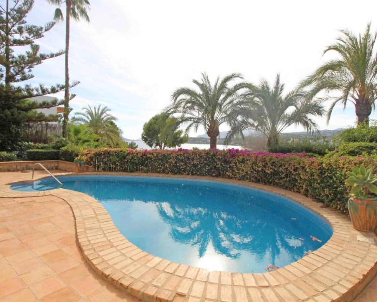 Traditional villa for sale with fantastic sea views in El Portet, Moraira. What a location! Panoramic sea views and lovely views of Moraira's marina. This villa for sale in El Portet can definitely be called generous. There are 3 floors. On the top floor we find a small living room with kitchenette and fireplace and a bedroom en-suite. Here also a terrace with barbecue. The middle level is more spacious. It has a lounge with fireplace, a dining room, kitchen and 3 bedrooms en-suite. There is a partially covered terrace. The lowest level is at pool level and consists of a living-dining room, kitchen, laundry room, storage room, toilet and a large covered terrace. Around the kidney-shaped swimming pool is a spacious sun terrace. All rooms have central heating and the bedrooms have air conditioning. Alarm system, 2 car ports (one with electric garage door) and extra storage space. In the mature garden, decorative palm trees give a Mediterranean atmosphere. Also here a barbecue and summer kitchen. A unique villa in a unique location!