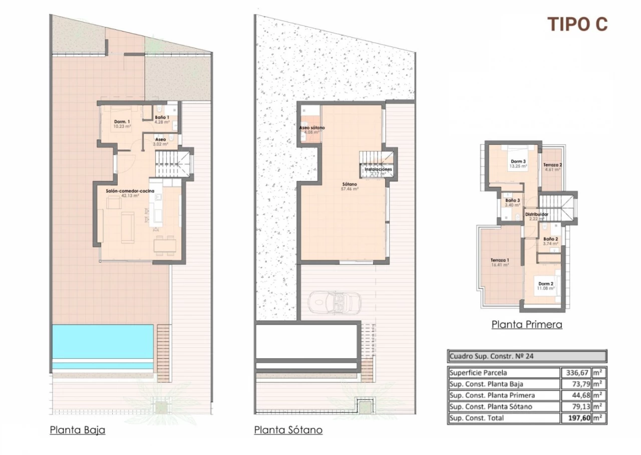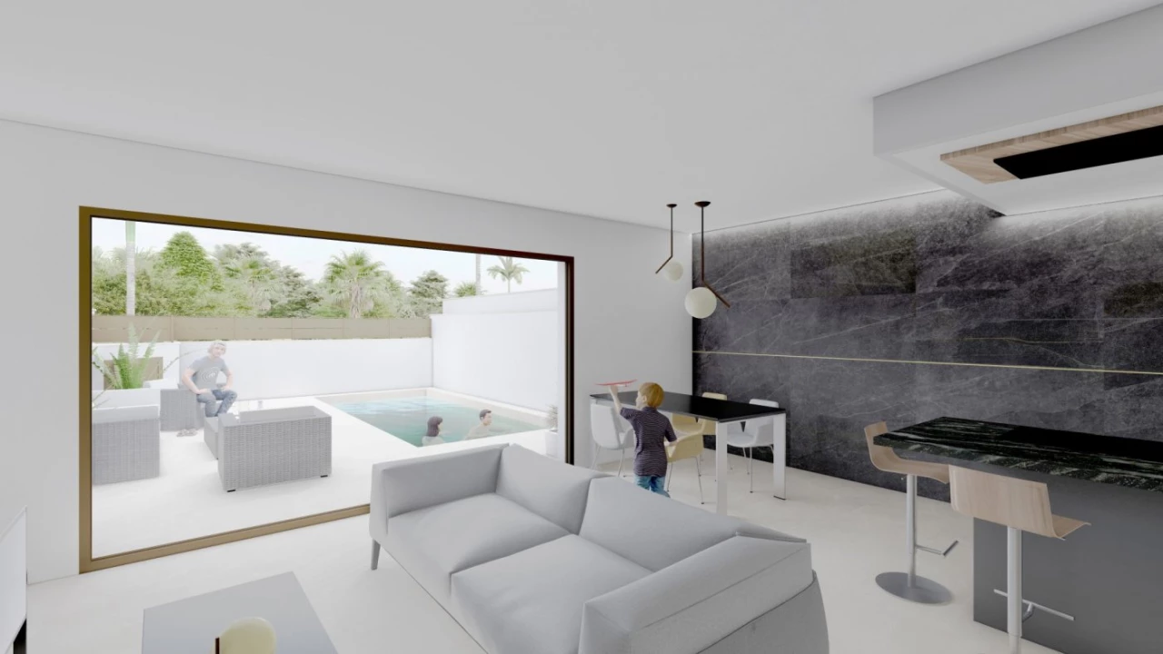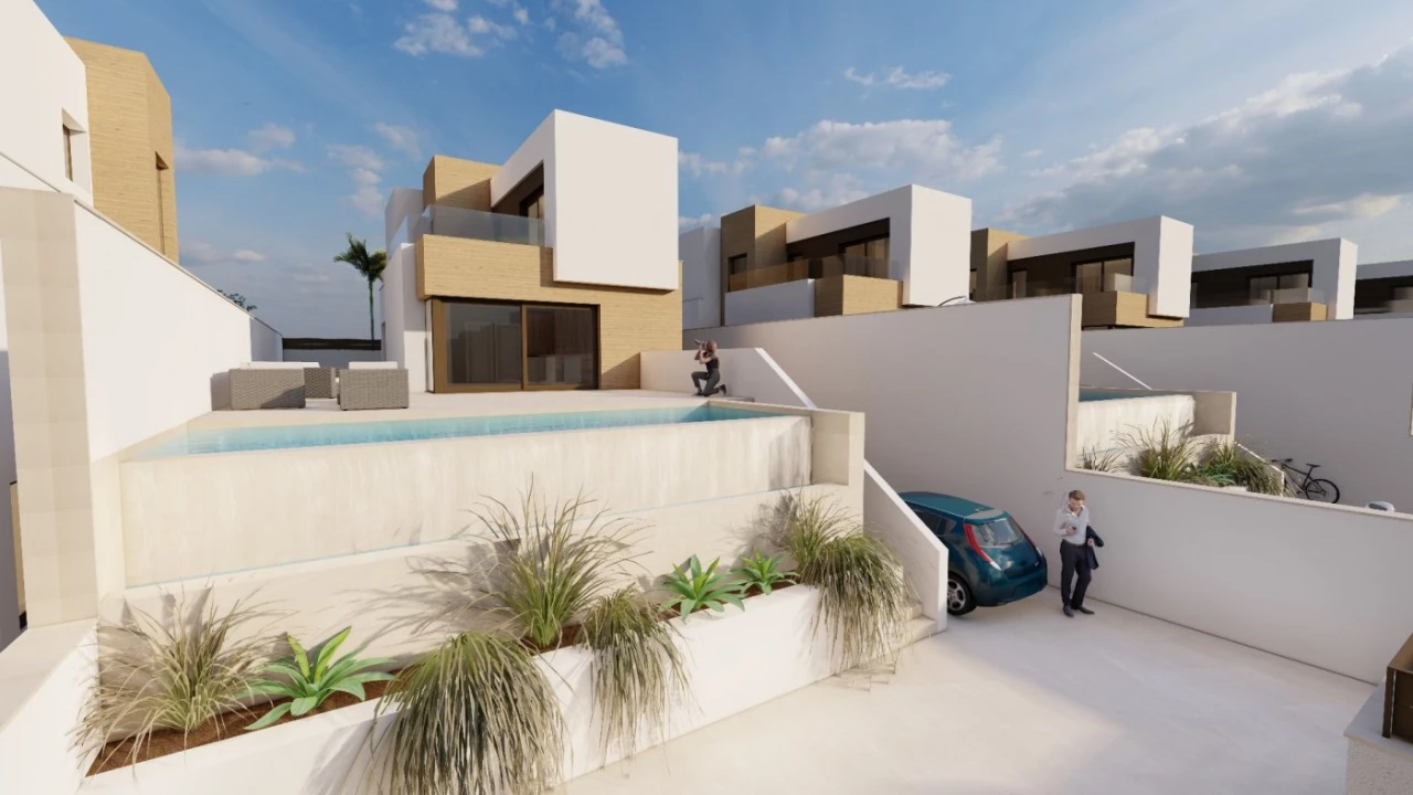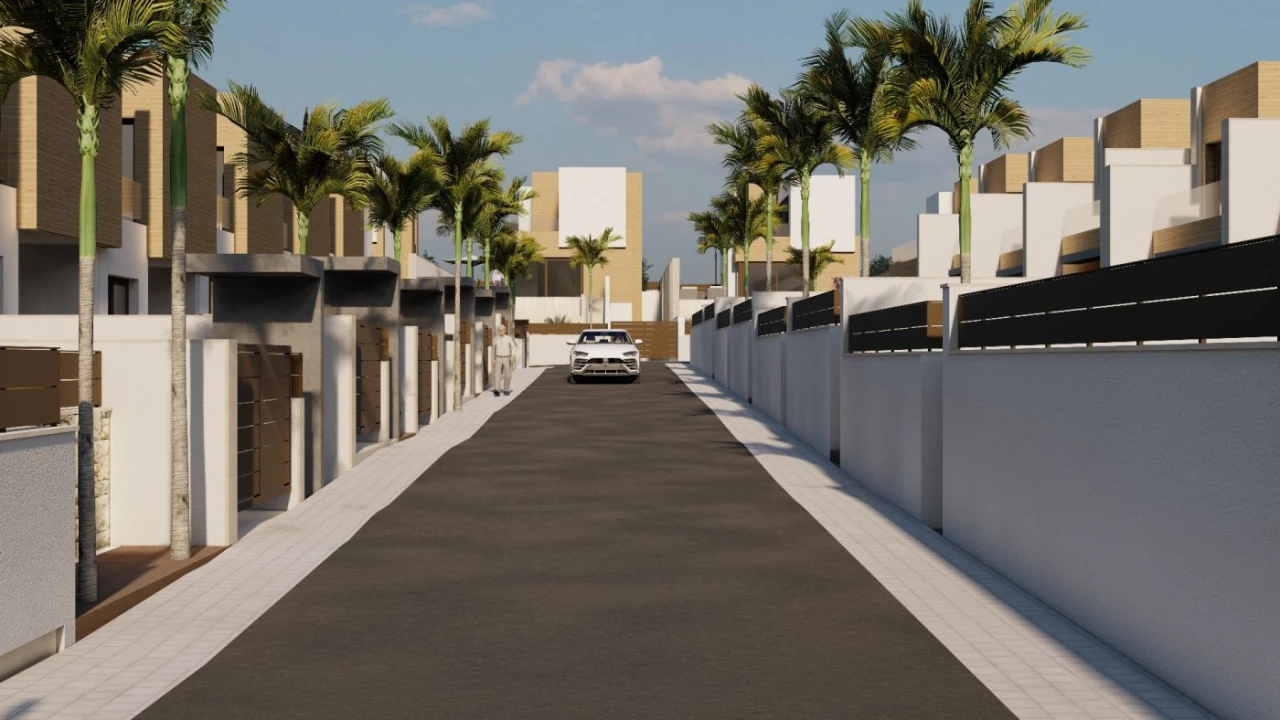 NEW BUILD RESIDENTIAL COMPLEX IN ALGORFA New Build complex of 14 townhouses, 2 semi-detached villas and 7 independent villas in La Finca Golf course, Algorfa. All properties equipped with finished basement, air conditioning, fully fitted kitchen with electrical appliances, fully equipped bathrooms, interior and exterior lights, fitted wardrobes, electric blinds, thermo regulation system, hot water by aerotermia, private garden with swimming pool and parking space. The properties consists of 3 bedrooms, 4 bathrooms, guest toilet, open plan kitchen with the living room, English patio in the basement, 2 terraces on the first floor. Vehicle access into the plot is through a motorized gate with remote control. Private pool equipped with: • Heat pump and underwater lighting • Outdoor shower • High-resistance tile coating Residential complex located in La Finca Golf resort, in the municipality of Algorfa, in the Vega Baja area of the Costa Blanca South. Only 15 minutes drive from the sandy beaches of Guardamar del Segura, and only 35 minutes from Alicante airport. The larger towns of Almoradi, Benijófar and Ciudad Quesada are a short drive away. Torrevieja and Orihuela Costa, with their large shopping centres, are 15 minutes away.